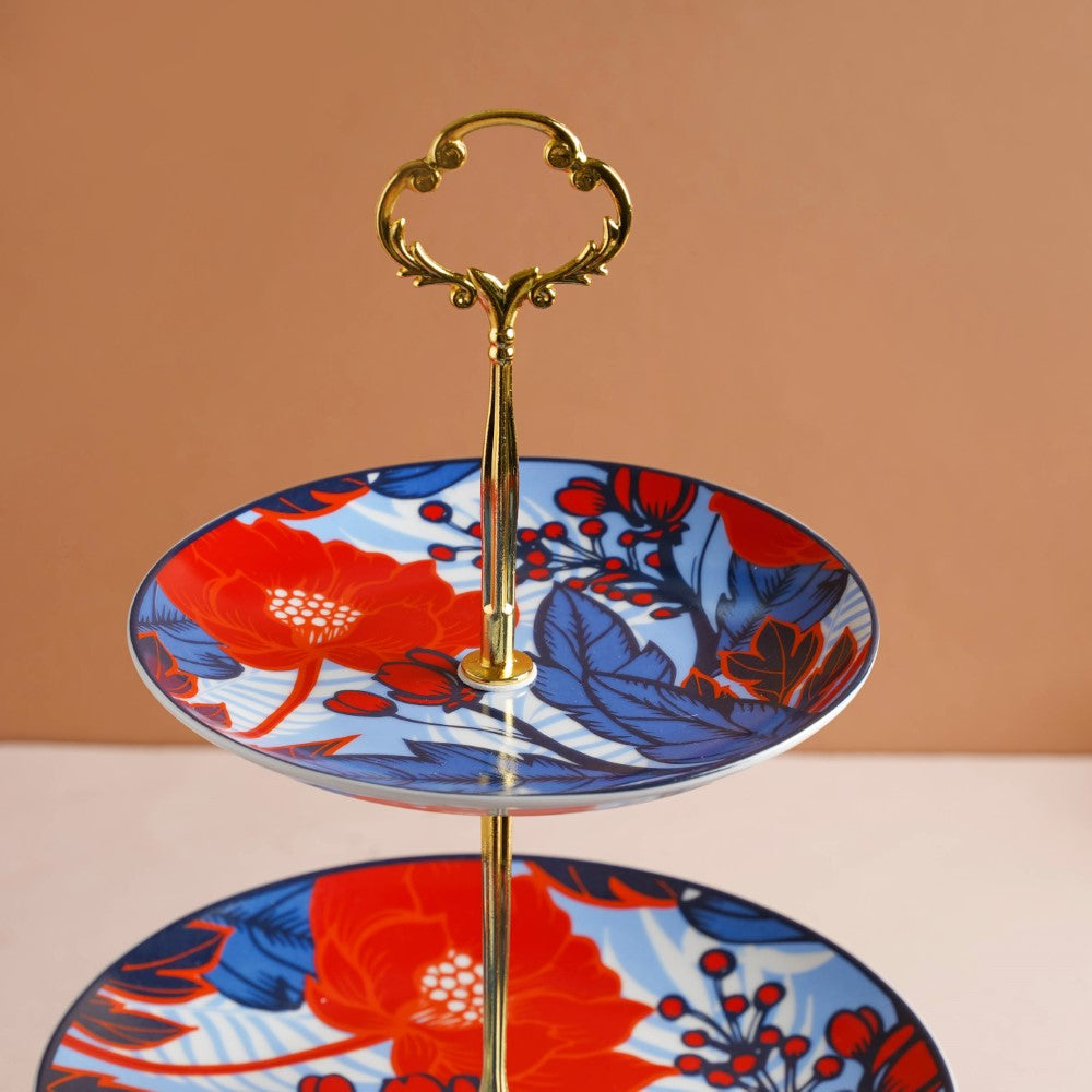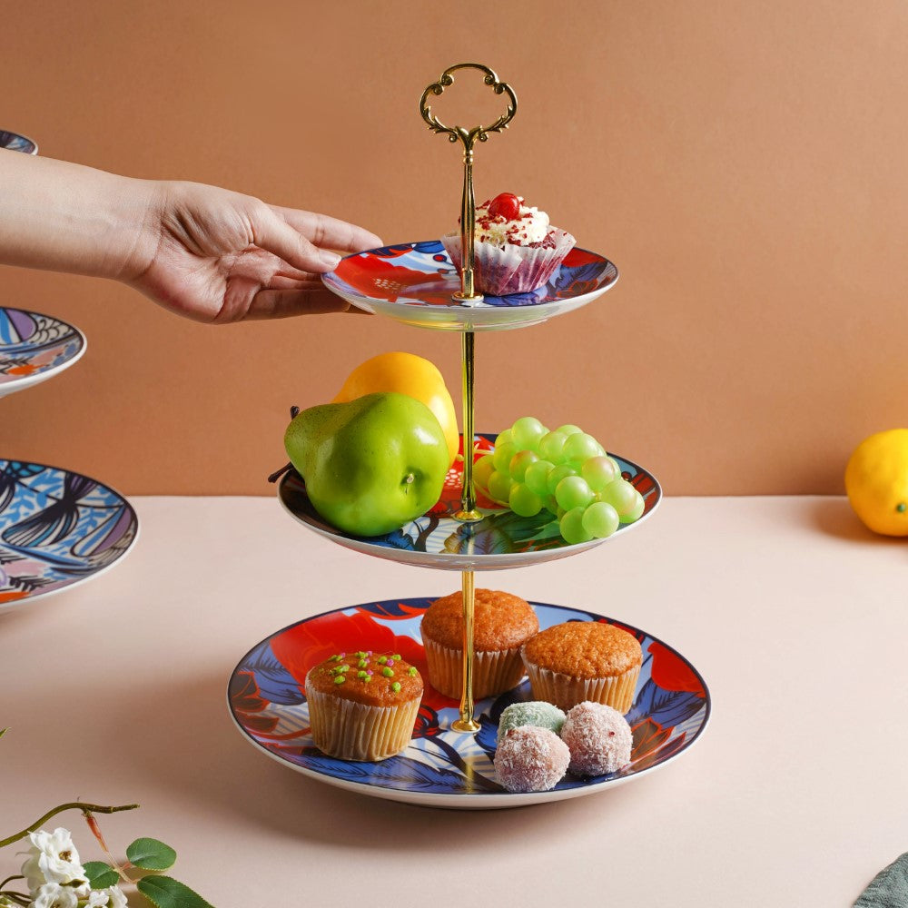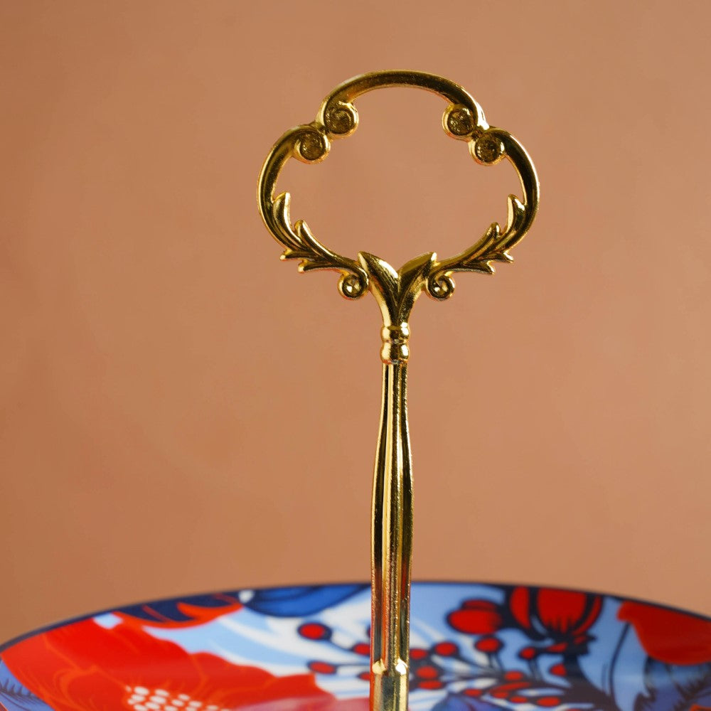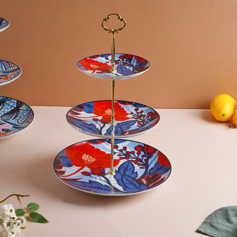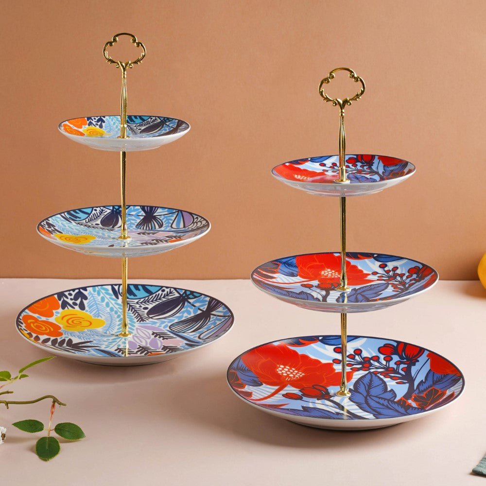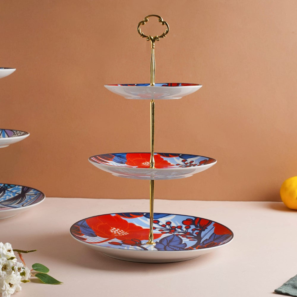 Serve cakes and desserts with extravagance on the colourful ceramic cake stand. Printed with bright flowers and abstract patterns, topped cupcakes and freshly chopped fruits with look stunning on the dessert stand. The stand comprises 3 distinctive sized plates and metal fittings to arrange the cake stand. The decoratively topped handle of the dessert stand adds a touch of opulence to the setup.