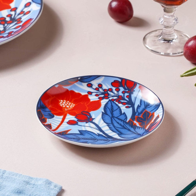 Savour delicious desserts and snacks on the ceramic small plate. Adorned with poppy blooms and buds, the ceramic plate for desserts is like sunshine on a plate. The printed pattern on the high-quality ceramic plate ensures that the semi-matte finishing of the plate also remains intact. Serve creme brulee, cheesecake, baklava, apple pie, kulfi, or cassata ice cream on the ceramic dessert plate.