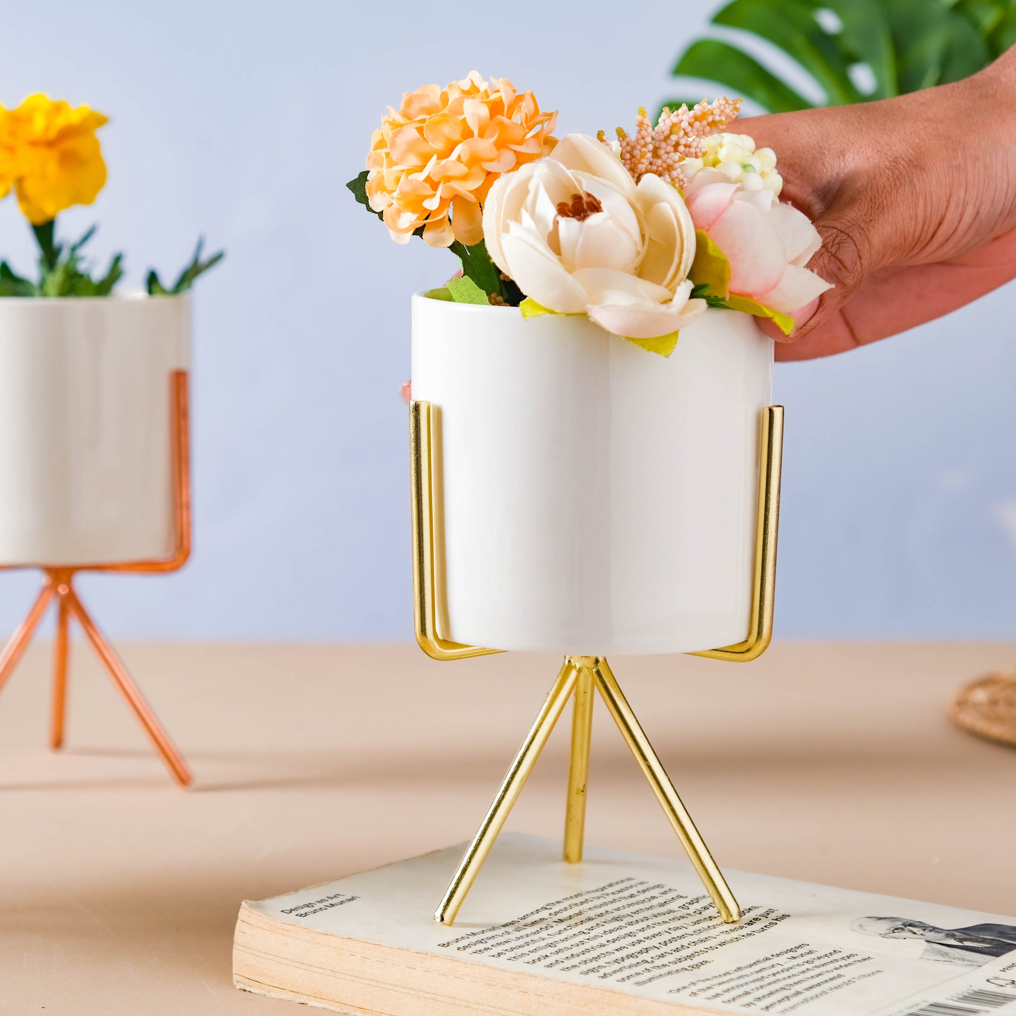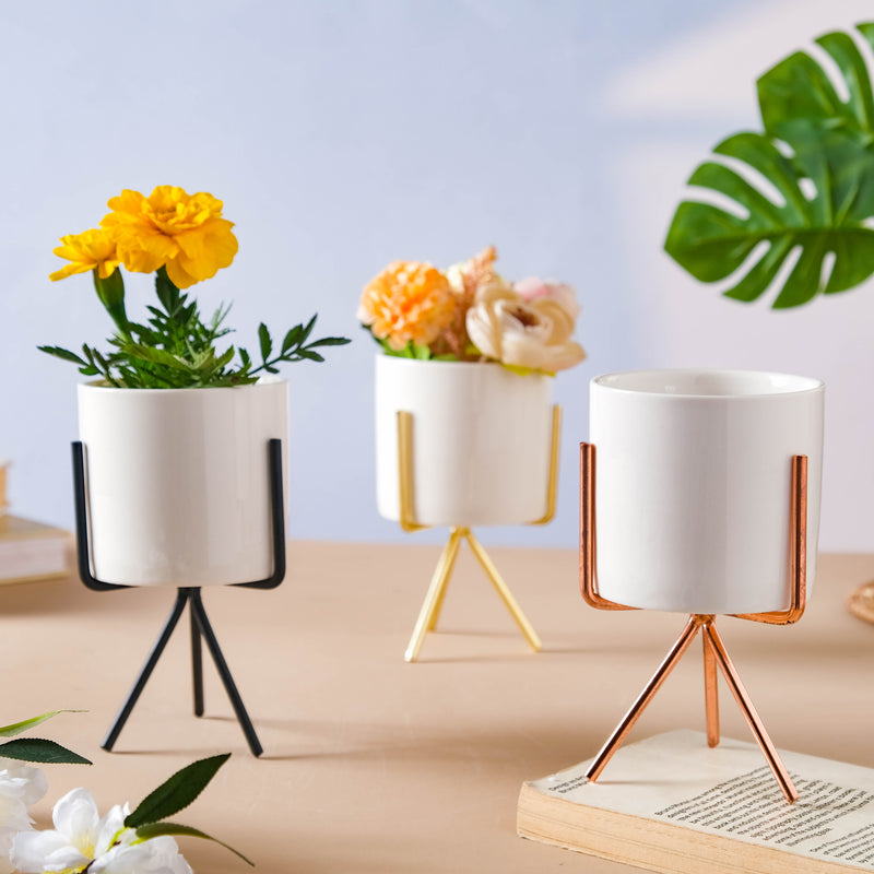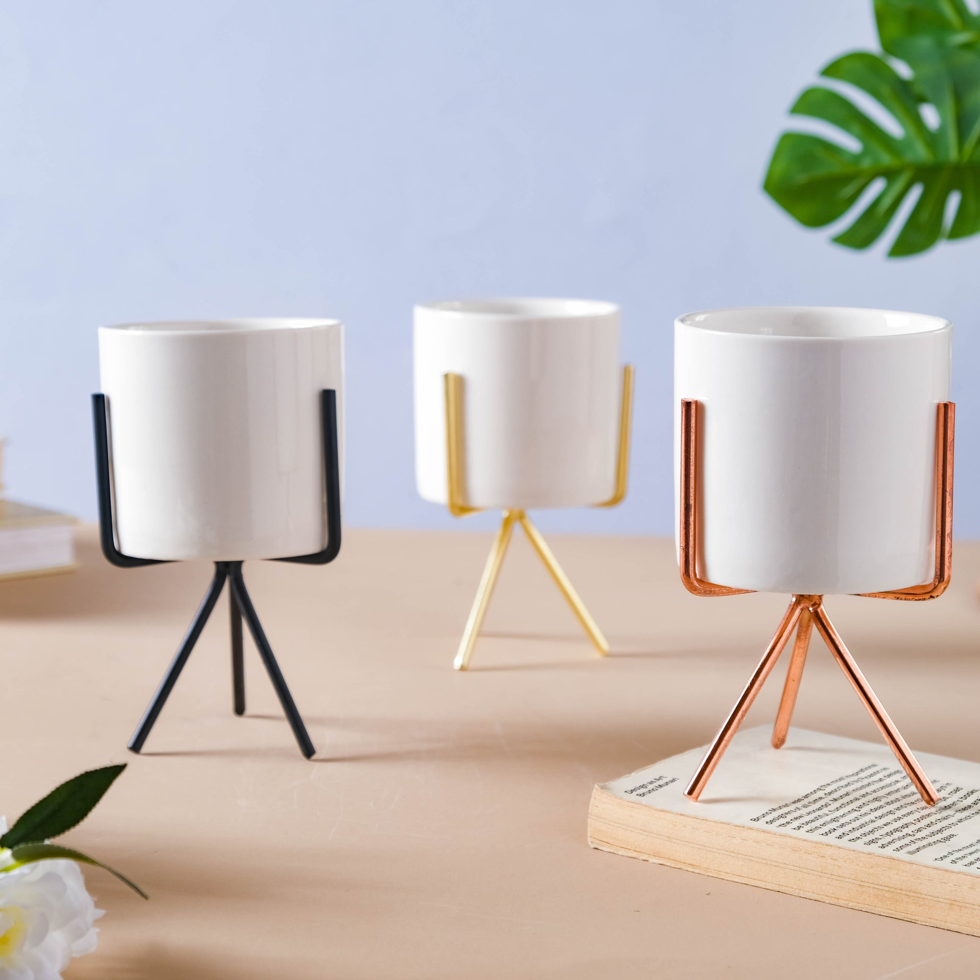 The modern and simple-looking ceramic planter with a shiny and elegant exterior comes with a three-legged metal stand that can be gathered easily. The planter is available in three color variants and the cylindrical shape makes it suitable for adding any real or artificial plants and succulents in it.