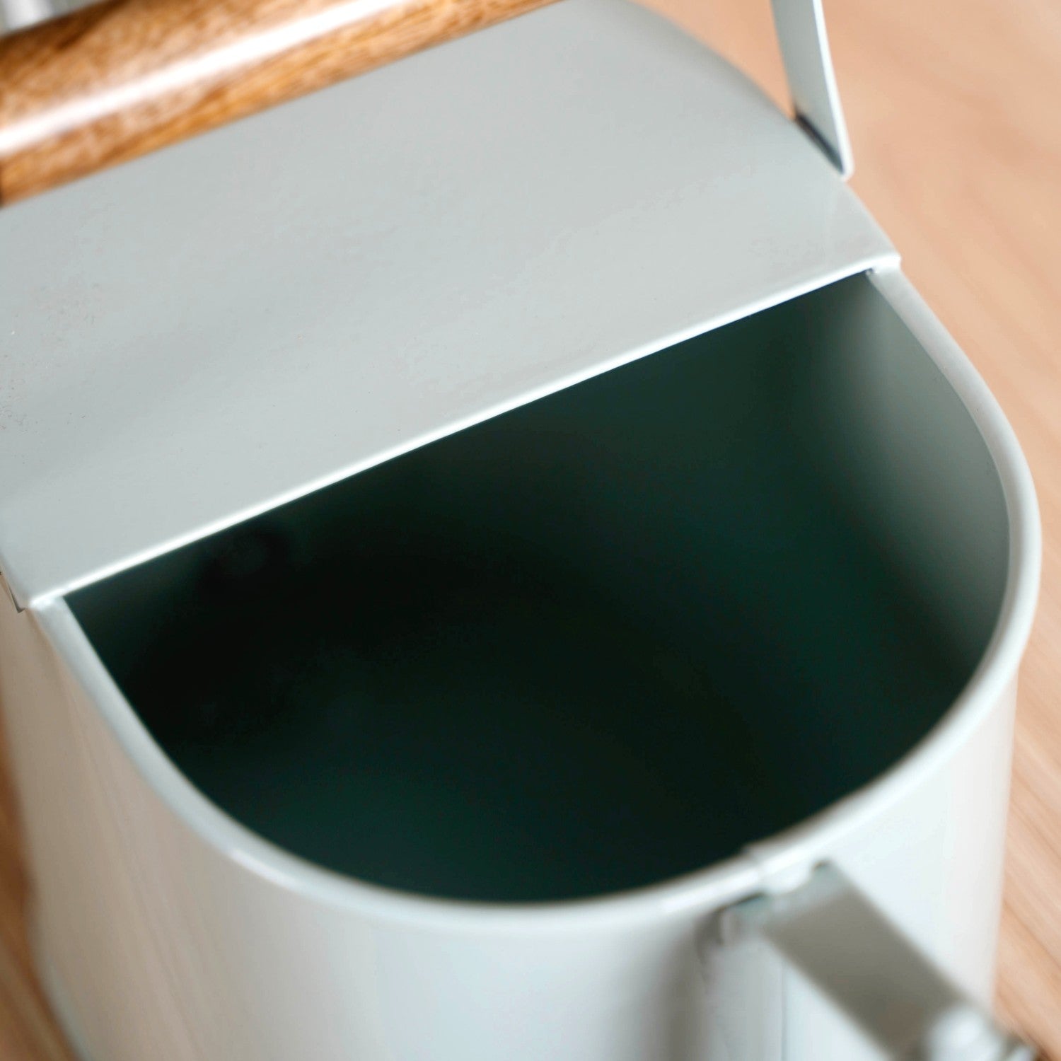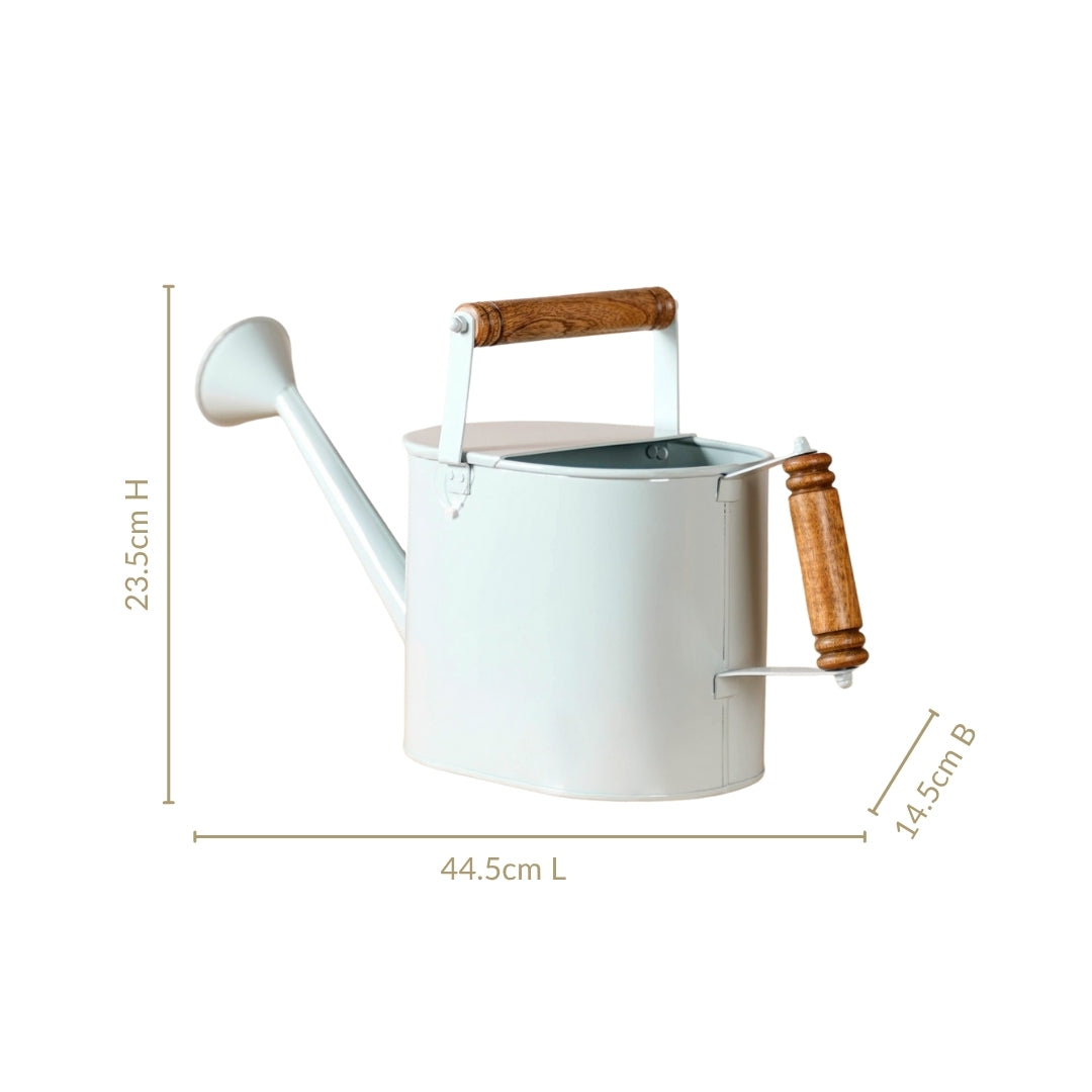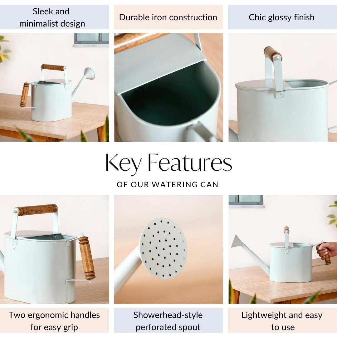 Design: This watering can features a contemporary silhouette in a soothing meadow mist bluish-green hue. Crafted from durable iron with a glossy finish, it balances strength and style. The wide top opening allows easy refilling, while the perforated spout ensures an even, gentle flow. Dual ergonomic handles, one on top and one at the side, are detailed with smooth mango wood, adding warmth and comfort to the modern form.