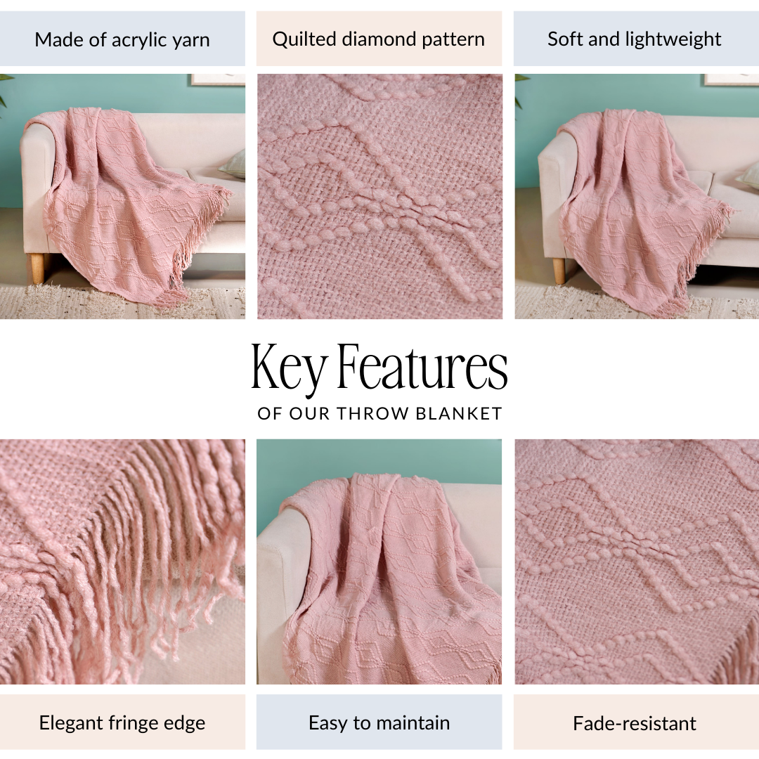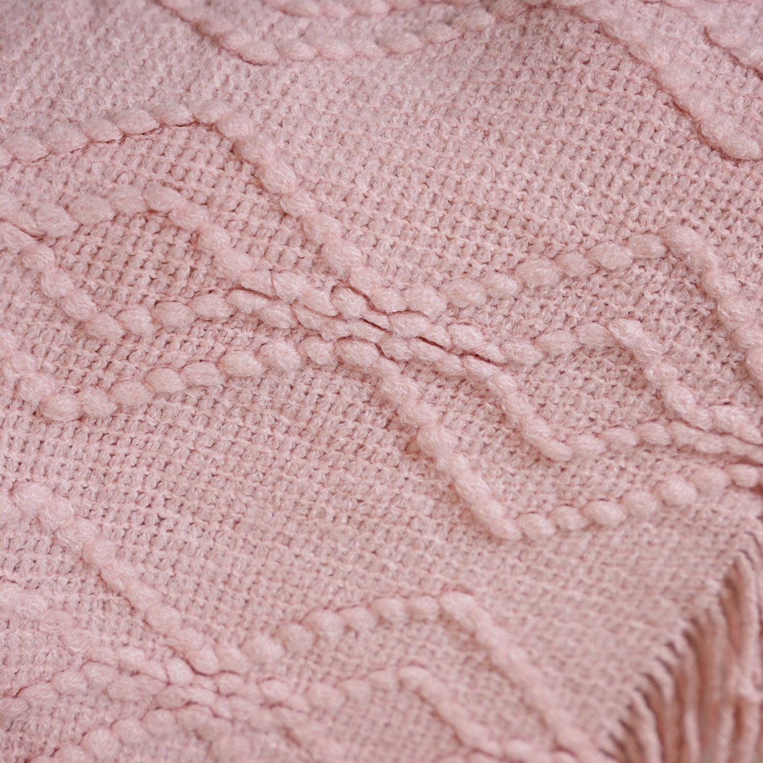 Design: Woven from soft acrylic yarn, this blush pink throw features a refined diamond pattern created on a flat, textured base. The structured geometric weave adds depth and visual interest, while the delicately finished fringed edges lend a relaxed, handcrafted touch that complements sofas, beds, and lounge chairs.