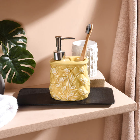 Ensure the best bathroom organization with a touch of sophistication with our ceramic bathroom accessories set. This exquisite bathroom set seamlessly blends style and functionality, enhancing the ambiance of your bathroom. Crafted from durable ceramic, the set comprises a refillable soap dispenser with a convenient pump nozzle, a chic ceramic tumbler, and a toothbrush holder intelligently designed for optimal organization. The set's smooth matte finish, pebbled texture, and speckled design add a touch of elegance to any bathroom decor. Each piece is expertly crafted for longevity and easy maintenance.