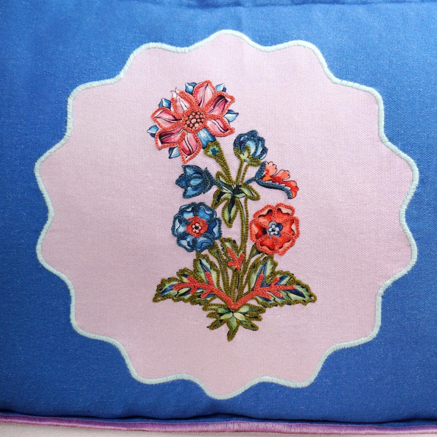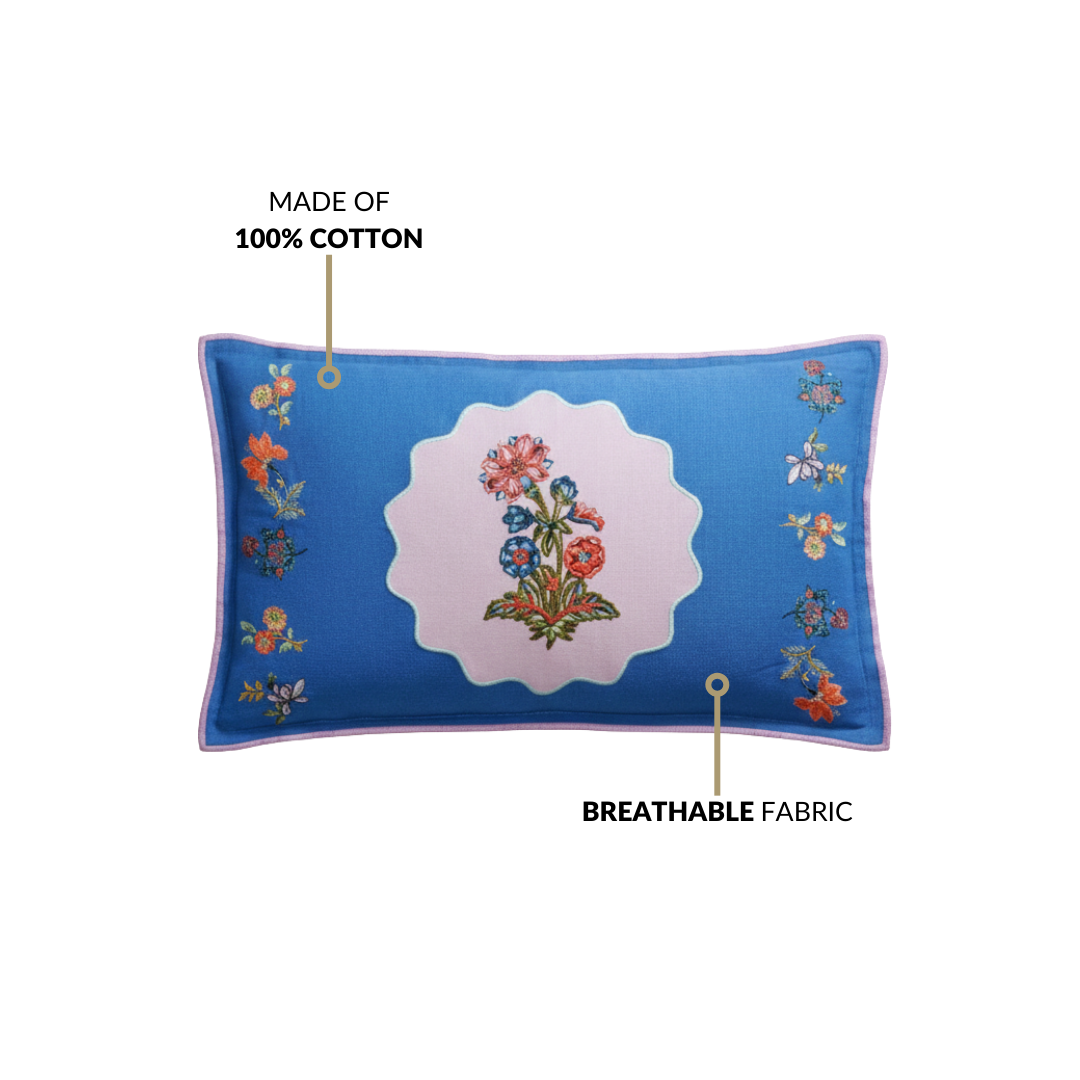 Design: Crafted from pure cotton, this rectangular cushion cover features multicolour floral embroidery on a calming blue base. Pink borders frame the design, while a concealed zipper and plain white cotton back keep the finish neat. Soft texture and durable stitching make it lightweight and easy to use.
