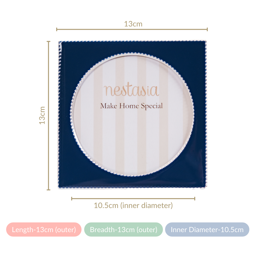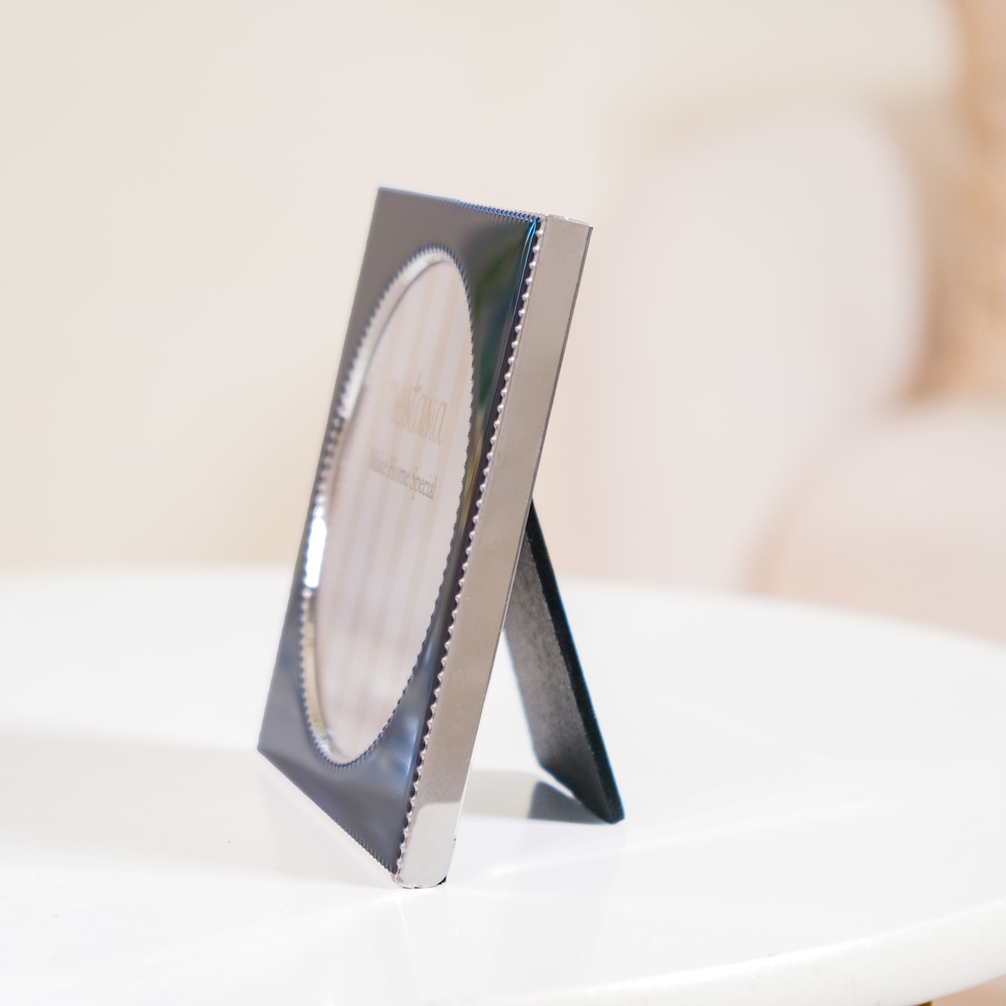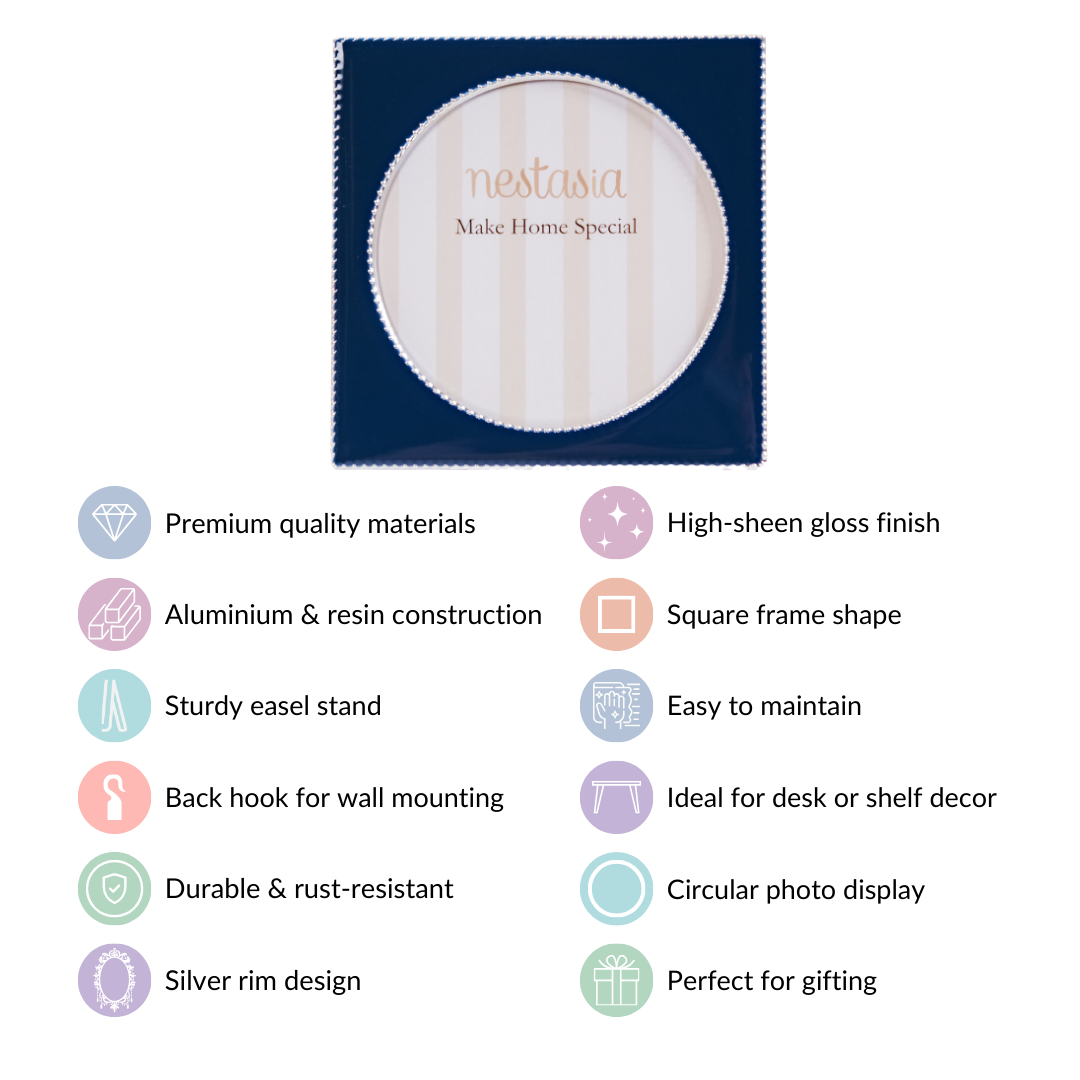 This photo frame makes an ideal gift choice for several reasons. First, its premium quality materials, including aluminium and resin construction, ensure durability and longevity, making it a thoughtful and lasting gift. The combination of a sturdy easel stand and back hook for wall mounting offers versatile display options, accommodating various preferences and home decor styles. Its durable and rust-resistant design guarantees that it will maintain its elegance over time. The high-sheen gloss finish and silver rim design add a touch of sophistication to any space. The square frame shape with a circular photo display offers a unique and eye-catching way to showcase cherished memories.