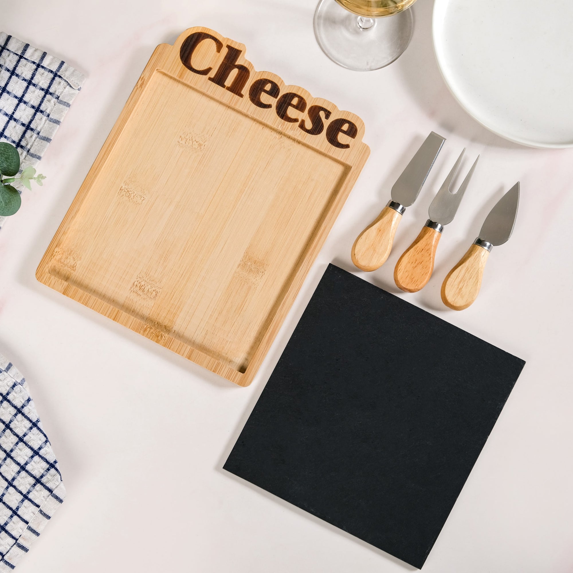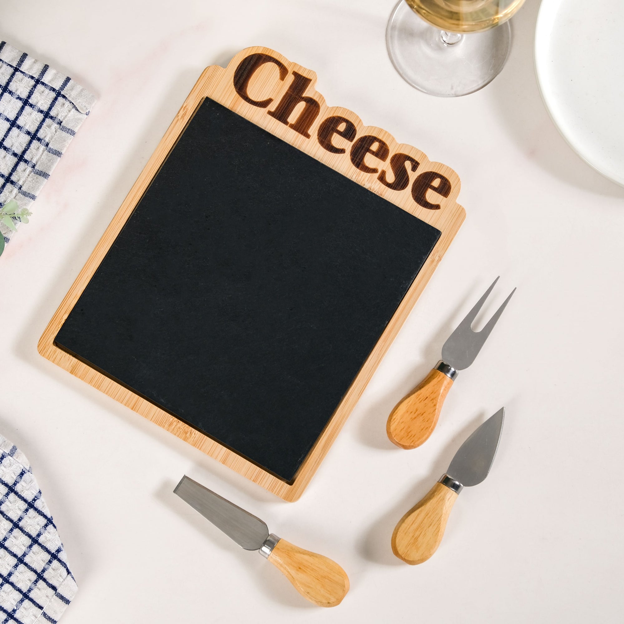 Design: This set features a beautiful juxtaposition of premium slate and natural bamboo wood, creating a chic and versatile serving platter. The design includes a removable slate serving tile within the organic bamboo frame. The cheese board has "Cheese" written on its top, which gives it a playful look. It comes complete with a set of three stainless steel cheese knives and a fork, each fitted with a matching natural wood handle, ensuring you have the right tools for every type of cheese.