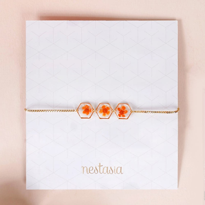 Prepare to be enamoured of our gorgeous floral bracelet for women - a still-life work of art that captures the timeless beauty of nature's prolific blossoms. Carefully pressed and eternally preserved, the bracelet features delicate yet fiery orange Tangerine Gem Signet Marigold (Tagetes tenuifolia) blooms captured in transparent honeycomb-shaped casings and an adjustable golden chain with tassels. Rightly named the "Herb of the Sun," marigolds symbolise passion, creativity, and growth, making this bracelet a great find for yourself and loved ones alike. The clear case allows the vibrancy of the flowers to shine through so that you can flaunt a pretty pop of colour on your wrist.
