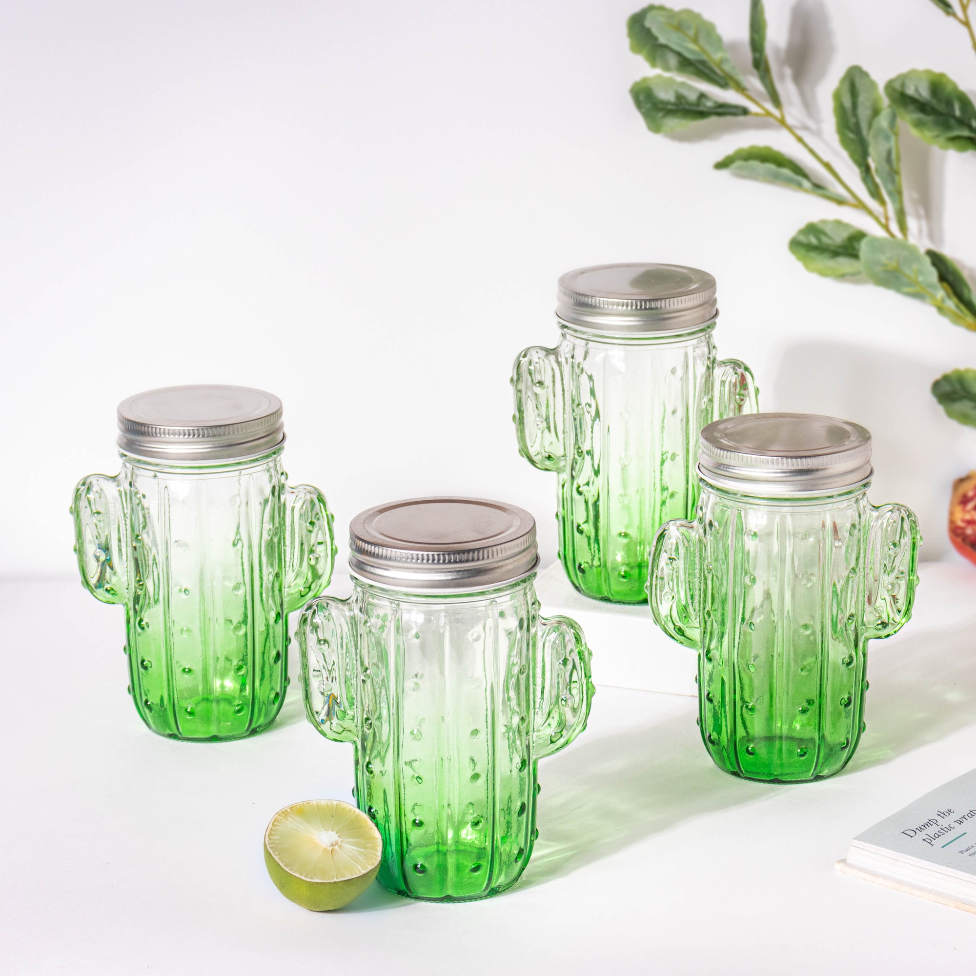 The glass tumblers are perfect for sipping one's favorite beverages. The tumbler set of 4 has a fun cactus shape and a vibrant green color, making the glassware a must-have if one wants to enjoy their smoothie with style. The tumblers are extremely utilitarian and have a screw-on lid which eliminates any chances of the beverage spilling while the textured handles provide ease in carrying the glass on the go. Whether one is drinking coffee, tea, or juice, the tumblers made of high-quality glass are leak-proof and excellent for usage in the home, as well as for serving beverages at parties.