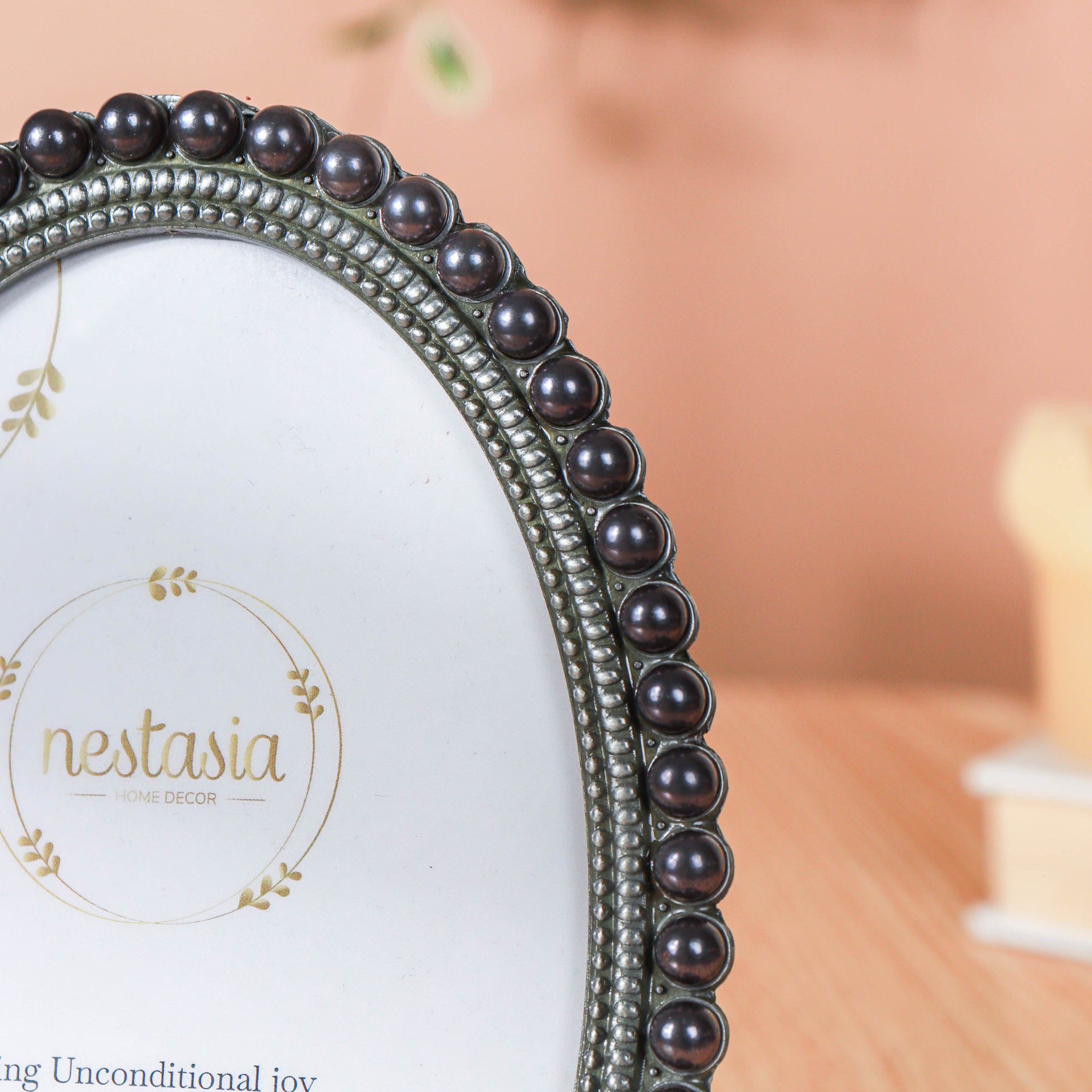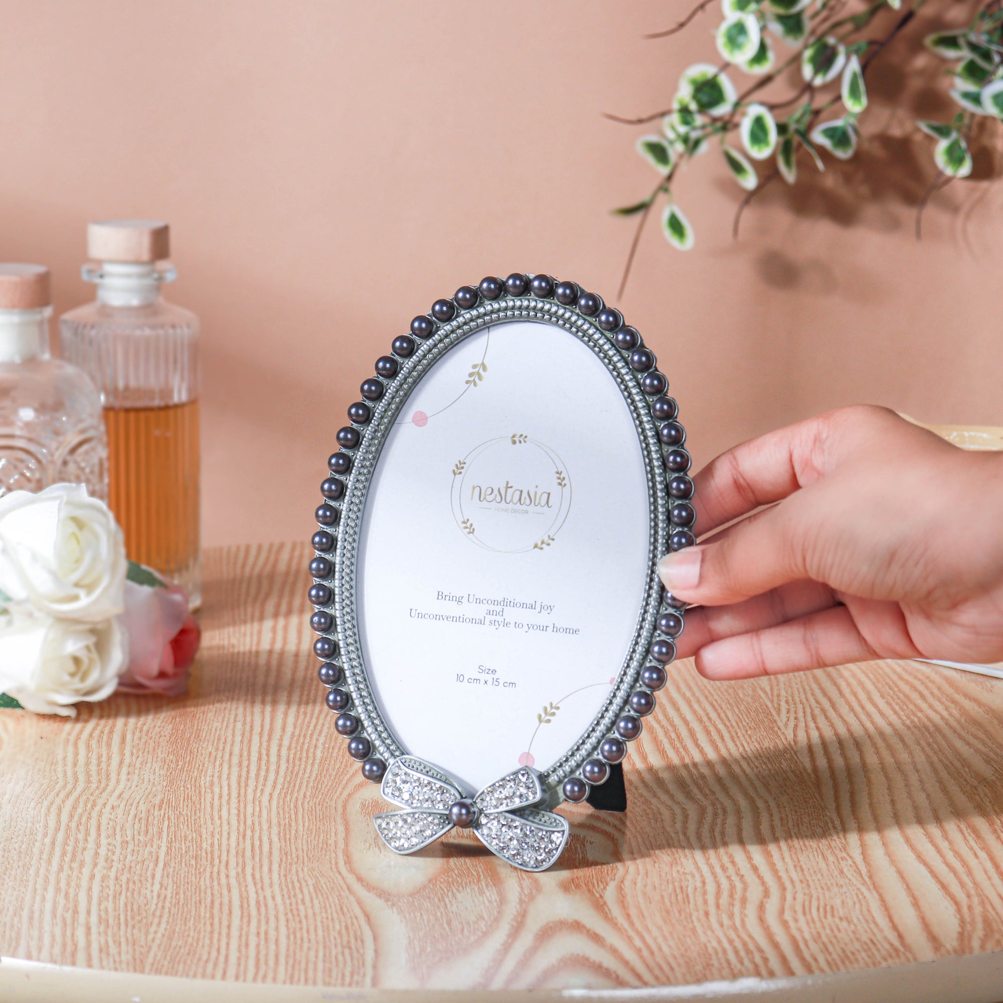 Minimal in appearance and durable in stricture - the photo frame can fit well with any room decor setting. The picture frame has a glittery bow at the uppermost end and black beads encircling the edge.