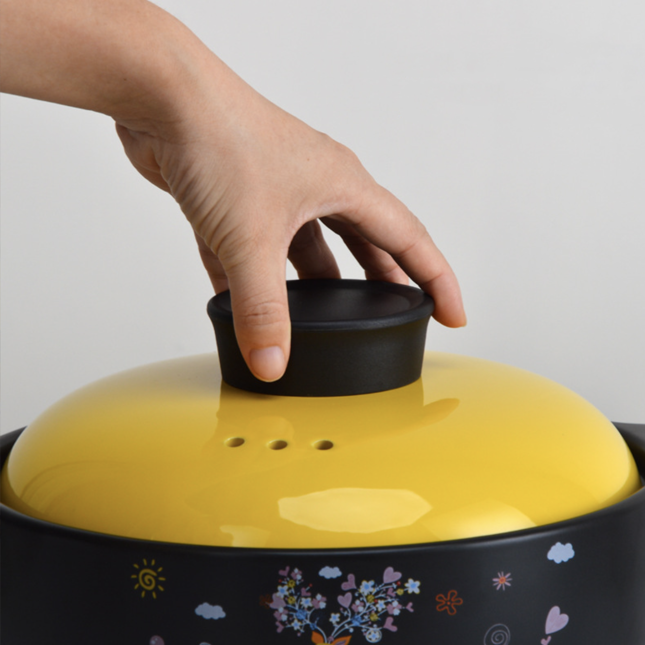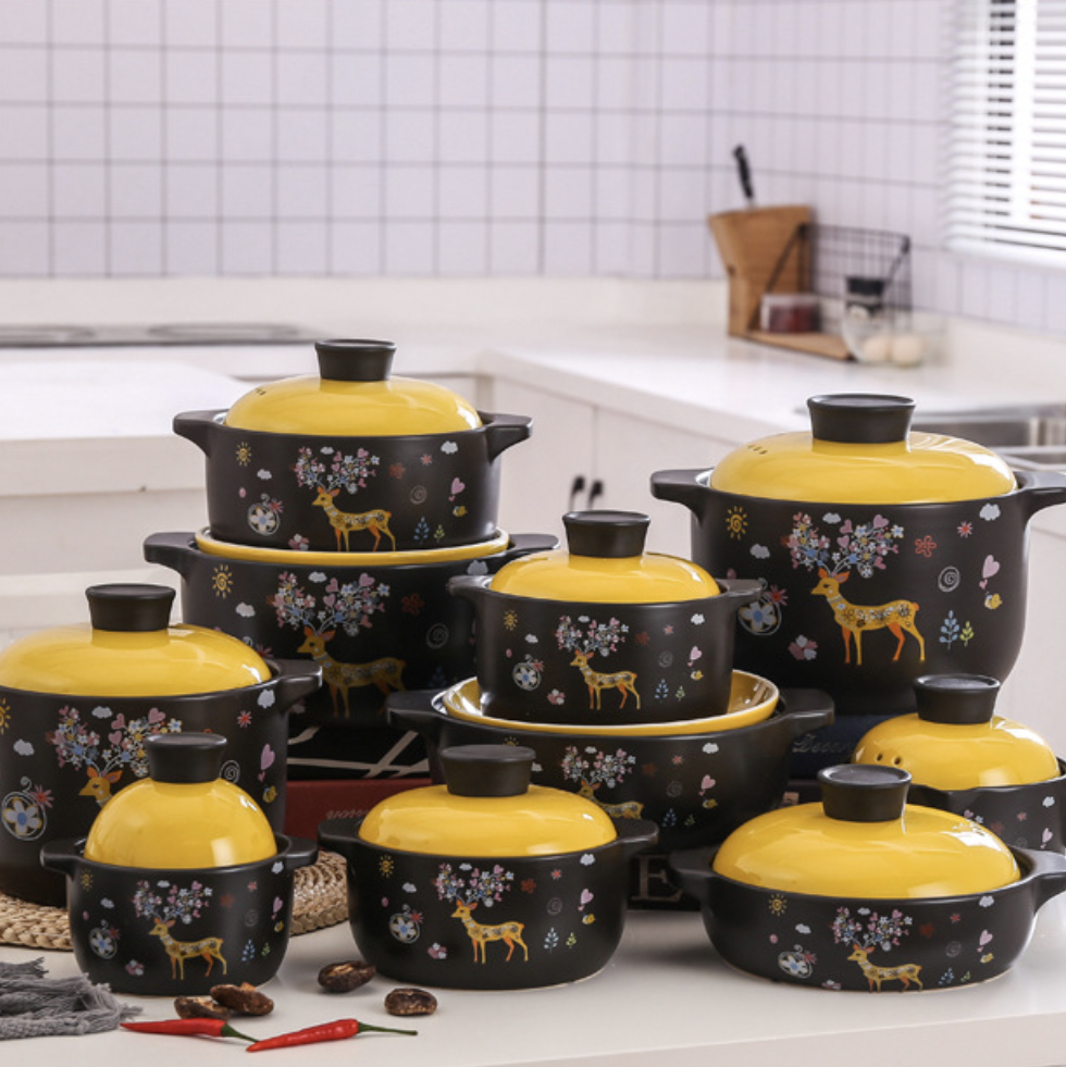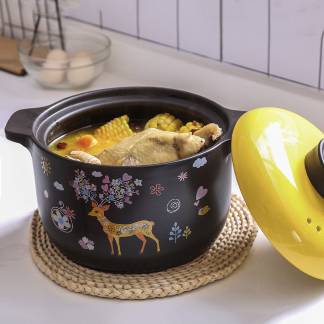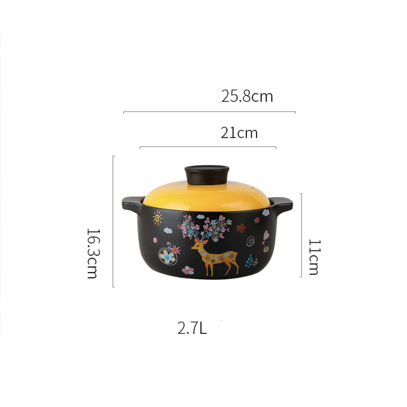 A multipurpose cookware pot that can be used on the gas burner, electric ceramic stove, microwave oven, refrigerator, and dishwasher will surely brighten up the kitchen. For the set to be the show-stealer on any dinner table, the ceramic pot and lid are given two contrasting tones. The painting of the deer, flowers and Sun against the black background is highly captivating, making the pot an excellent match for any monotoned tableware. The ceramic substance used to create the pot is absolutely non-toxic, and it prevents food from clinging to the dish's surface. In the event that the food does stick, immersing the dish in water shortly before washing makes the cleaning up a snap. The possibilities for what one can cook in these pots are boundless! Nestip: The cooking pots would look great on a Christmas table layout. Size: Height with lid- 16.3cm Height without lid- 11cm Diameter with handle- 25.8cm Color: Yellow and black Material: Ceramic Products included: 1 cooking pot Style: YUDU16