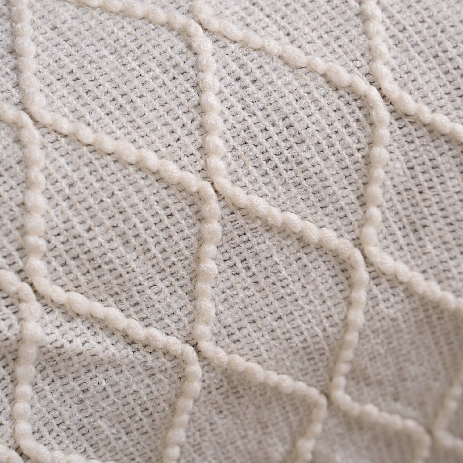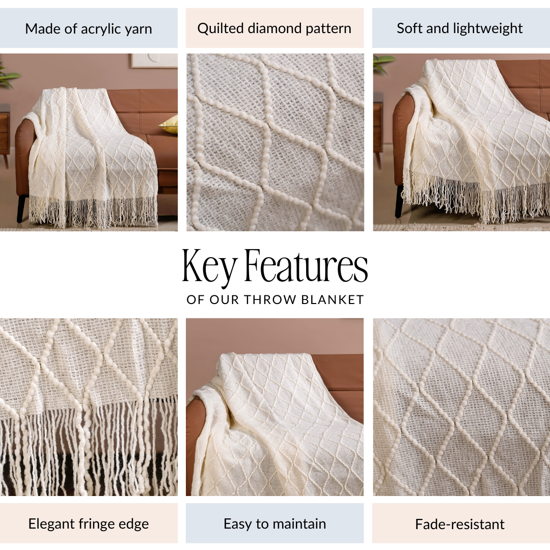 Design: A striking piece, this throw is woven from durable acrylic yarn in a natural white hue. The surface is brought to life with a captivating quilted diamond pattern, formed by intricate rows of raised, small bobbles. It is elegantly finished with long, flowing fringes along the edges for an artisanal touch.