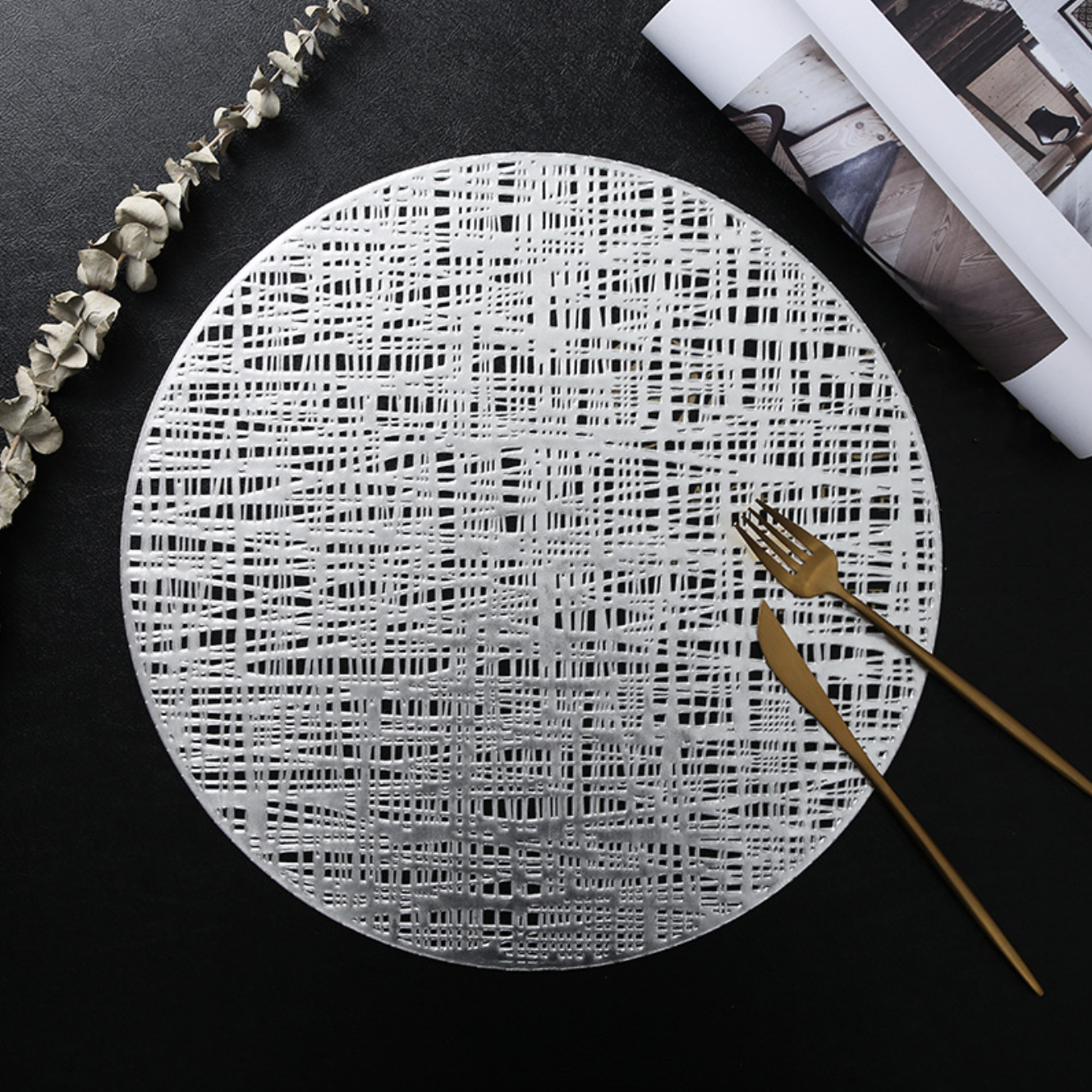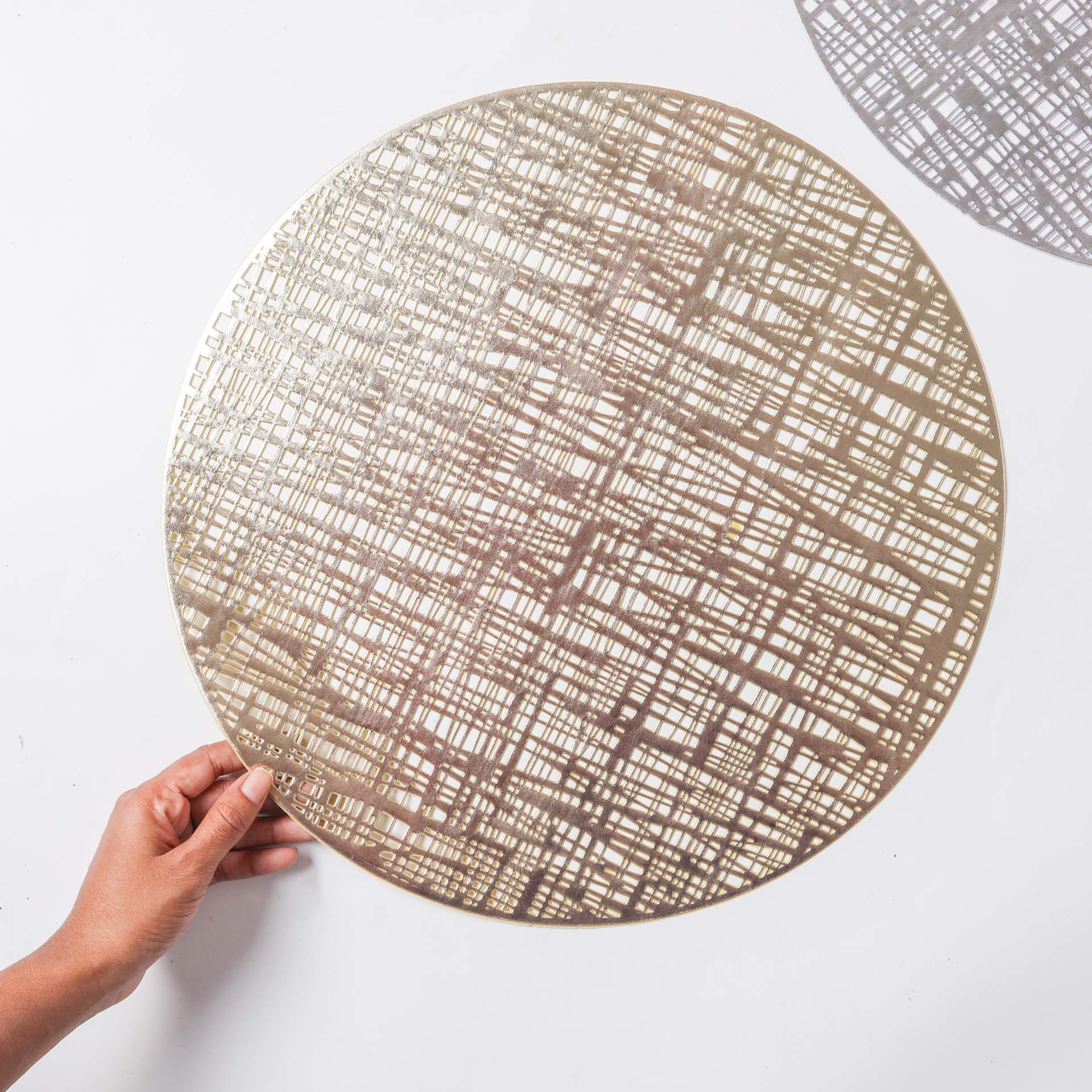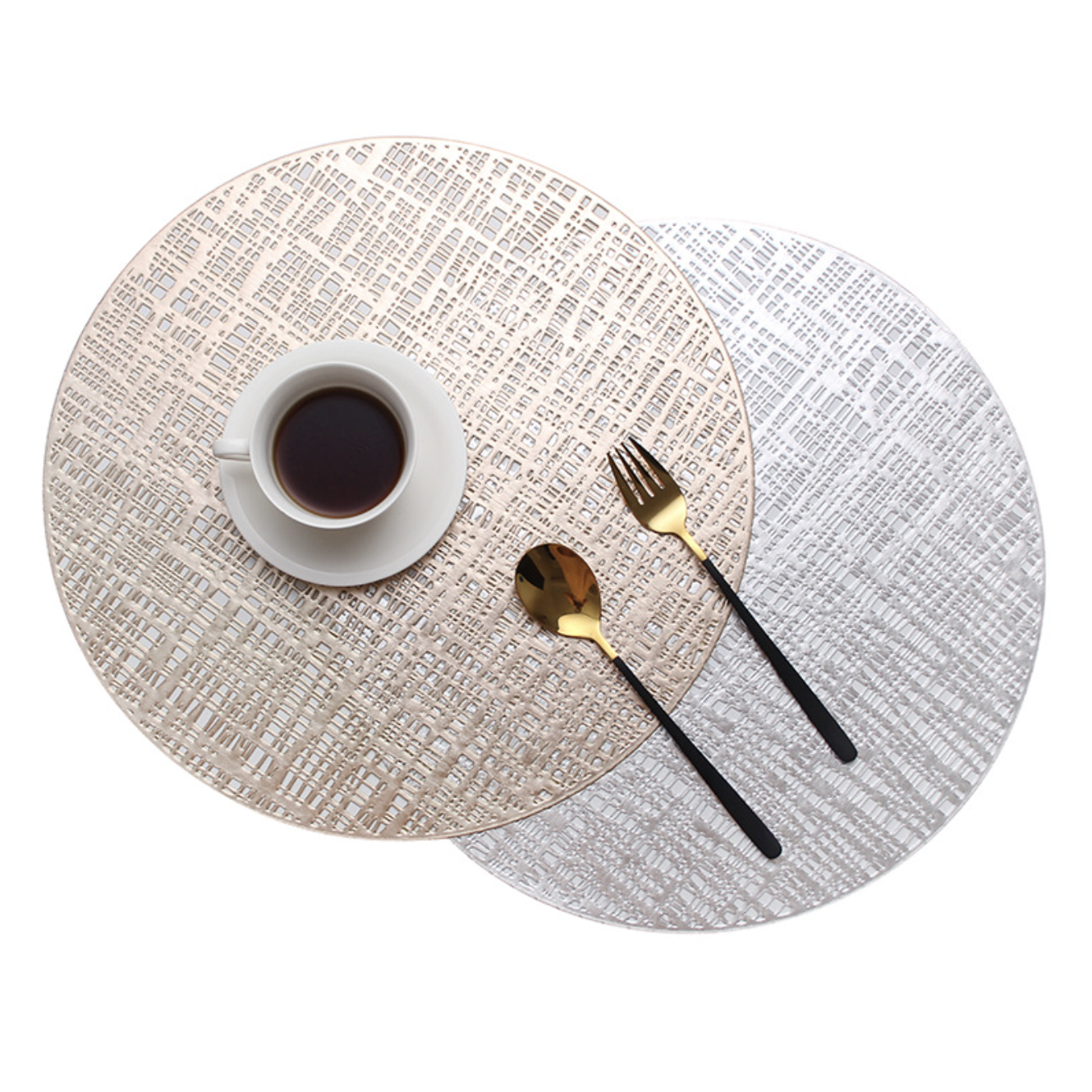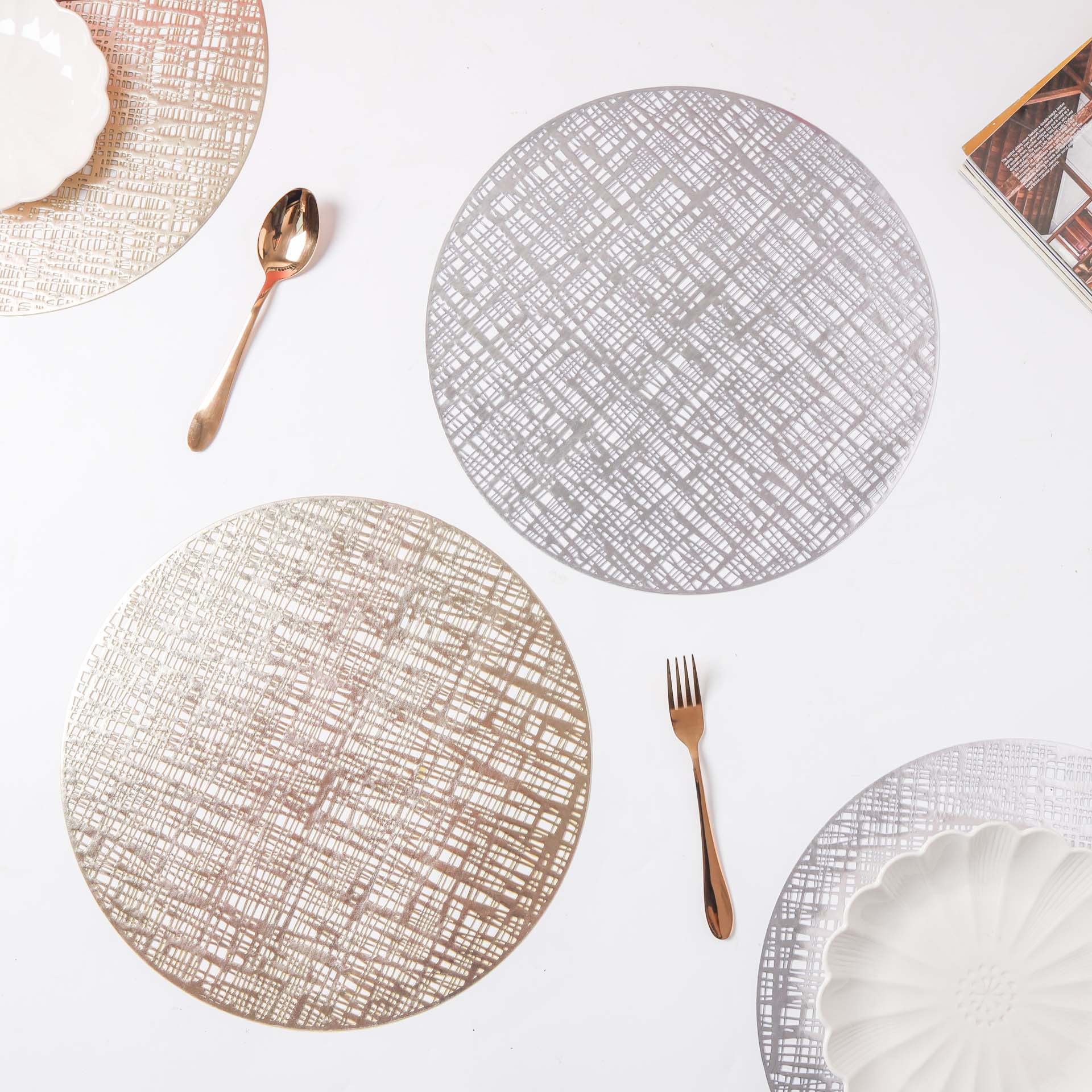 The round (silver and gold) PVC placemat is non-slip, precision woven, and heat resistant. The placemats protect the table by providing an effective layer of insulation. The mats also act as a protective layer to prevent the scratching of the tabletop and reduce the noise of clanking pots, pans, and cutlery. The table mat set is very useful for formal gatherings at home and in restaurants as well as for regular use.