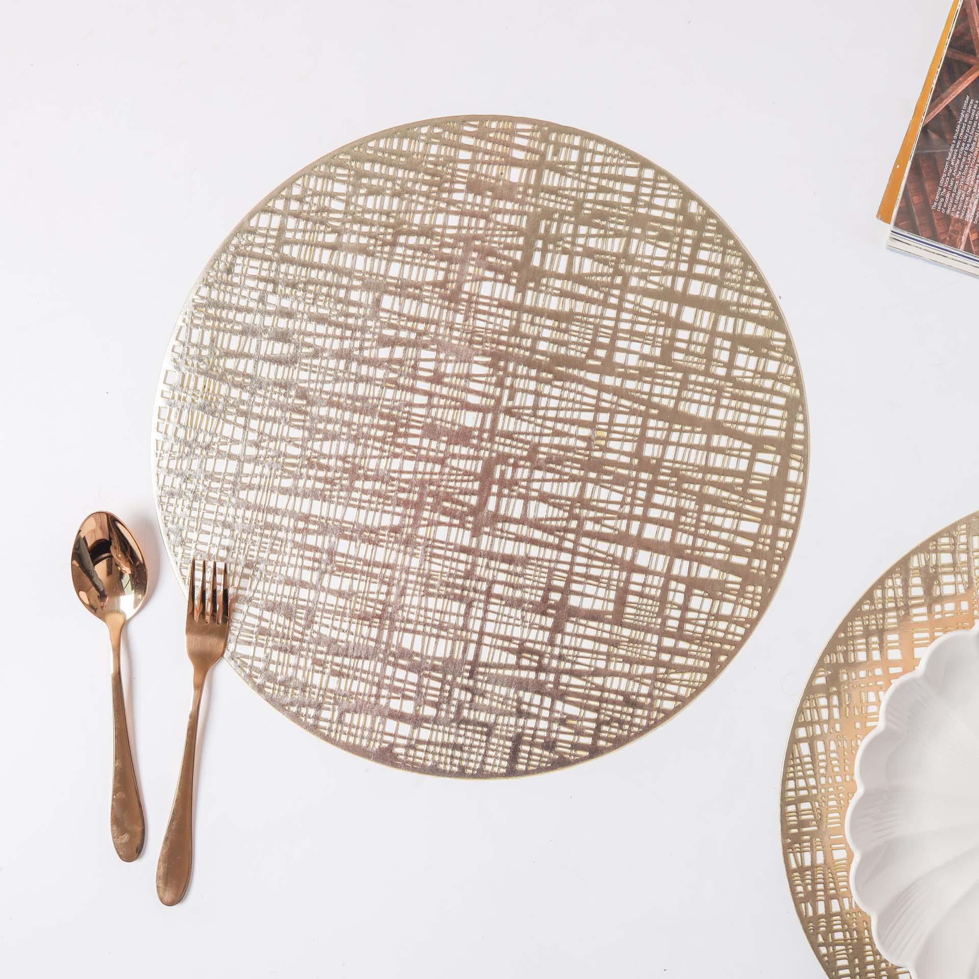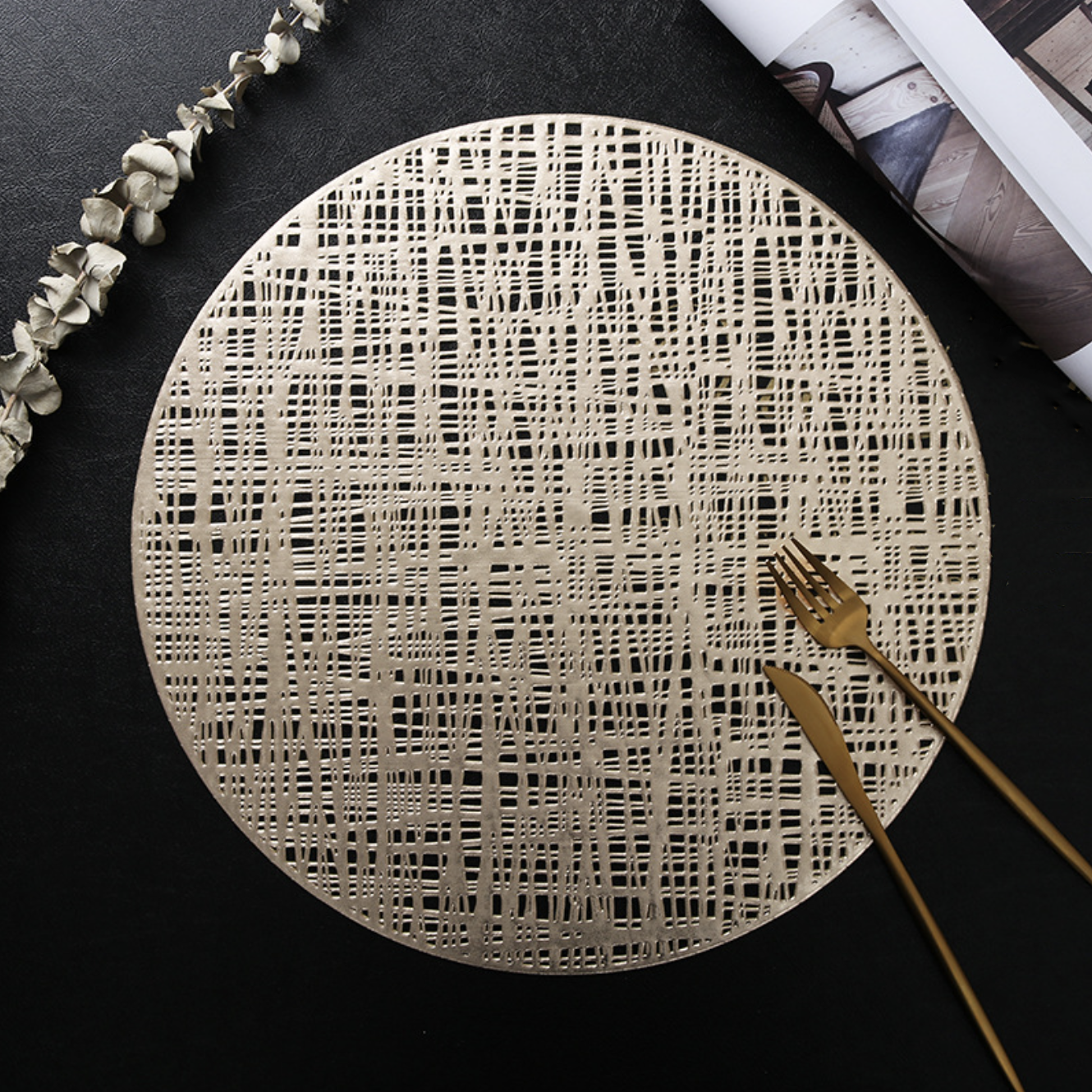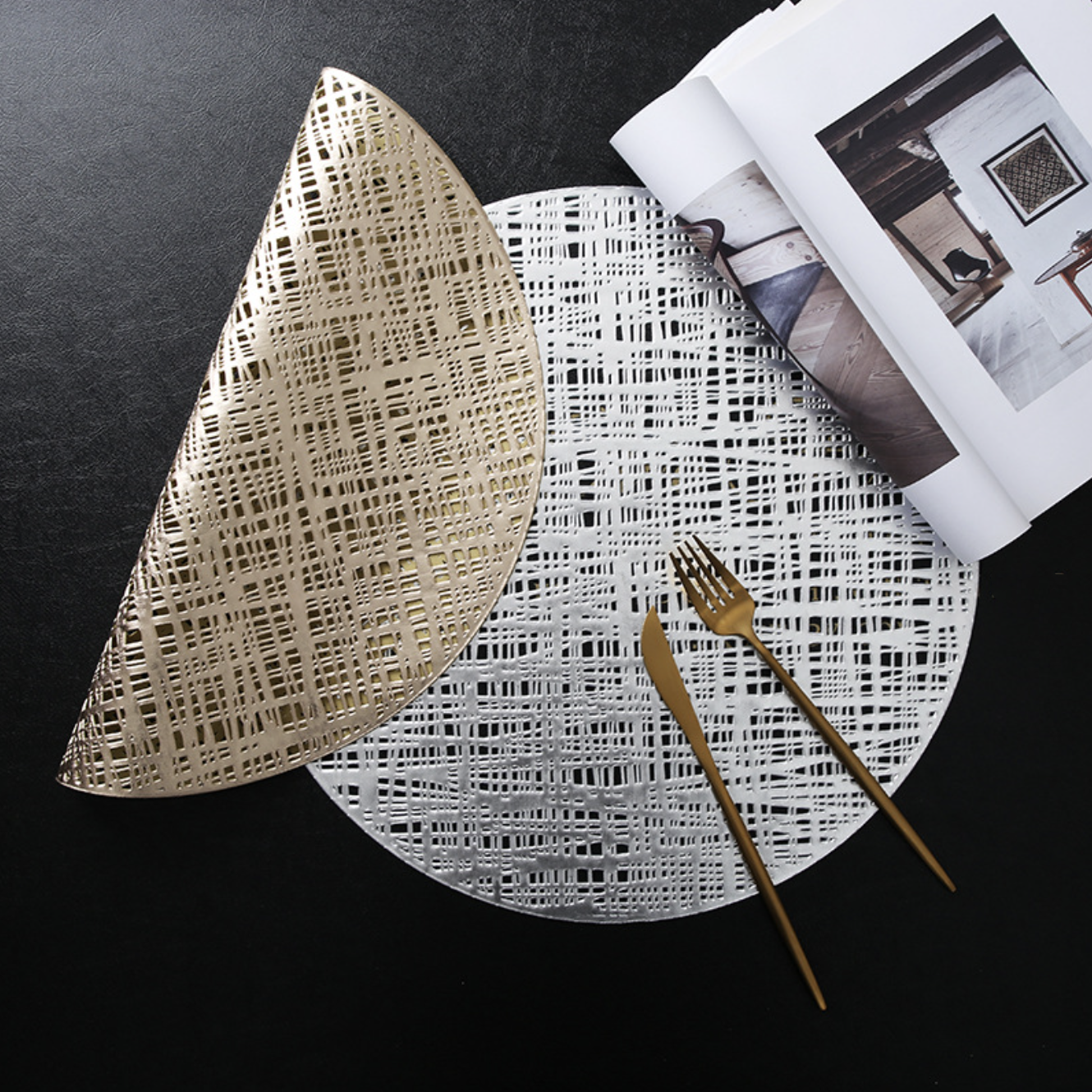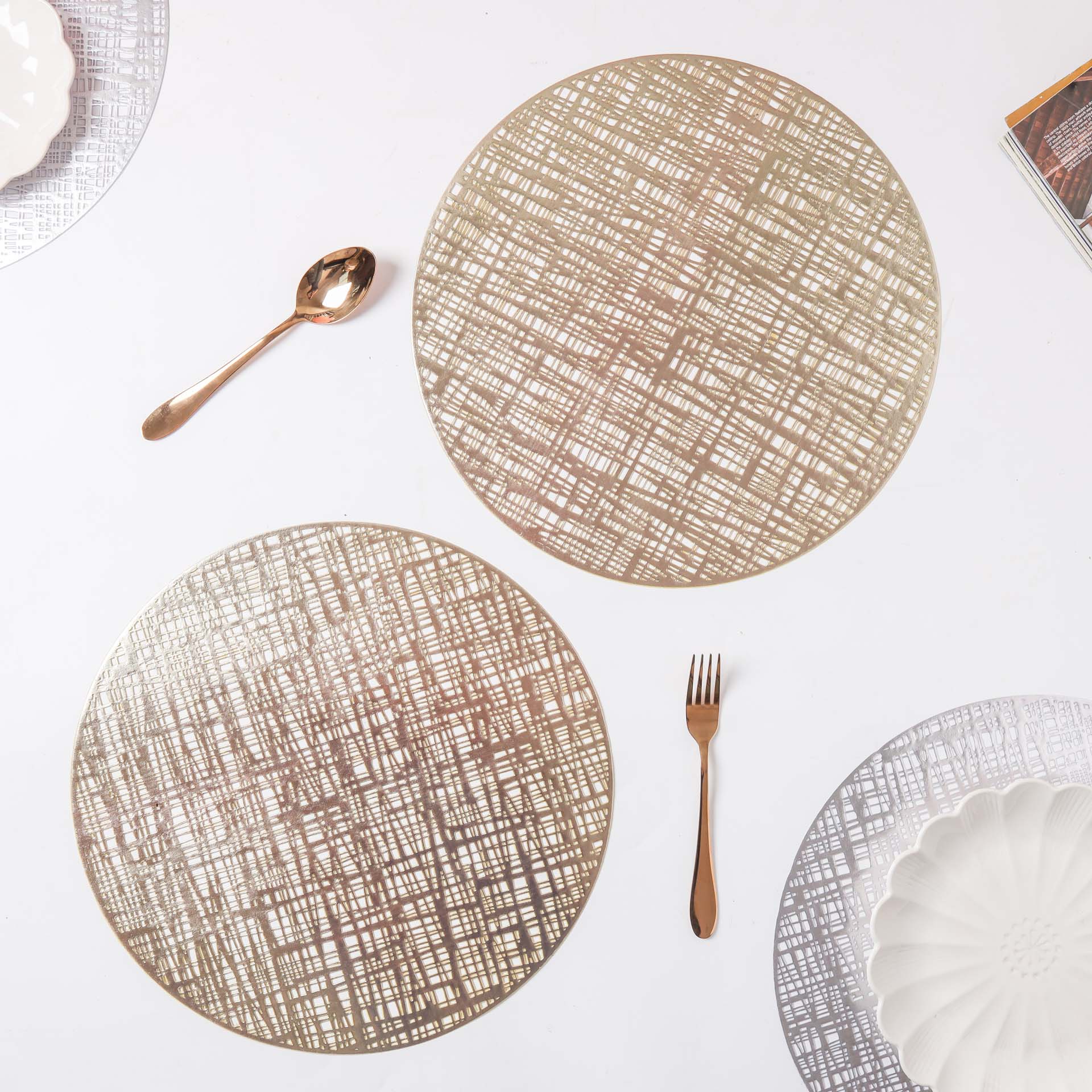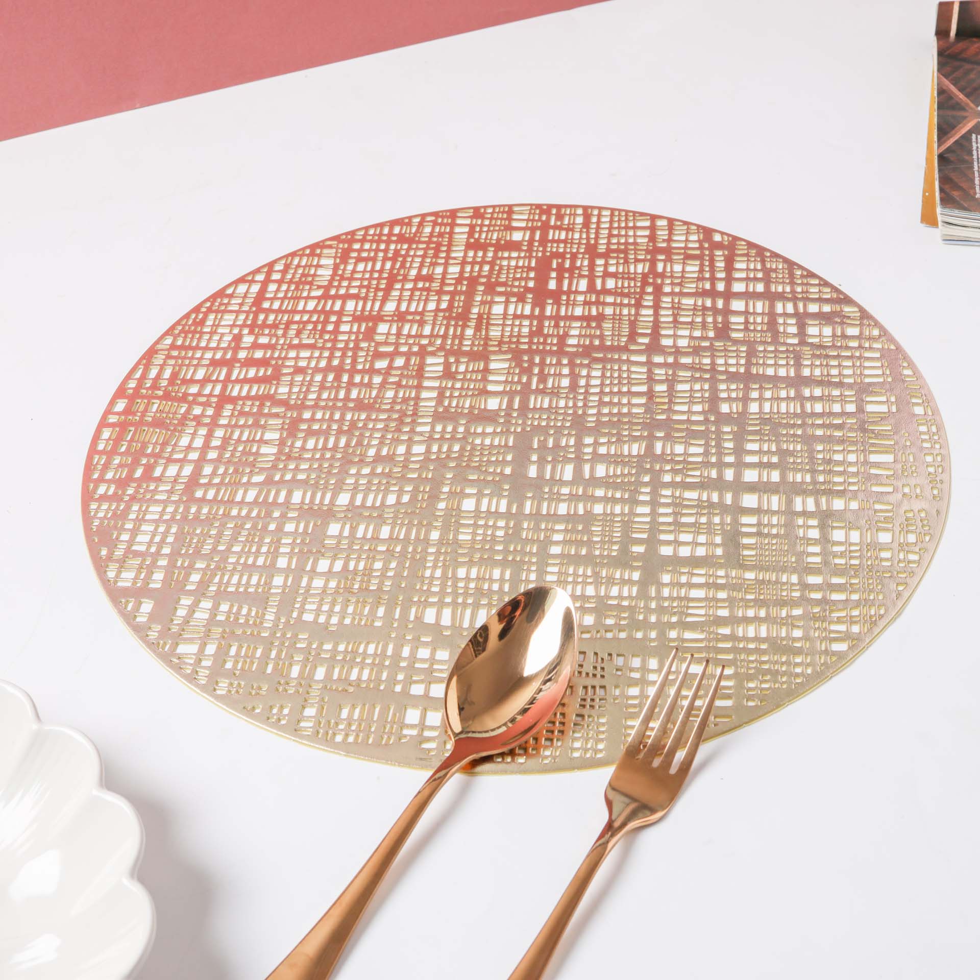 The round (silver and gold) PVC placemat is non-slip, precision woven, and heat resistant. The placemats protect the table by providing an effective layer of insulation. The mats also act as a protective layer to prevent the scratching of the tabletop and reduce the noise of clanking pots, pans, and cutlery. The table mat set is very useful for formal gatherings at home and in restaurants as well as for regular use.