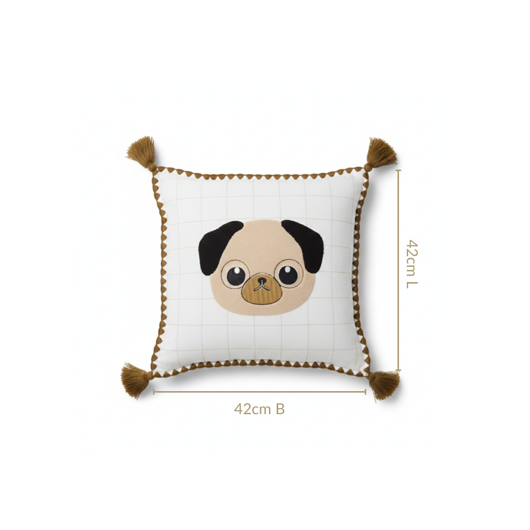 Design: This kids' cushion cover is made from soft 100% cotton fabric, ensuring a gentle feel. The square shape is perfect for display, featuring a charming embroidered pug face detail with big eyes. The cushion boasts neutral brown tassels on the corners and a neatly stitched, durable, embroidered border. The design uses natural cream and brown tones with a subtle grid pattern on the background fabric. This small-sized cover, ideal for children's spaces, features high-quality textured embroidery stitching and is washable for easy maintenance. The cover may experience slight shrinkage after washing, adding to its cosy, snug fit. A gentle press with an iron will help the cotton settle back into its original shape.
