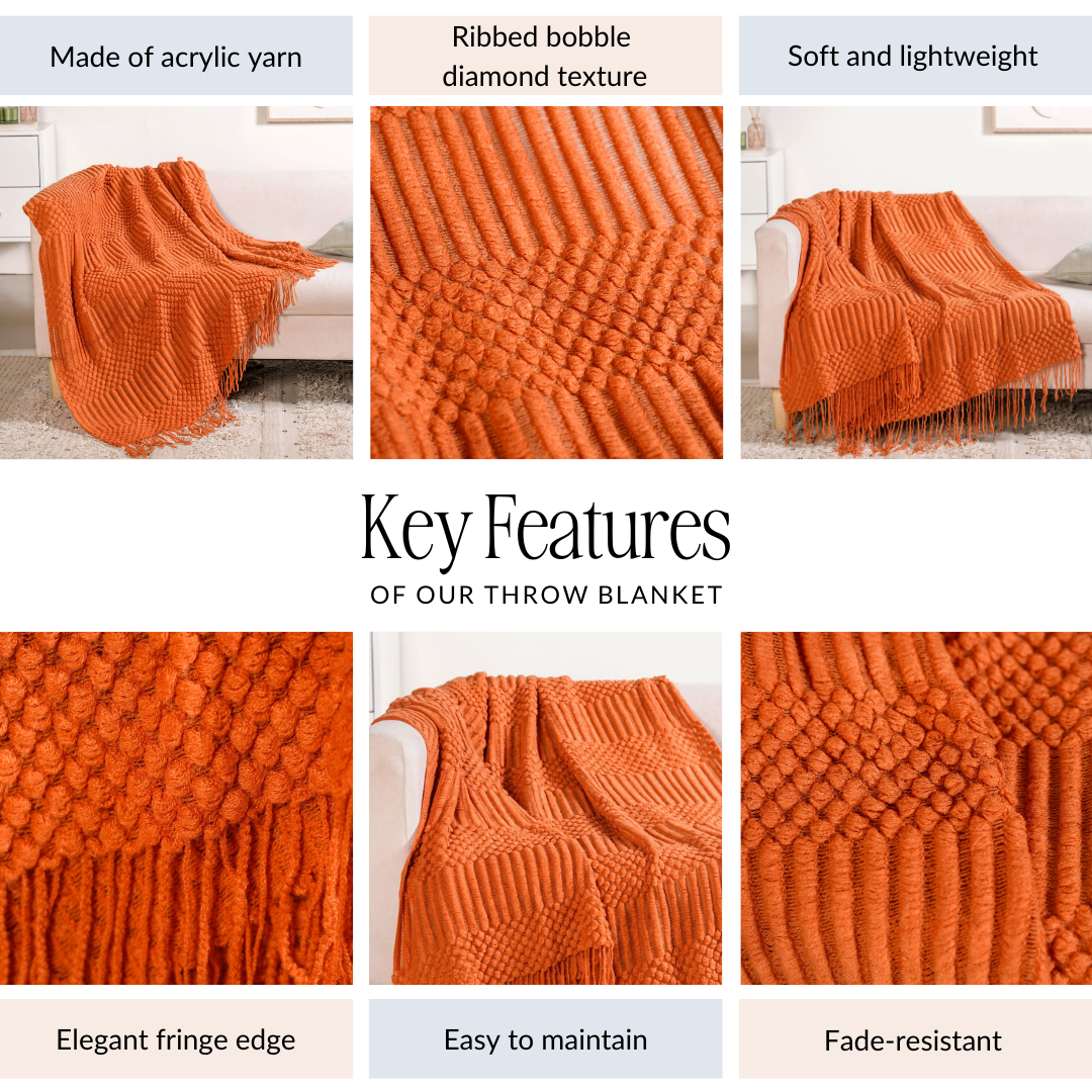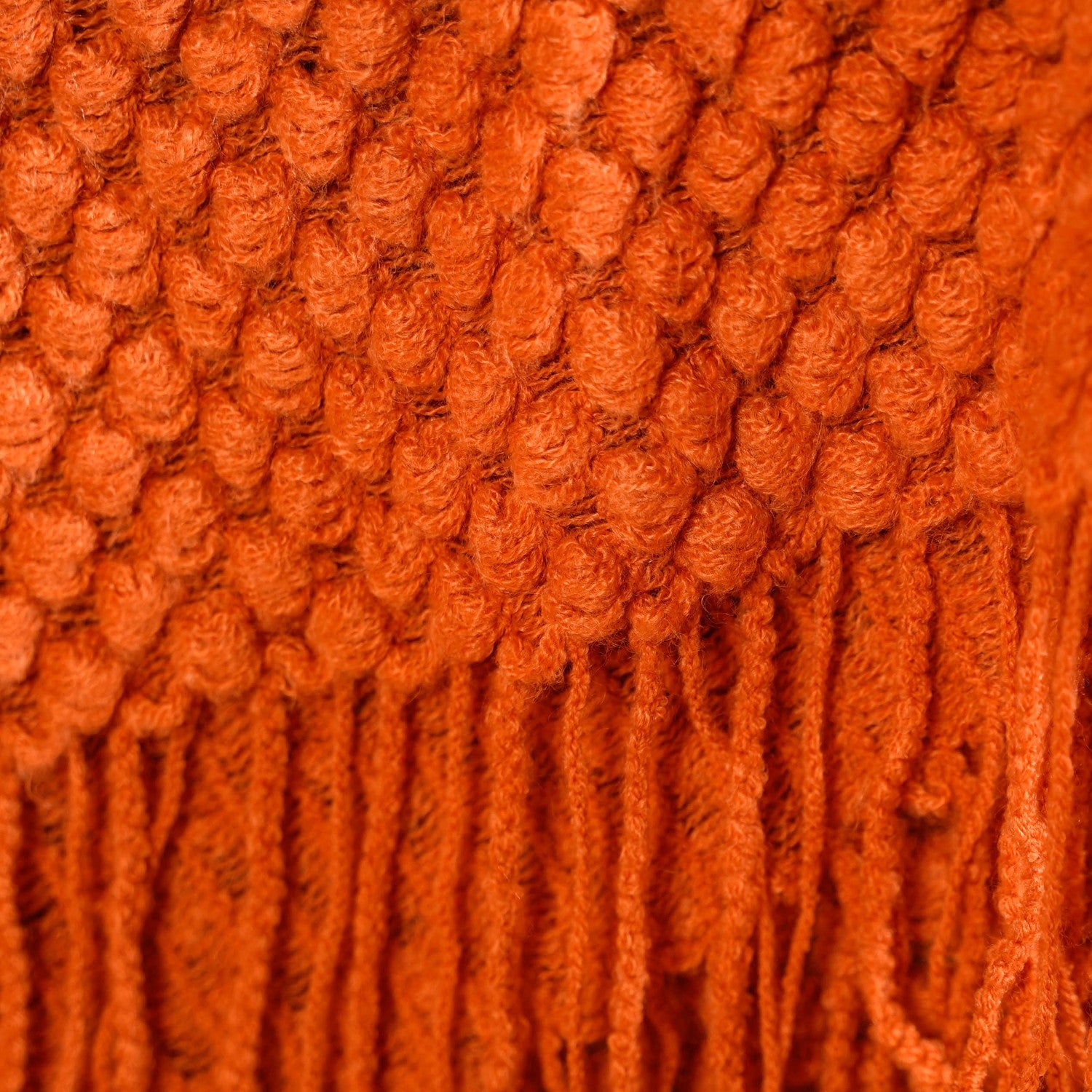 Design: Embrace warm, earthy tones with this stunning throw, presented in a rich rust colour. Made from soft acrylic yarn, the design showcases a captivating ribbed bobble diamond texture for exceptional visual depth and a luxurious, dimensional feel. It is beautifully finished with long, flowing fringes along the edge.