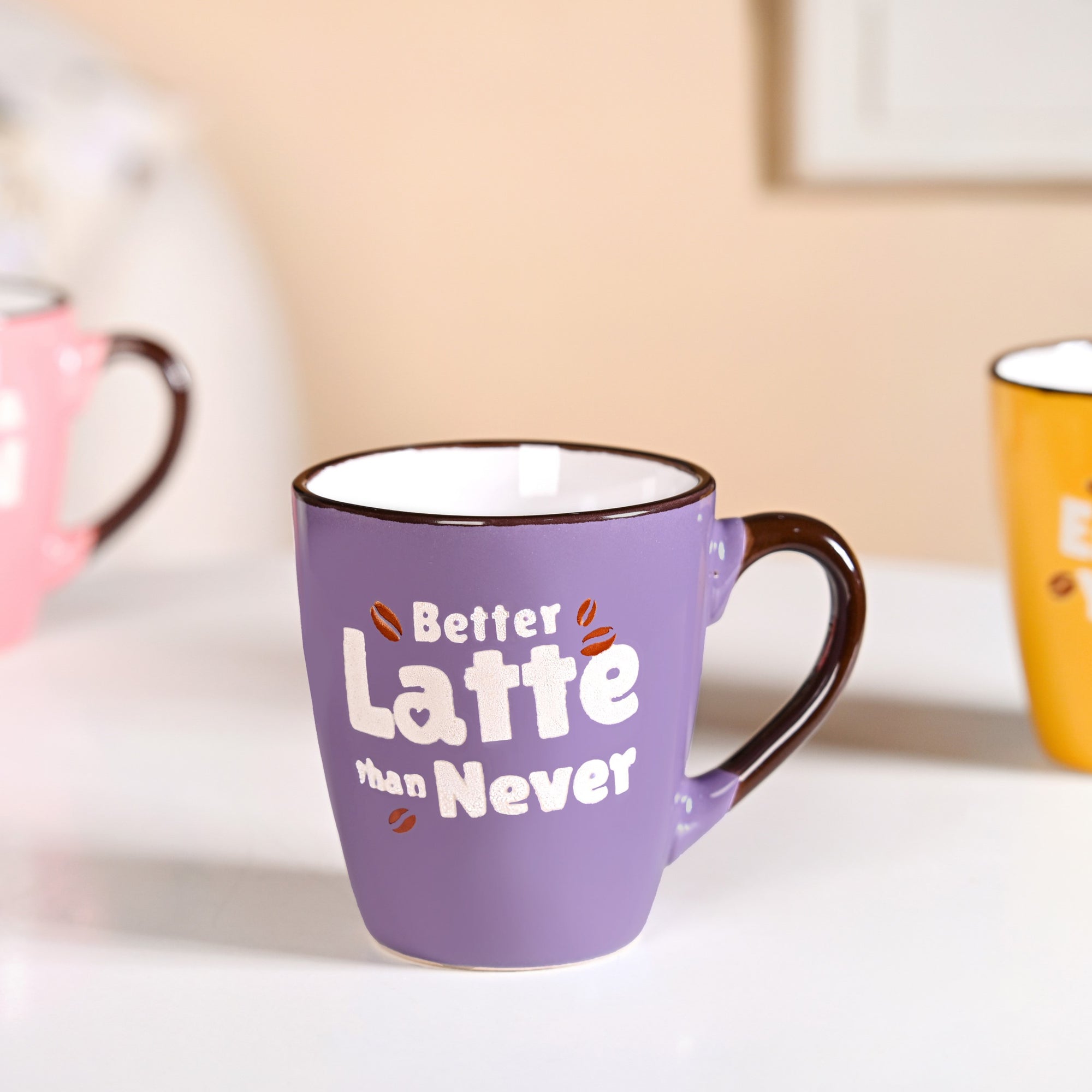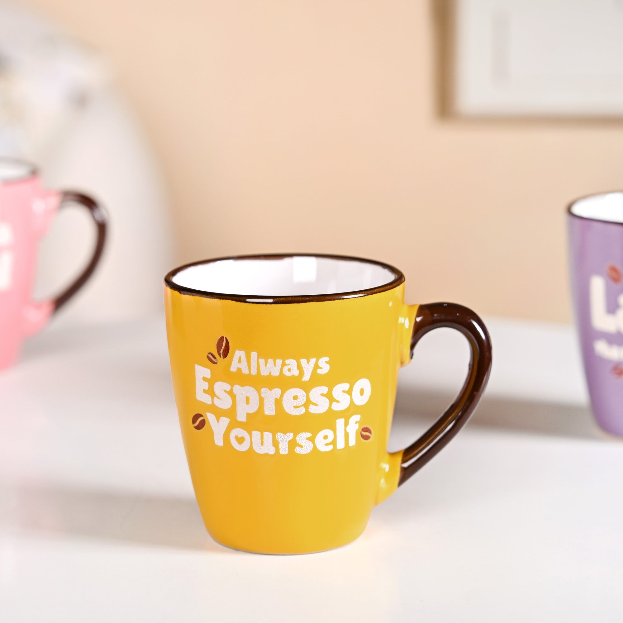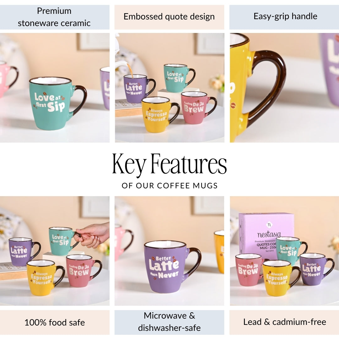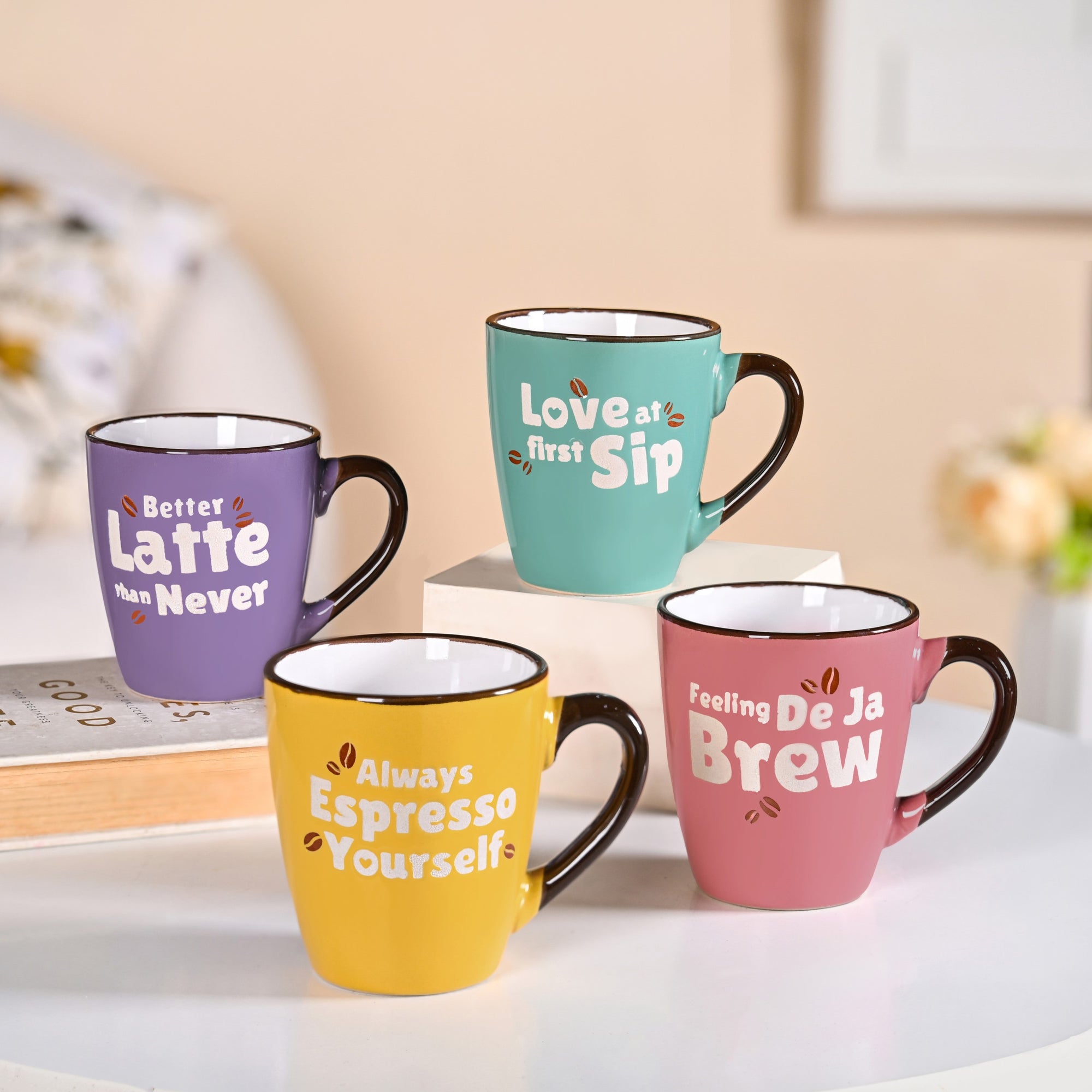 Design: This vibrant ceramic mug set includes four glossy cups, each accented with a bold dark brown rim for a modern, cohesive look. Available in rich shades of pink, green, yellow, and purple, each mug features a white interior and playful coffee-themed quotes in off-white: “Feeling déjà brew,” “Love at first sip,” “Always espresso yourself,” and “Better latte than never," respectively. Designed with a sturdy handle, flat base, and a coarse-textured bottom, these mugs combine charm, comfort, and character in every detail.