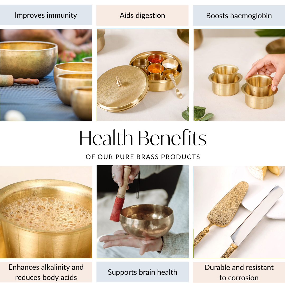 Benefits: The natural properties of brass in our dabara set can offer potential health benefits, including antimicrobial effects that help keep your beverages pure and fresh. According to Ayurvedic traditions, drinking from brass vessels can help boost immunity and improve overall health.