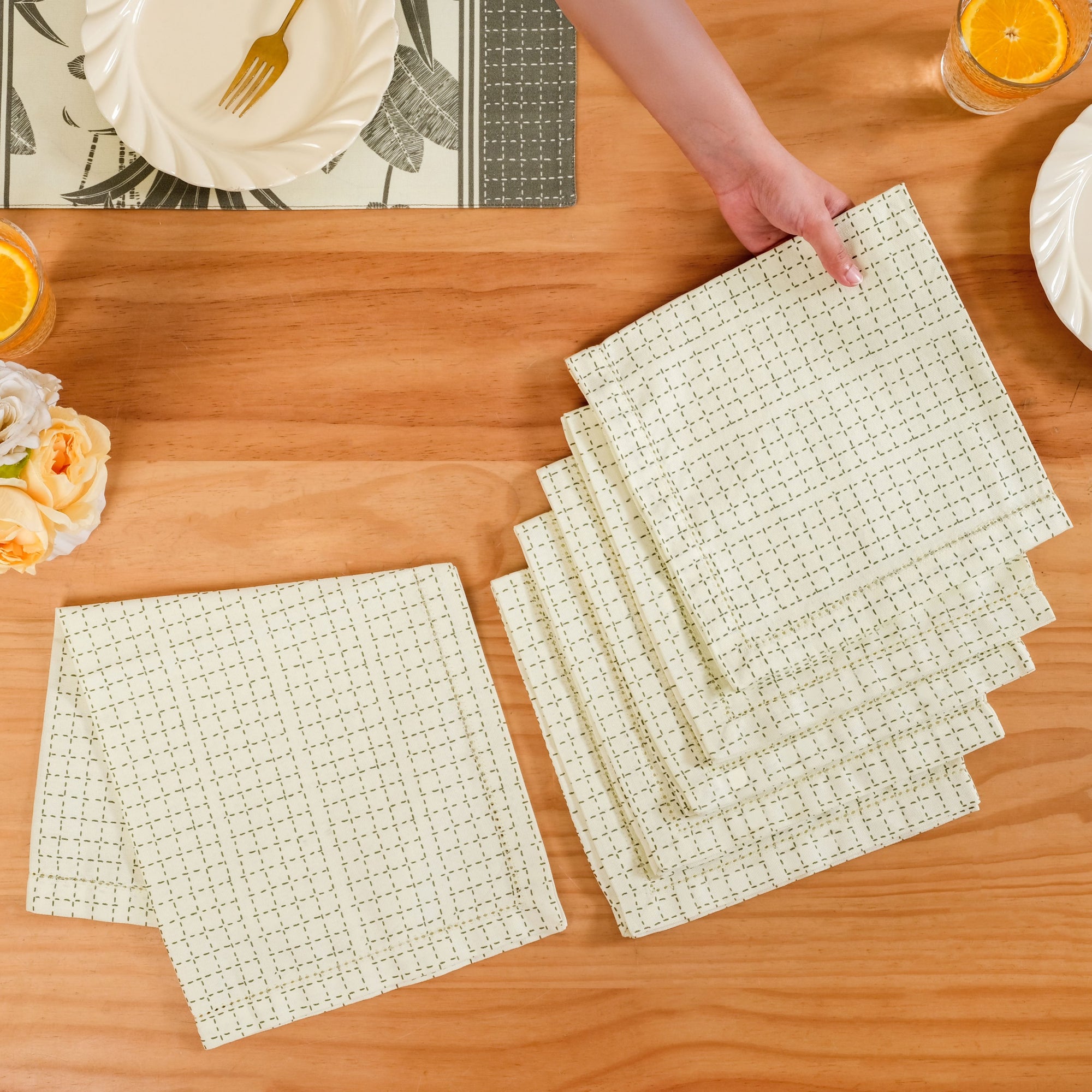 Design: Designed for modern homes that appreciate subtle detailing and sustainable materials, this set of six pure cotton table napkins brings an understated elegance to any dining occasion. The classic picot edge provides a soft, decorative finish that elevates both everyday meals and formal gatherings. The design features a delicate picot edge, a timeless decorative technique that creates a subtle textured border without overwhelming the minimalist aesthetic. The running strict grid design suits every dining table aesthetic.