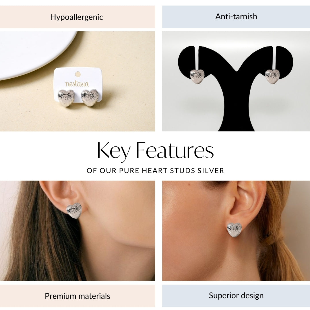The spirit of love takes form with these stunning stud earrings. Inspired by the freedom and strength one finds in love's rawest form, these earrings embody both elegance and resilience. The textured, distressed surface enhances its unique character, creating a beautiful contrast to the heart shape. Crafted in a silver hue, these earrings are the perfect blend of classic beauty and modern artistry, offering a subtle yet striking addition to any look.