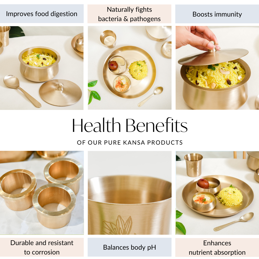 Benefits: Kansa, an ancient alloy of copper and tin, offers numerous health and practical benefits. It has natural antimicrobial properties, which help inhibit the growth of harmful bacteria and pathogens. This contributes to a more hygienic dining experience, as the material helps maintain the cleanliness of your food. Eating from Kansa utensils can help improve digestion. The trace amounts of copper that leach into food can aid in the digestion process and support overall gastrointestinal health. Kansa metal is highly durable and resistant to damage, ensuring that your dinner set lasts for many years with proper care. The rust-resistant properties of Kansa ensure that the dinnerware remains clean and free from corrosion, which is particularly beneficial in maintaining the set's appearance and hygiene.