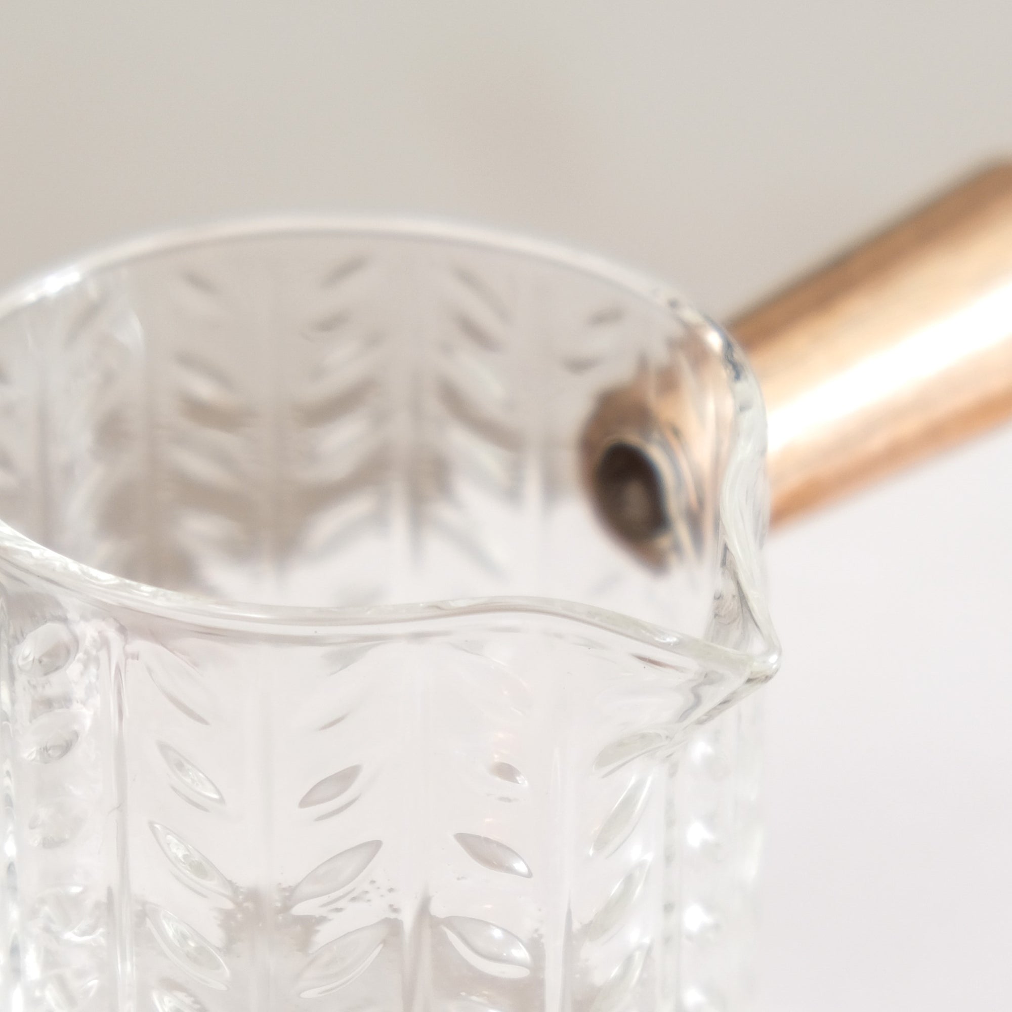 Design: Embrace the art of elegant serving with this exquisite sauce and condiments pitcher with delicately embossed glass in a striking leaf pattern, featuring a clear, crystalline finish that highlights vibrant colors. The built-in spout and ergonomically designed bamboo handle complement its timeless beauty, with the bamboo adding a natural touch and the spout offering a sleek design element. The leaf pattern on the glass exudes a sense of refinement, making it a beautiful addition to any table setting.