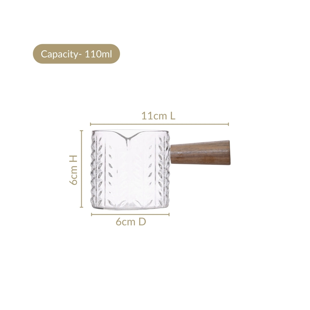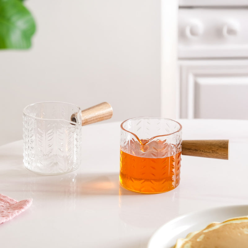 Benefits: This pitcher features a thoughtfully shaped rim that acts as a smooth-flowing spout for easy pouring, minimising drips and splashes, and a wooden handle that provides a secure grip. The embossed glass design adds visual texture and artisan charm, while the thick, high-quality glass resists chipping and beautifully showcases its contents. Perfect for serving sauces, syrups, dressings, or even milk and cream, it brings a touch of elegance to any table setting.