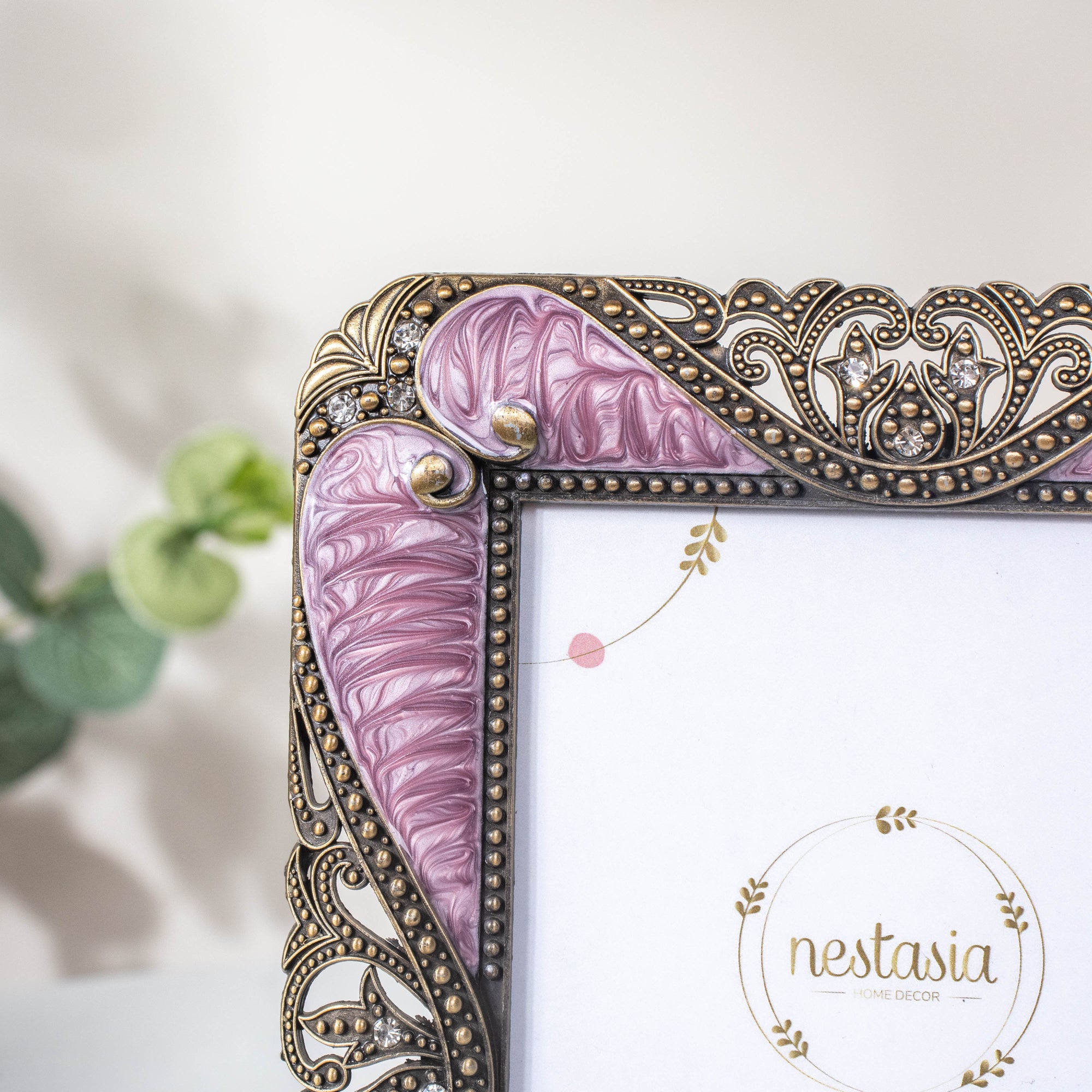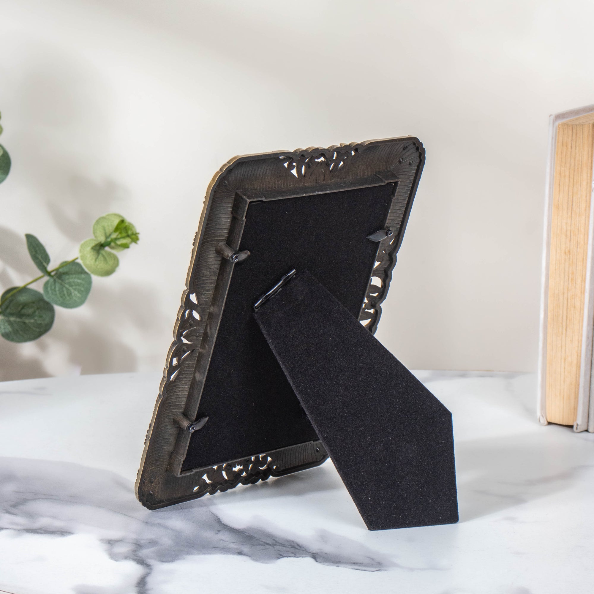The antique photo frame is the perfect case to house all the candid moments of life. Each border has a triangular golden motif at the center, with intricate details. The eloquent design enhances the ambiance of any setting to which one adds the photo frame, maybe on the study desk or a tabletop.