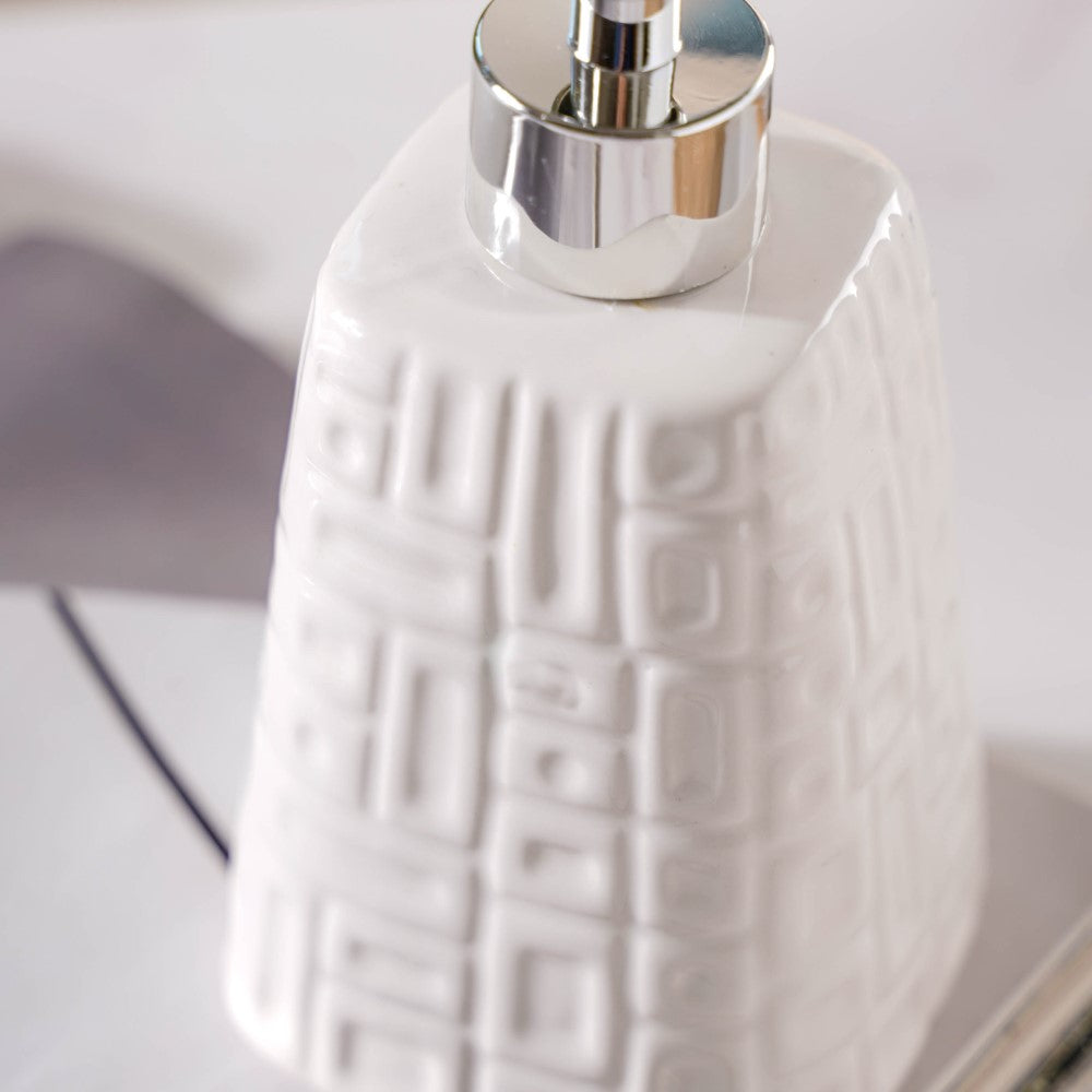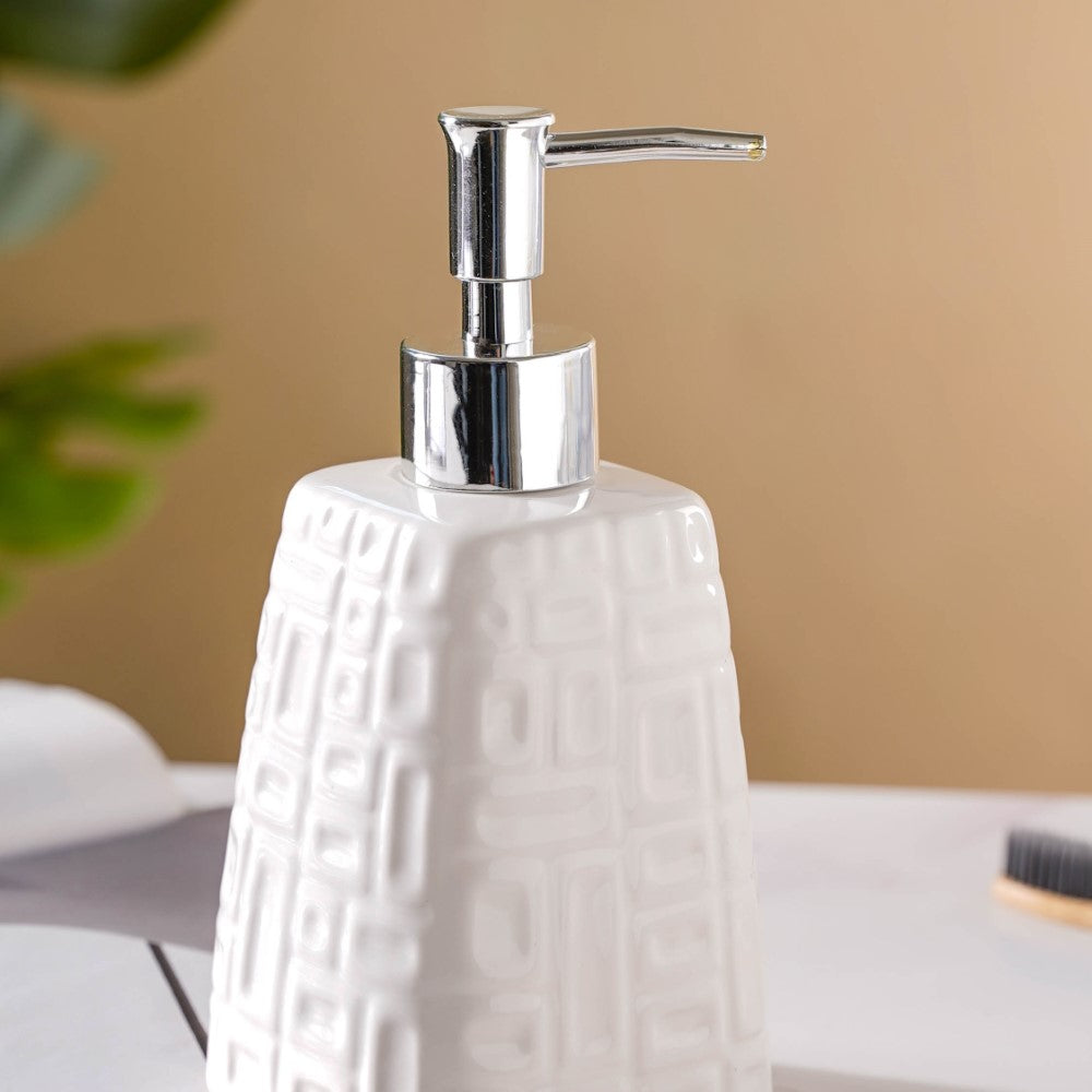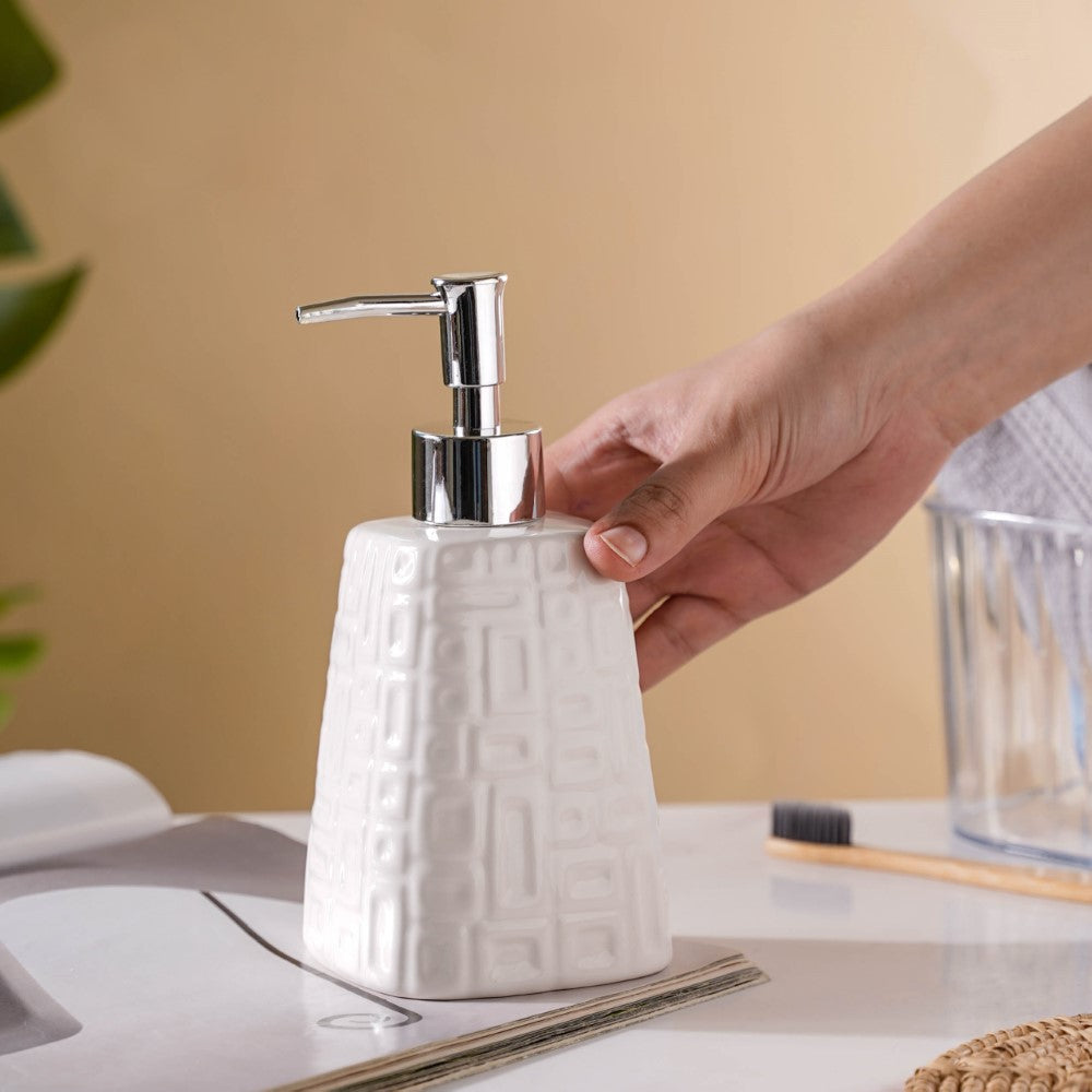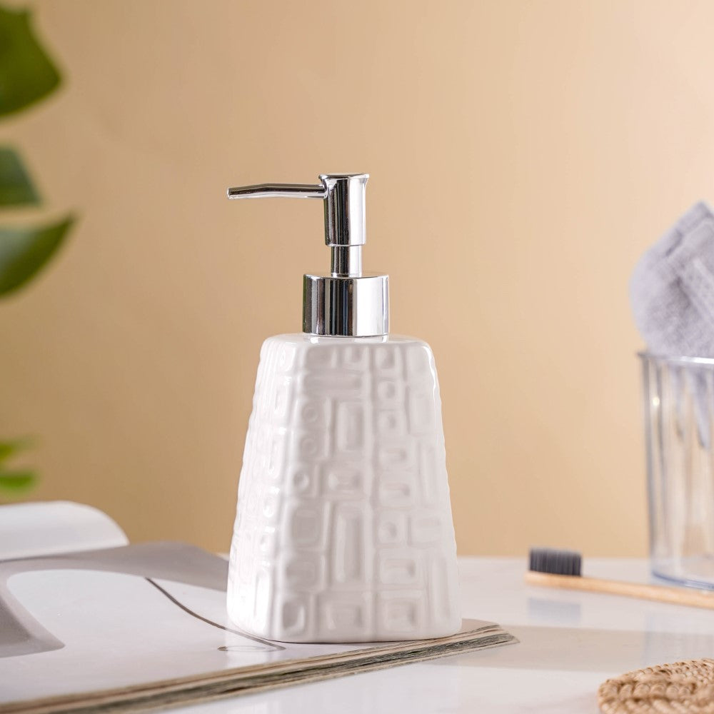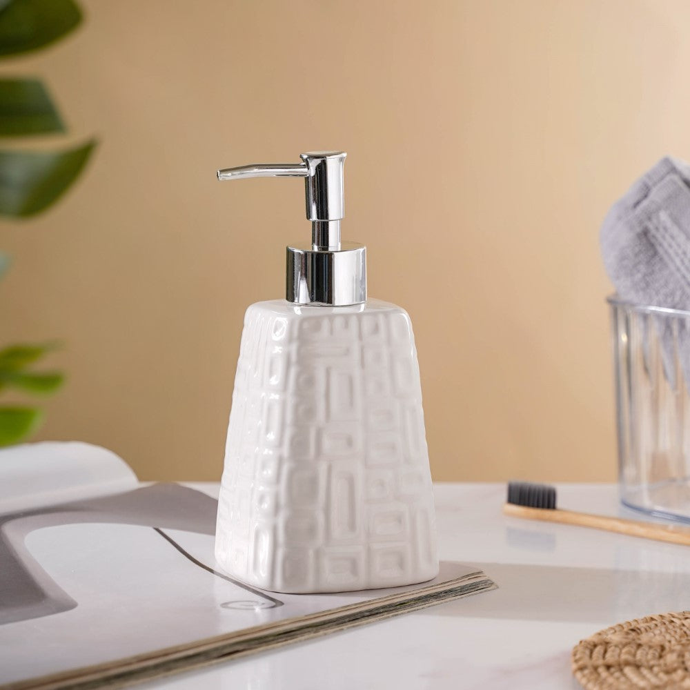 Nestip: The textured soap pump dispenser can be paired with similar or contrasting dispensers from our collection for storing shampoo and conditioner.