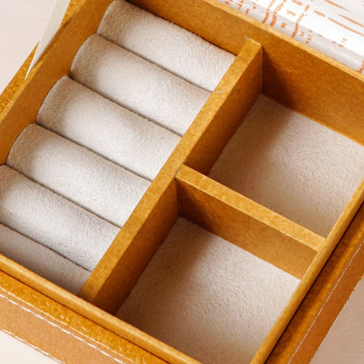 Design: Square in shape and crafted with a sturdy leatherette base, this organiser features a textured canvas lid that’s lightweight yet durable. The inside is lined with a soft, brown suede-like fabric that cushions your jewellery and adds a luxe feel. On the outside, an elegant quadrata pattern in earthy brown tones over a muted white base gives it a clean, understated look. Inside, you’ll find ring rolls, small compartments for earrings or studs, and even a built-in mirror, perfect for quick touch-ups on the go.