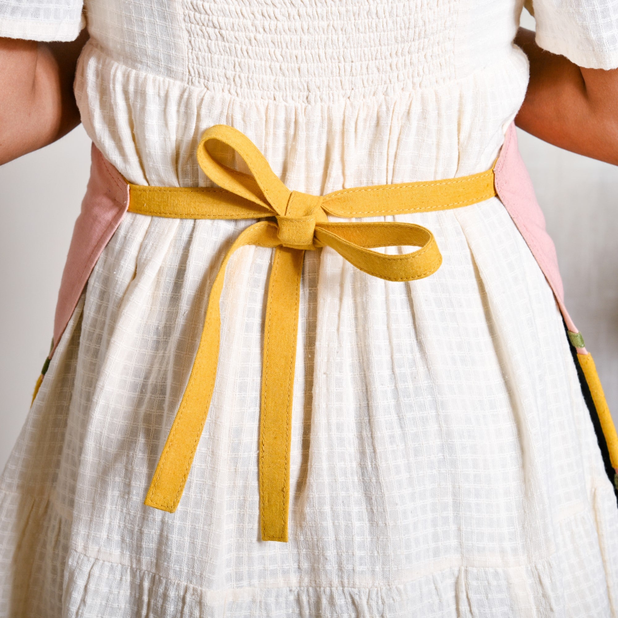 Design: The chef apron features a quilted stitchwork in yellow, enhancing its aesthetic appeal with a green velvet border around the design. The mitten and pot holder also carry the quilted pattern, completing the coordinated look while adding a touch of elegance to your kitchen.