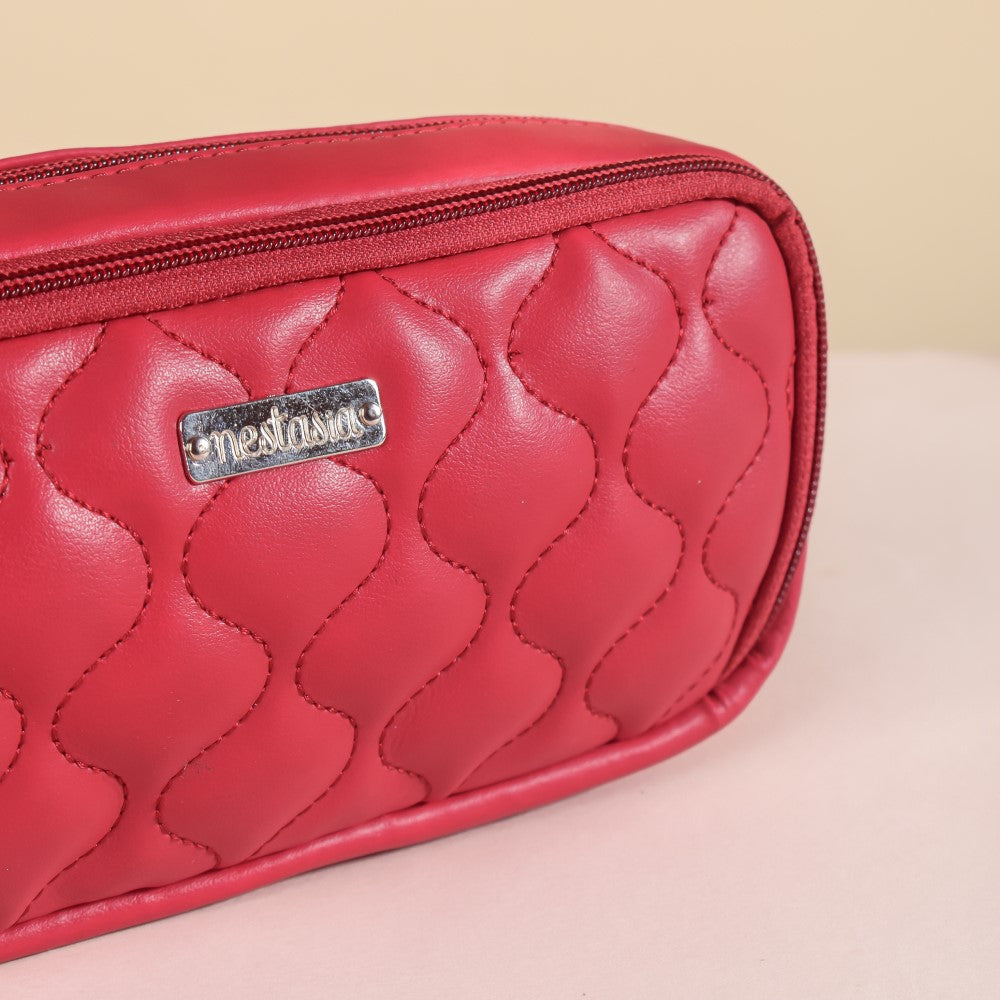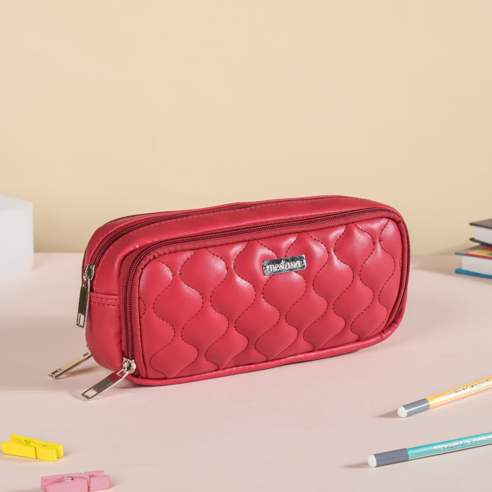 Red bags aren't just a must-have in your collection but it's a timeless trend. Effortlessly chic and voguish red coloured stationery bag is made of 100% good quality vegan leather and is designed with a wavy pattern, exhibited on the cushioned exteriors of the solid coloured bag. The red pencil bag's eco-friendly attribute makes it a unique and aesthetic pencil case. The pencil case pouch's wavy design definitely makes it a stylish pencil case. The red pencil case comprises 3 compartments: one with an elastic loop for pencils, paint brushes, pens, or other study instruments, one area in the middle, and a mesh pocket for smaller items in the last compartment. The pen organizer stationery pouch is ideal for gifting on special occasions like birthdays, festivals, celebrations, parties or as a gift of congratulations after graduation or a new job, as it's a great desk organiser. It can be carried while traveling, as well as for daily use for schools and offices.