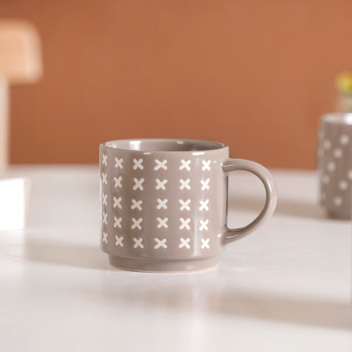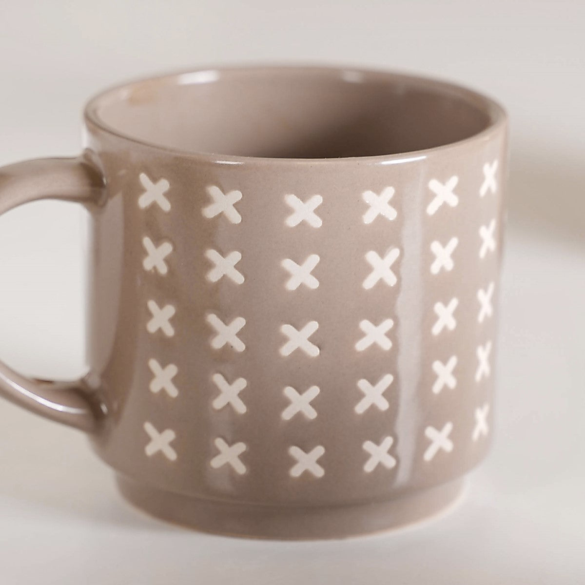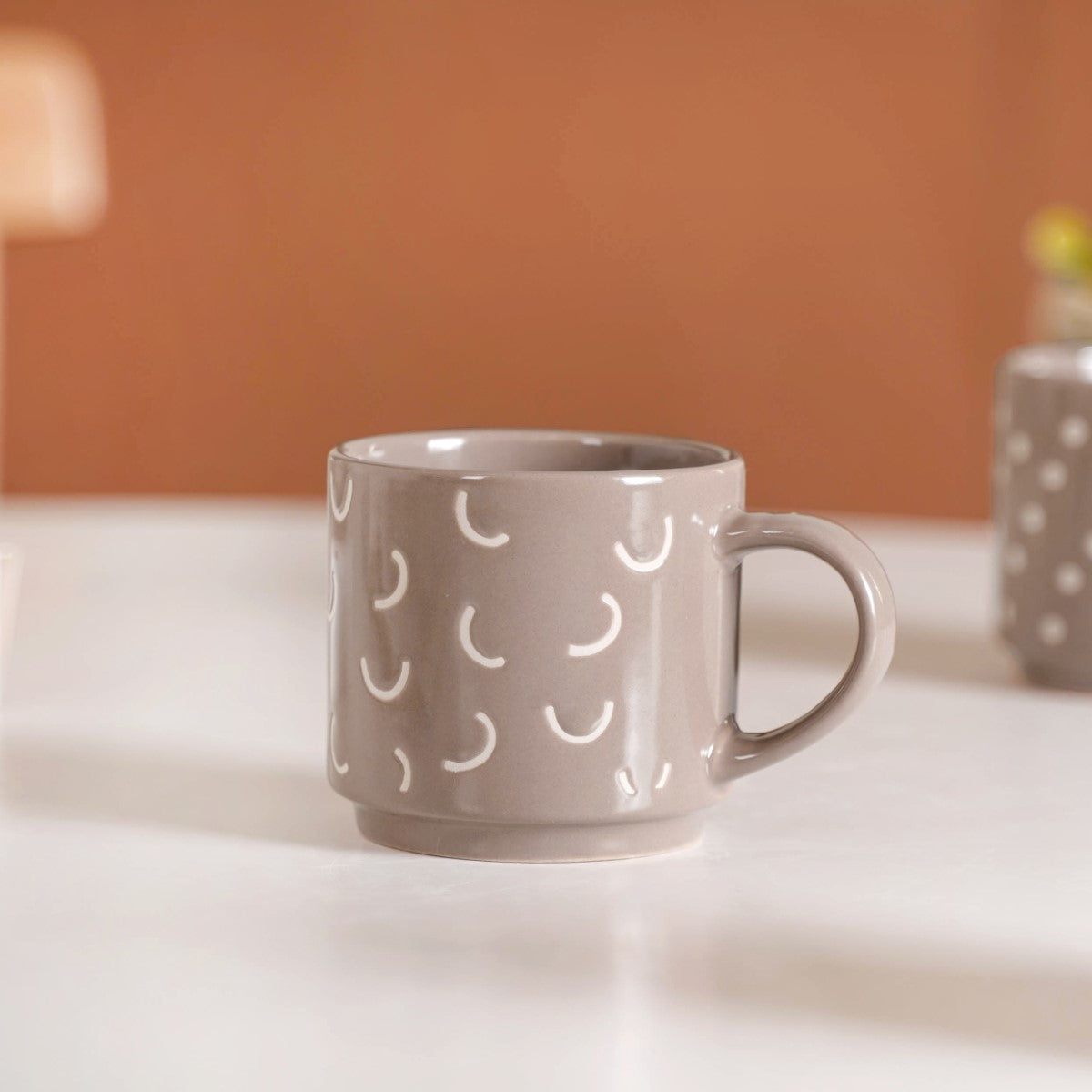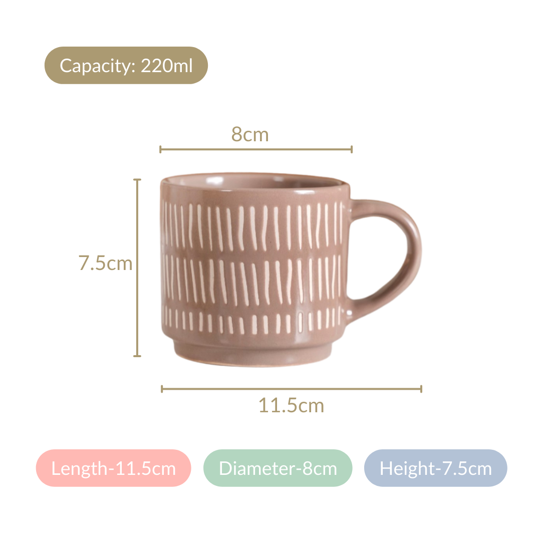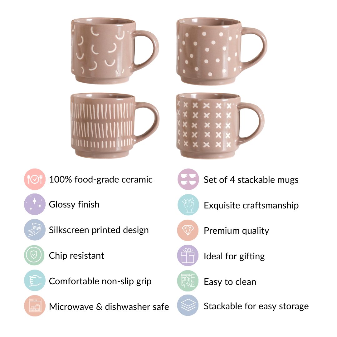 Introducing our quirky beige stackable cups set of 4, where artistry meets practicality. Crafted from premium ceramic, each cup is adorned with meticulously silk-screen printed patterns, including elegant line work, playful polka dots, whimsical moon and star motifs, and intricate crosses. These cups are not only visually stunning but are chip-resistant and extremely durable. With a comfortable non-slip grip, every sip becomes a pleasure. Their microwave and dishwasher-safe nature adds convenience to their undeniable elegance.