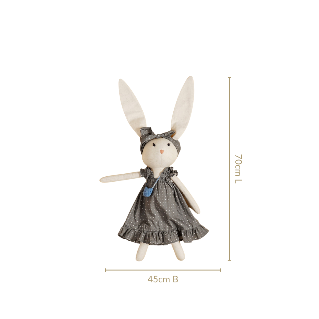 Design: This cream fabric bunny features long floppy ears with contrast cream lining. It wears a dark grey polka dot dress with a ruffled skirt and straps. A matching grey fabric bow is tied neatly, and the small blue shoulder bag is a removable accessory for added play options. The bunny’s face displays stitched black eyes and a pink nose. Its long, slender arms and legs are made of soft fabric. The detailed outfit gives the plushie character, while it is firmly stuffed with resilient polyfill material for a cuddly yet durable feel.