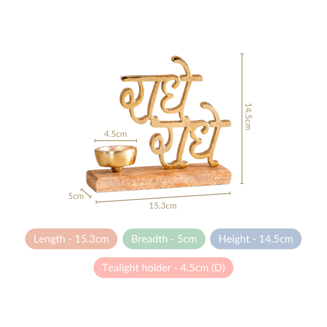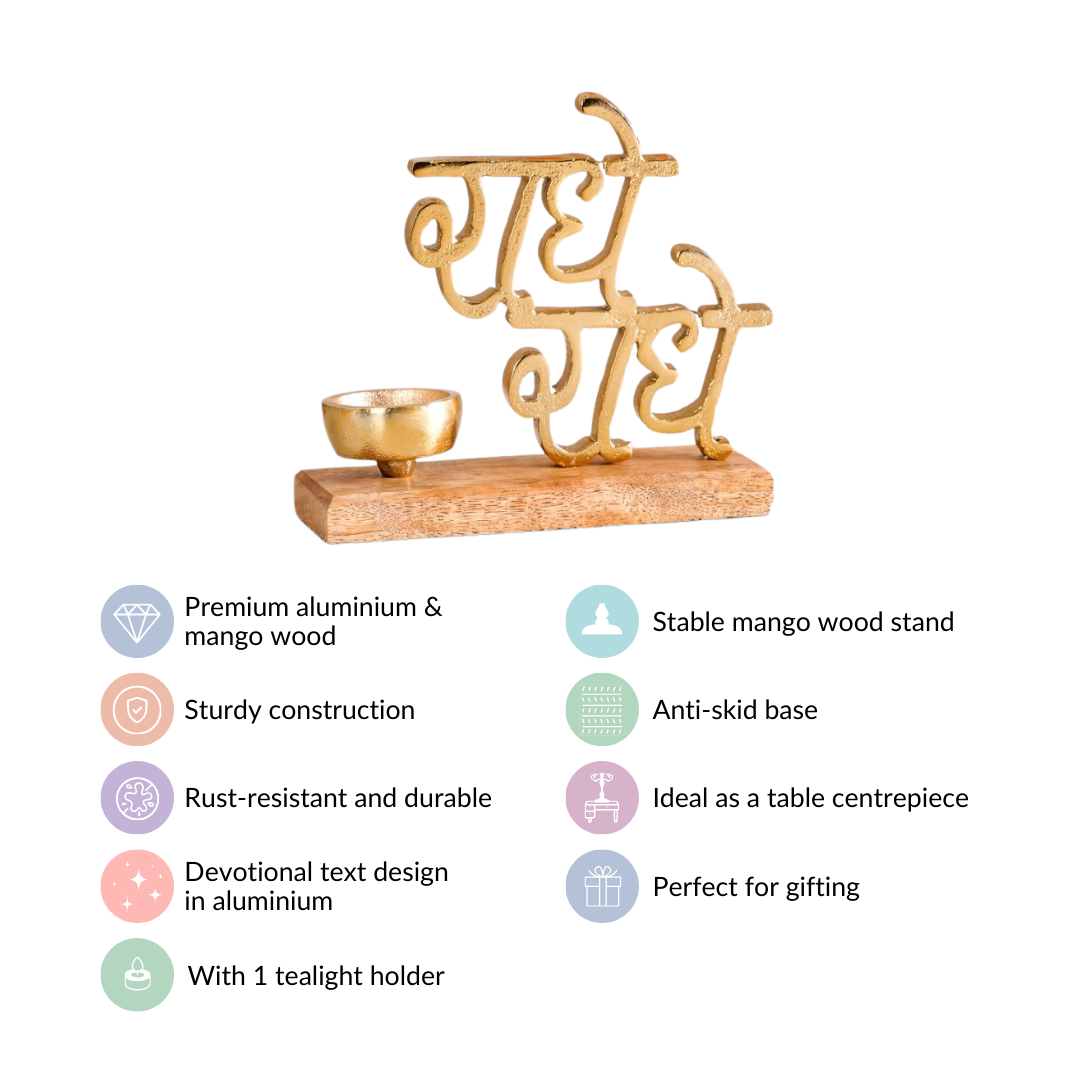 Yes, the decor item features a devotional text design in aluminium, adding a spiritual touch to your space. Additionally, the anti-skid base ensures stability, while the included tealight holder adds ambience to your setting