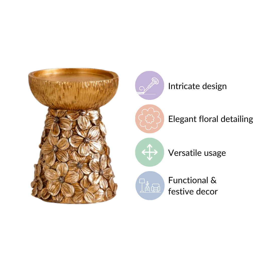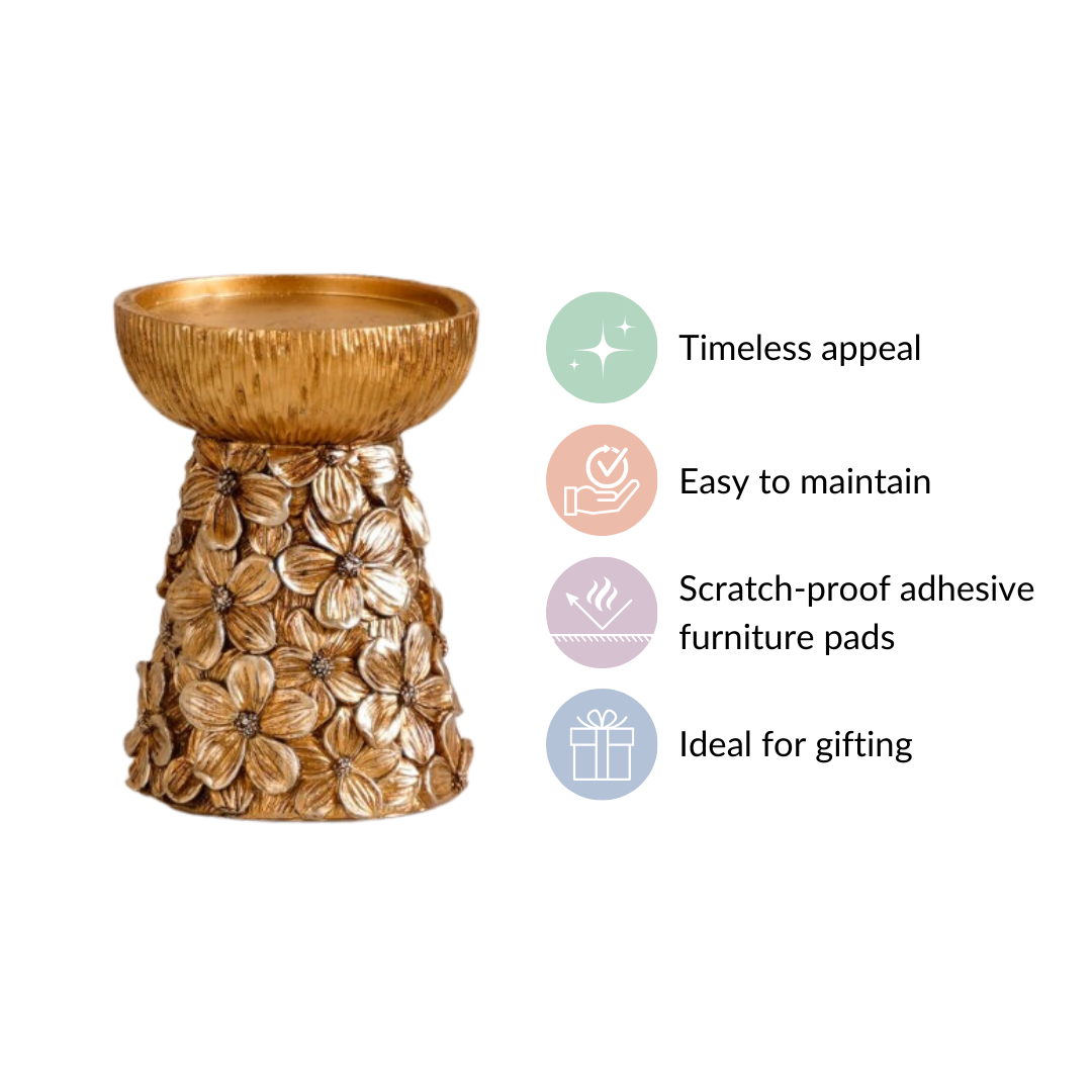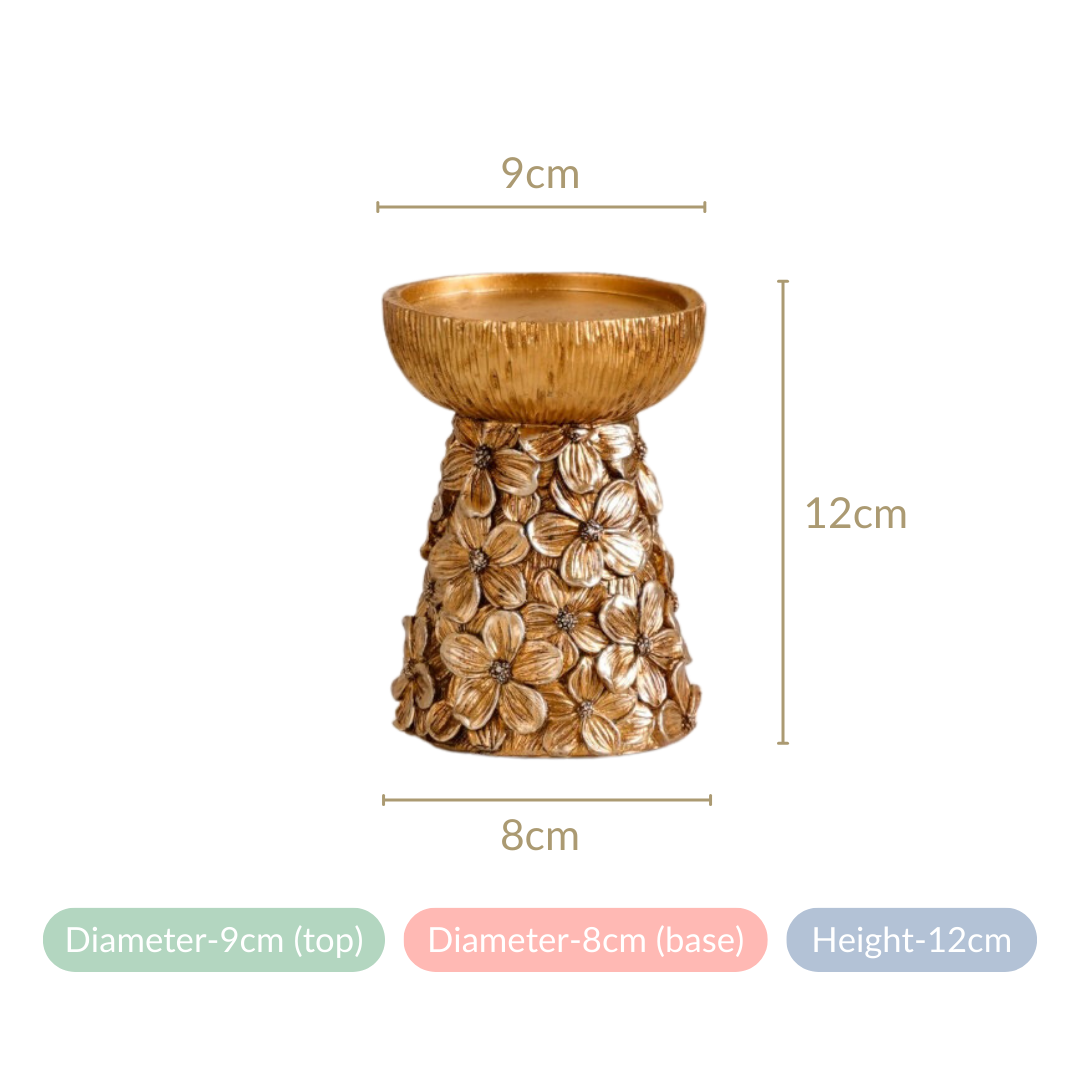 Discover the enchanting allure of the candle stand, a captivating centrepiece that harmoniously fuses elegance and the beauty of nature. This stand showcases intricate floral detailing, exuding a timeless sense of beauty. Its golden hue adds an opulent touch, while the durable resin material ensures lasting quality. Elevate any space, whether it's your cozy abode or a mesmerizing event, with the gentle glow this candle stand emanates. The ornate design creates captivating shadows, turning your surroundings into a work of art.