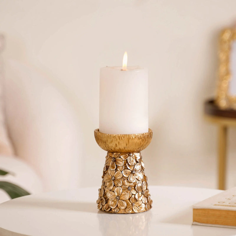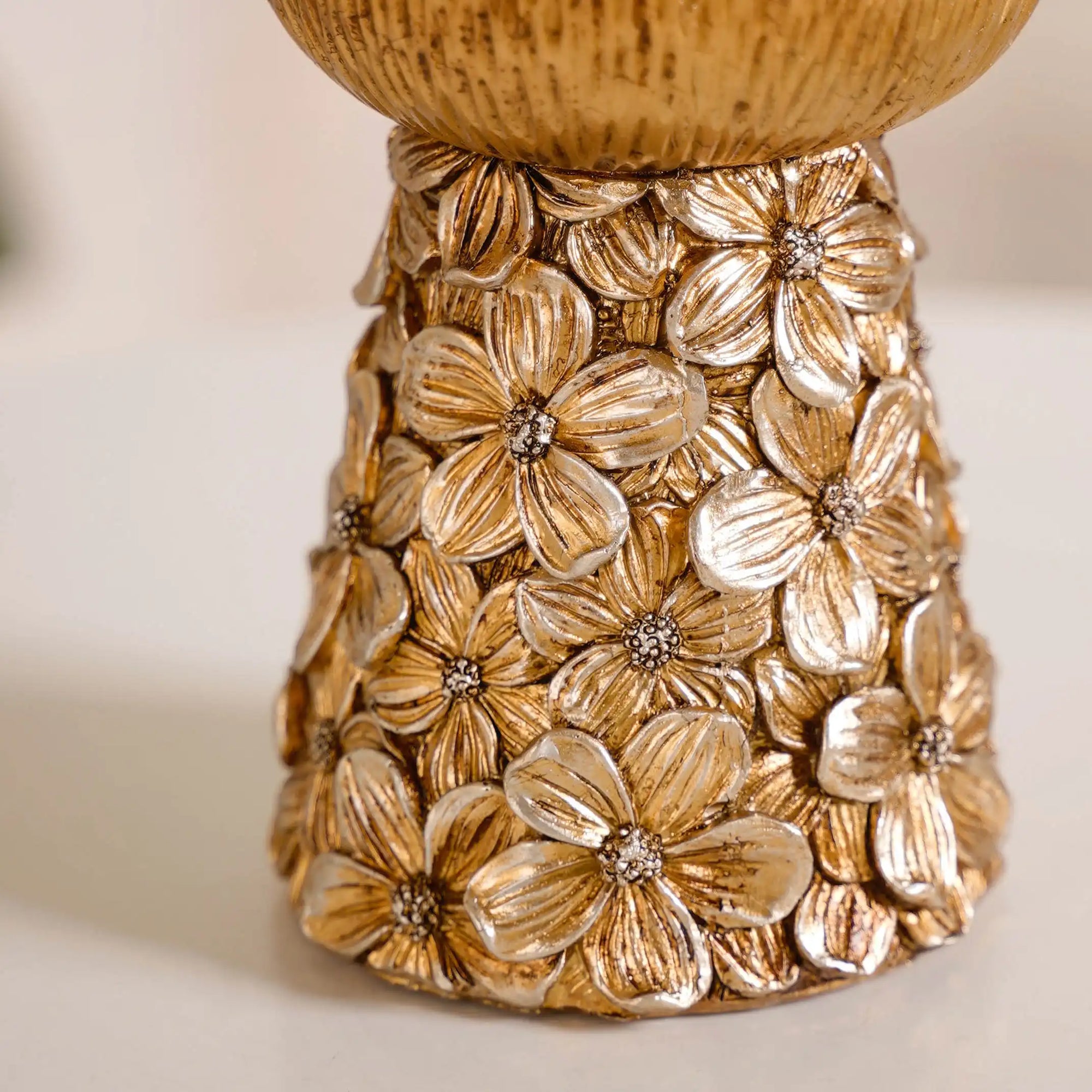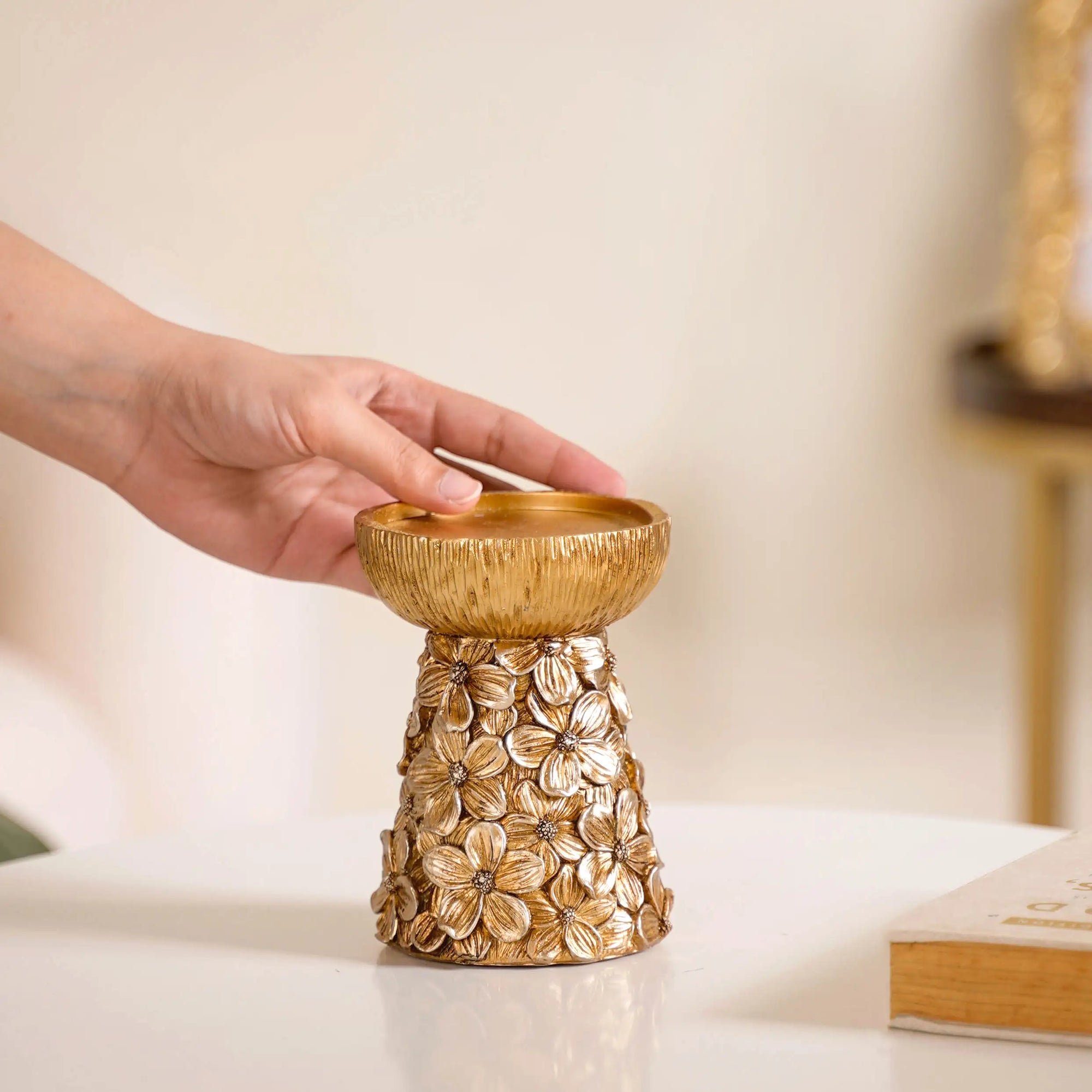 Discover the enchanting allure of the candle stand, a captivating centrepiece that harmoniously fuses elegance and the beauty of nature. This stand showcases intricate floral detailing, exuding a timeless sense of beauty. Its golden hue adds an opulent touch, while the durable resin material ensures lasting quality. Elevate any space, whether it's your cozy abode or a mesmerizing event, with the gentle glow this candle stand emanates. The ornate design creates captivating shadows, turning your surroundings into a work of art.