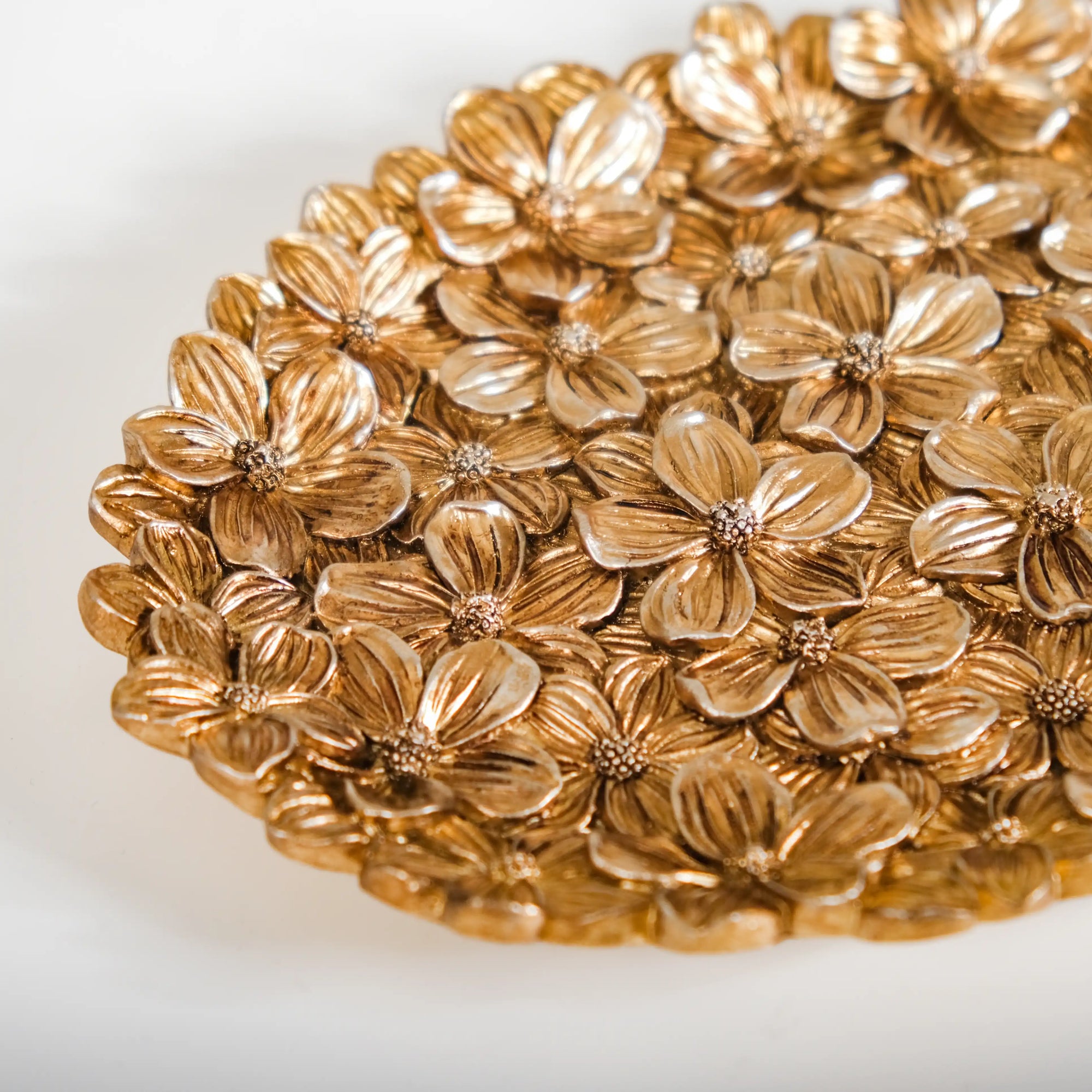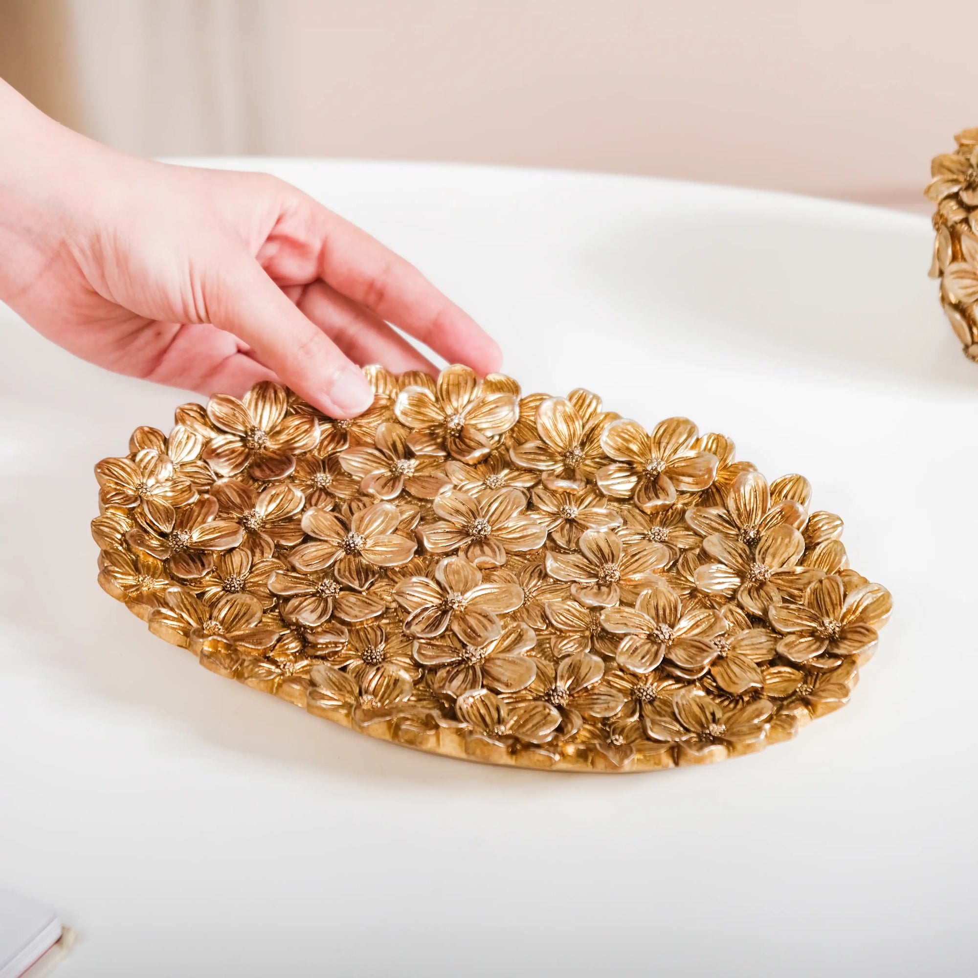 The golden platter is an ideal choice for showcasing collectibles and decorative figurines. Its opulent design and spacious surface provide a captivating backdrop that enhances the visual appeal of your cherished items. The textured golden flowers and exceptional detailing of the platter's design add a touch of luxury and sophistication to the display, making it a remarkable focal point for your collectibles or figurines collection. Whether displayed on a shelf, mantel, or side table, the platter elevates your treasures while exuding an air of elegance and artistry.
