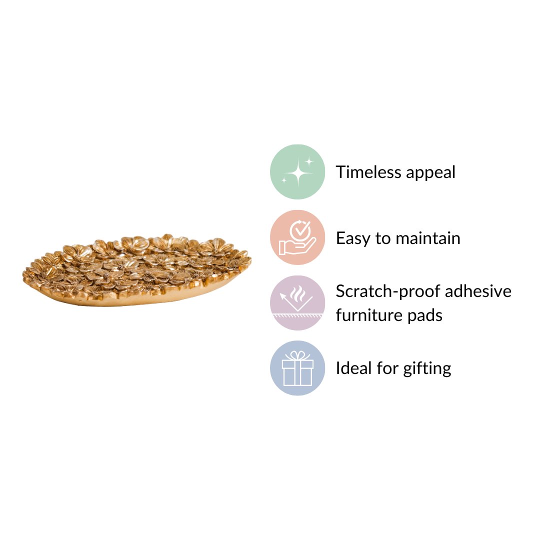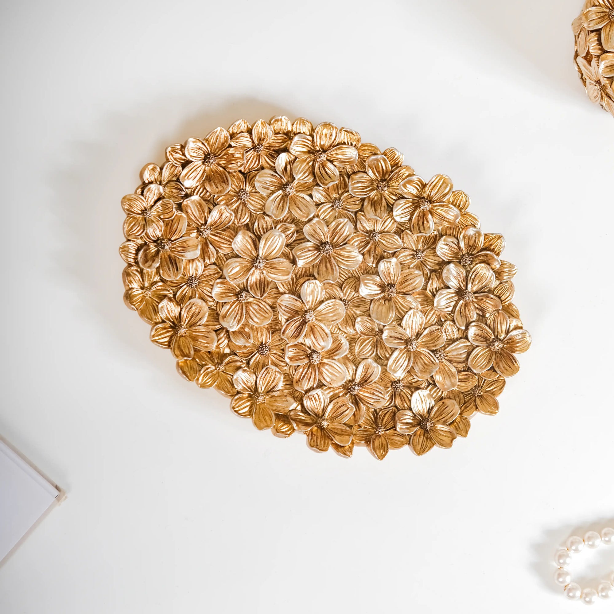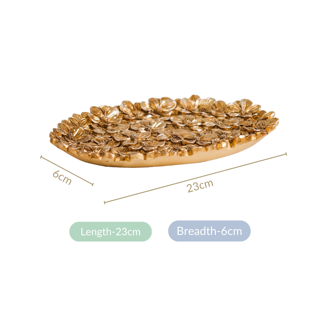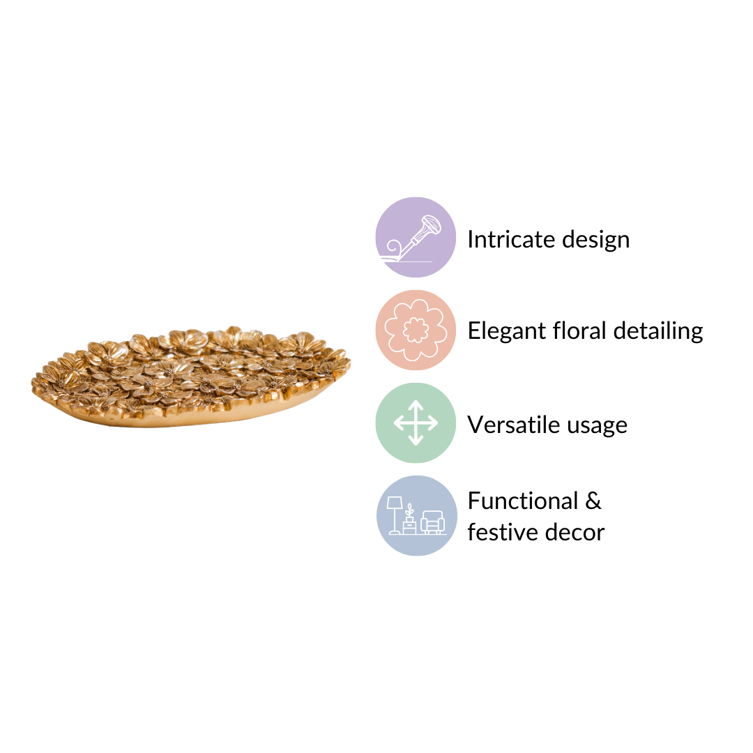 Elevate your home decor with the touch of opulence and sophistication offered by our exquisite decorative golden platter. Meticulously crafted from premium resin, this stunning platter showcases a captivating array of textured golden flowers, each meticulously detailed. The intricate design transforms it into a true masterpiece, effortlessly commanding attention in any setting. Whether gracing a dining table, coffee table, or shelf, this platter becomes the focal point, radiating elegance and allure. Its luxurious golden hue imparts a sense of richness, while the textured flowers infuse depth and visual intrigue.