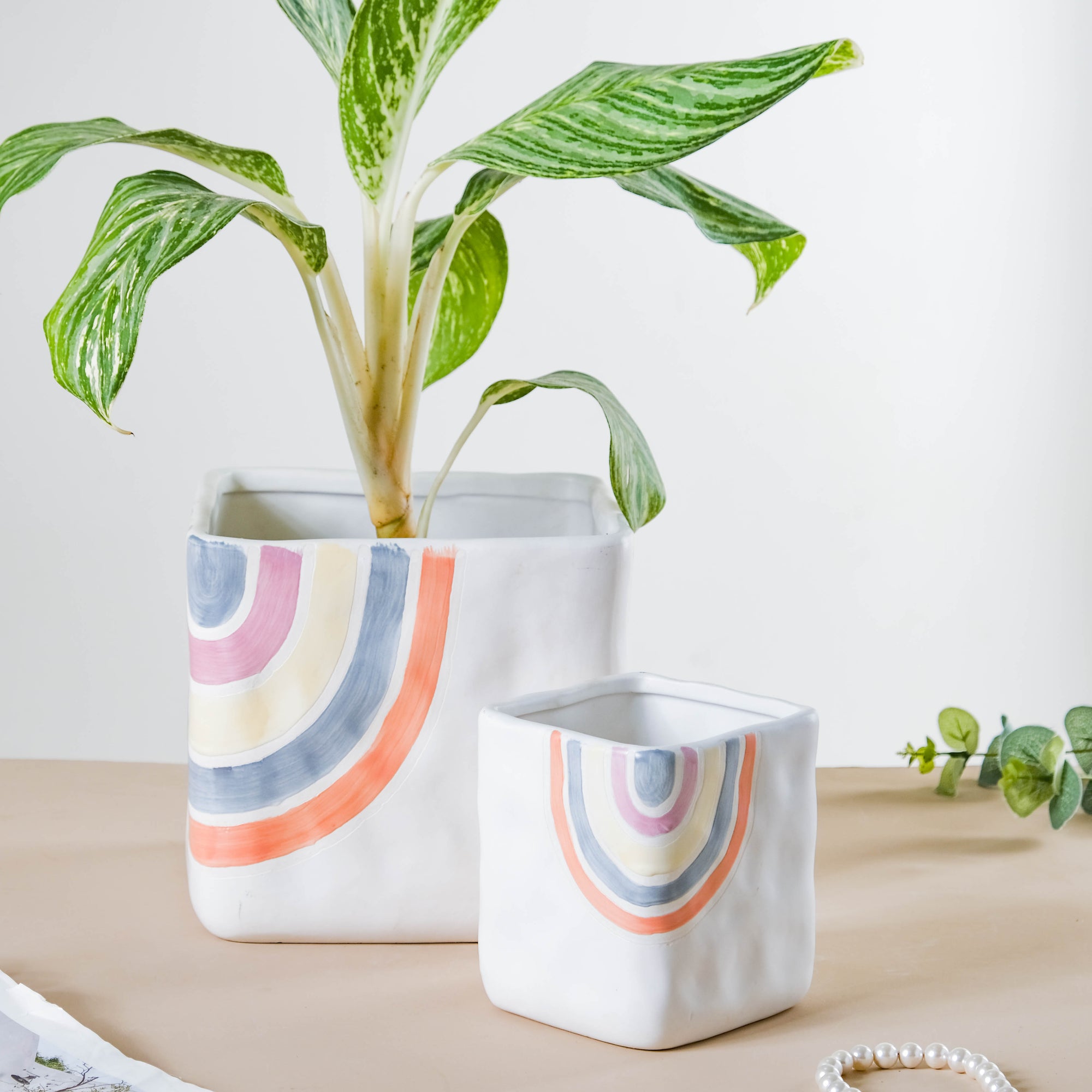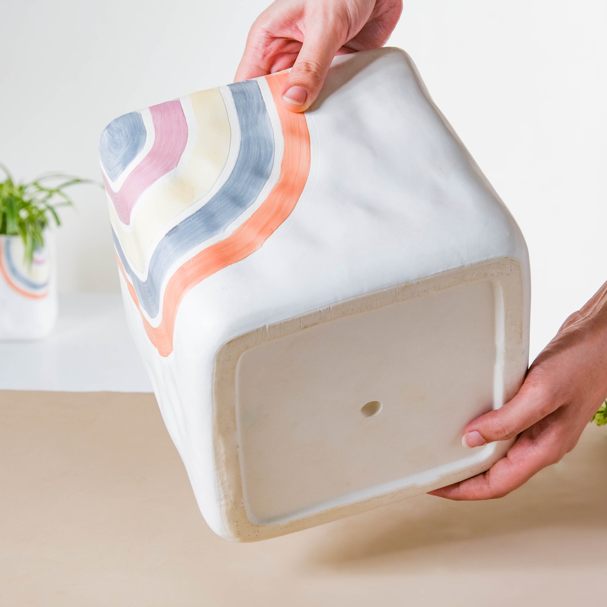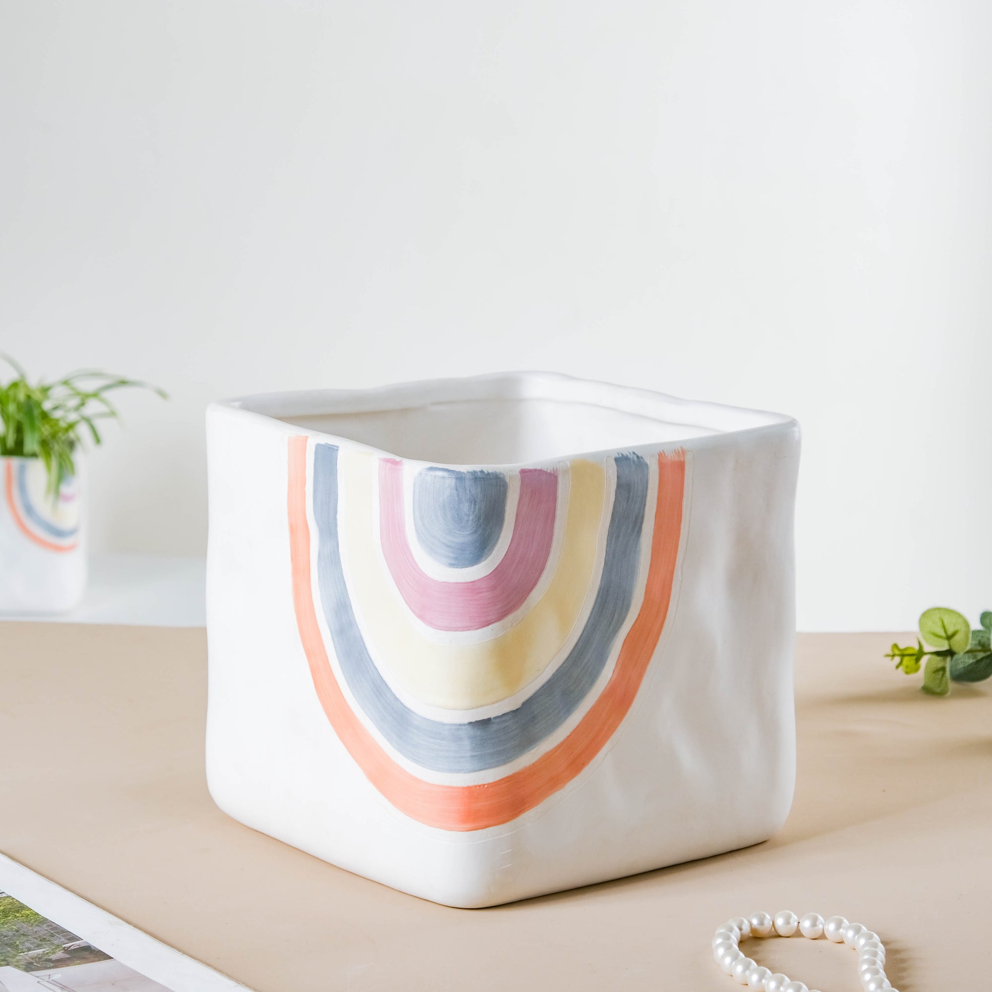 The large square-shaped pot will usher in vibrancy and exclusivity to the space where it is kept. The multicolored curved lines on the edges create a unique design on the pot, thus making it a conversation starter in a room full of guests. Adorn the ceramic plant vases with ornamental flower stems or fresh plants to amp up the ambiance. Dive into the rich saga of floral arrangements in minimalist decor with this white ceramic pot. Place the lightly textured pot on the console table, coffee table, or center of the dining table to amp up the decor. Nestip: Use the large-sized ceramic pot to hide plug points on the kitchen walls. Size: 20cm B x 20cm L x 18cm H Colour: White, pink, yellow, blue, and orange Material: Ceramic Products Included: 1 plant pot Style: CHTC63V33