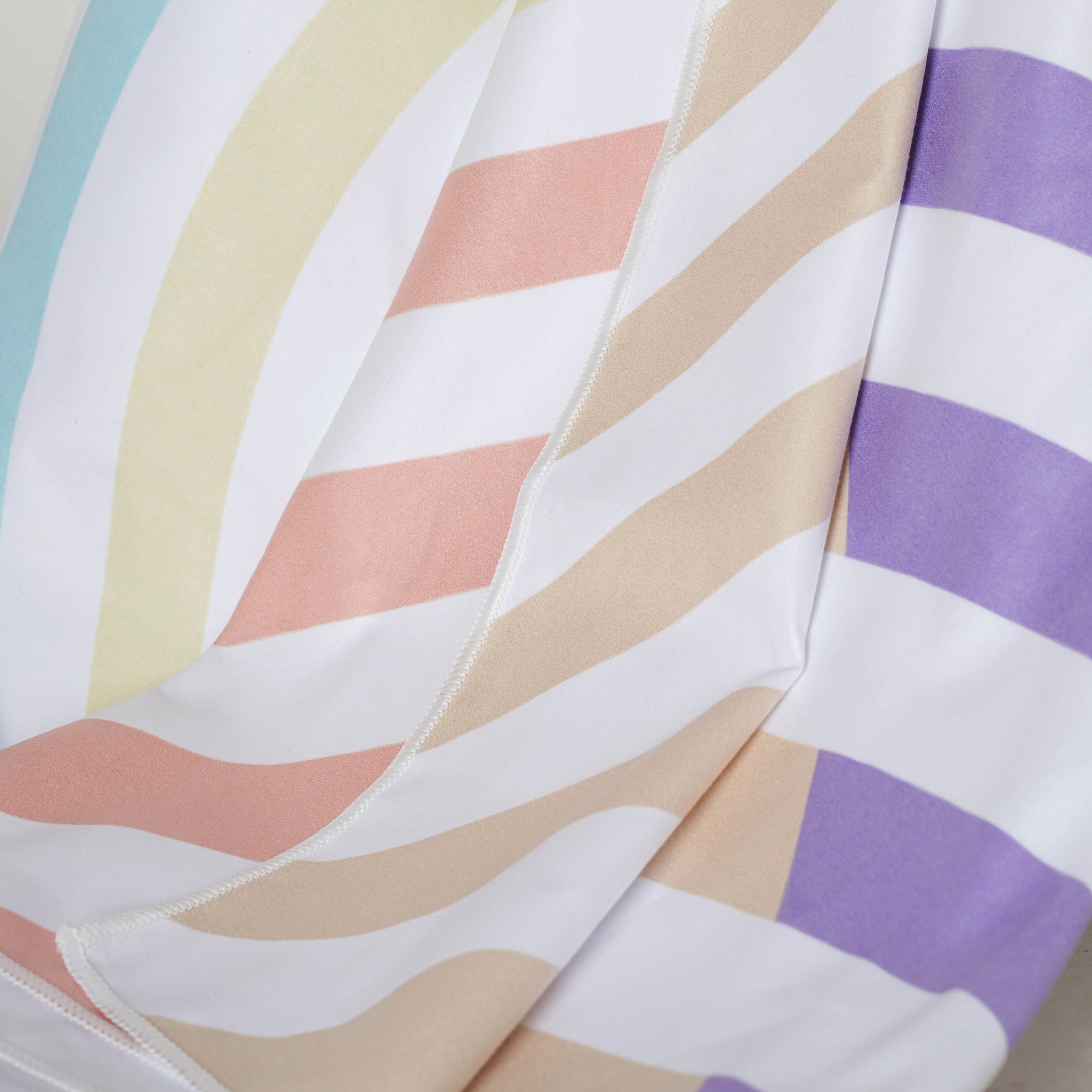 The multicolor bath towel is available in rainbow stripes. Super comfortable, thin and soft, the bathroom towel is sure to brighten up any washroom it is placed in. The bath towel absorbs water quickly and dries at a fast pace, making it really efficient to use.
