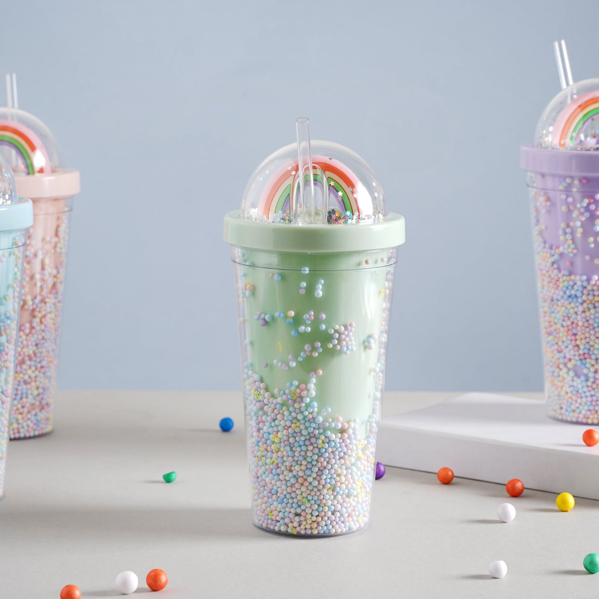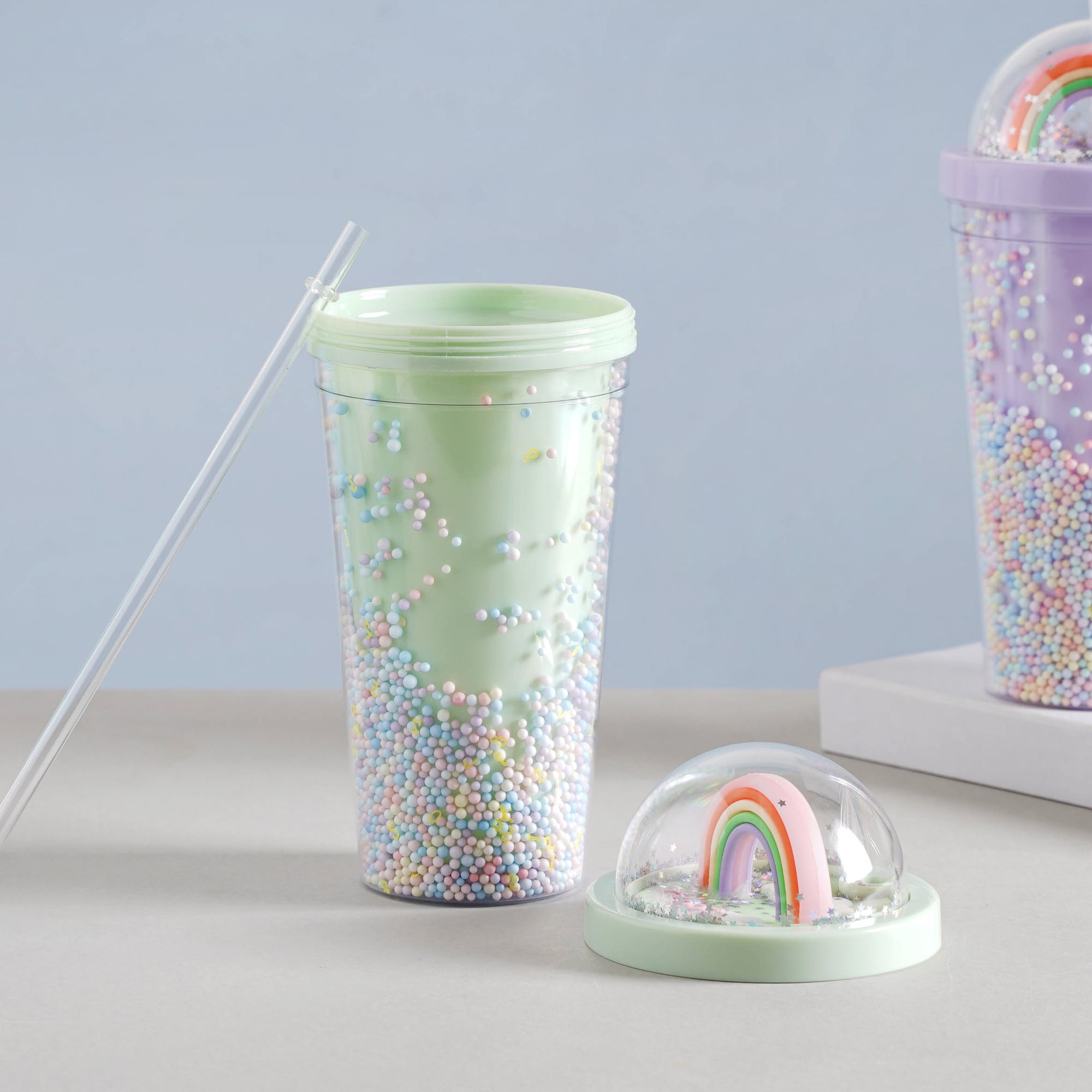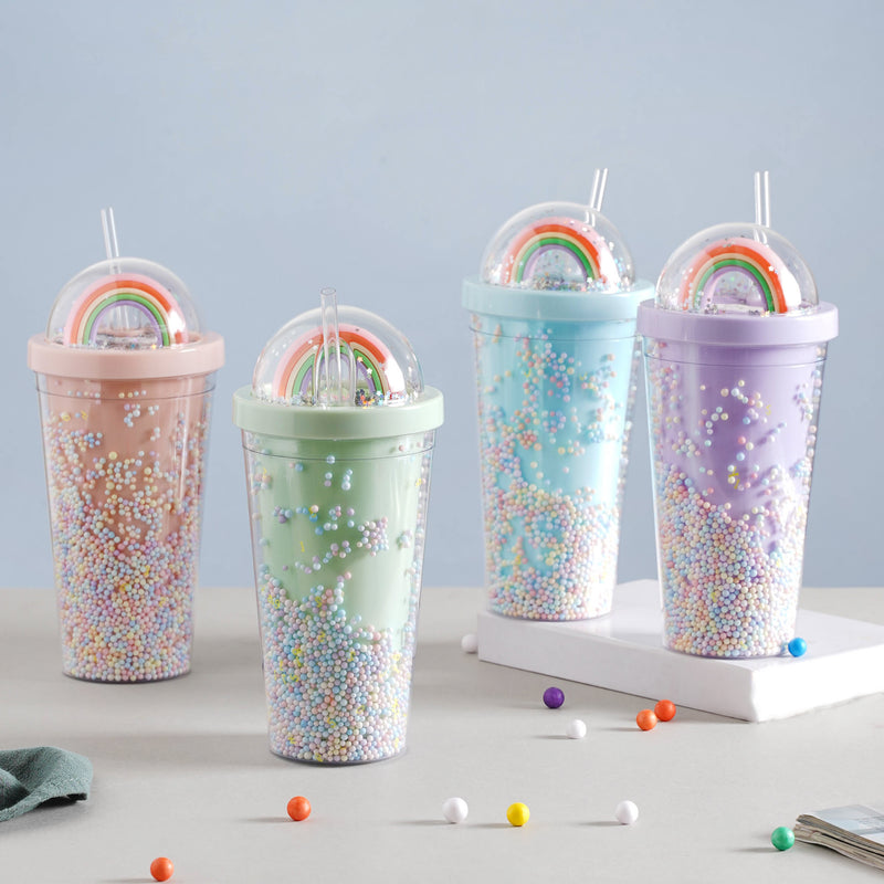 The rainbow tumbler is a colourful and useful accessory that is sure to catch the eye. It comes with a straw and lid which prevents spillage and provides ease of consumption when you're carrying it on the go. It'll make shake time (or any beverage time for that matter) ten times more enjoyable! This bottle is perfect for folks on the go with their smoothies, juices, or plain old water because of its easy-to-carry quality and sufficient volume. With its artful design and lid-to-base pastel shimmer, this is a great gift for both youngsters and adults.