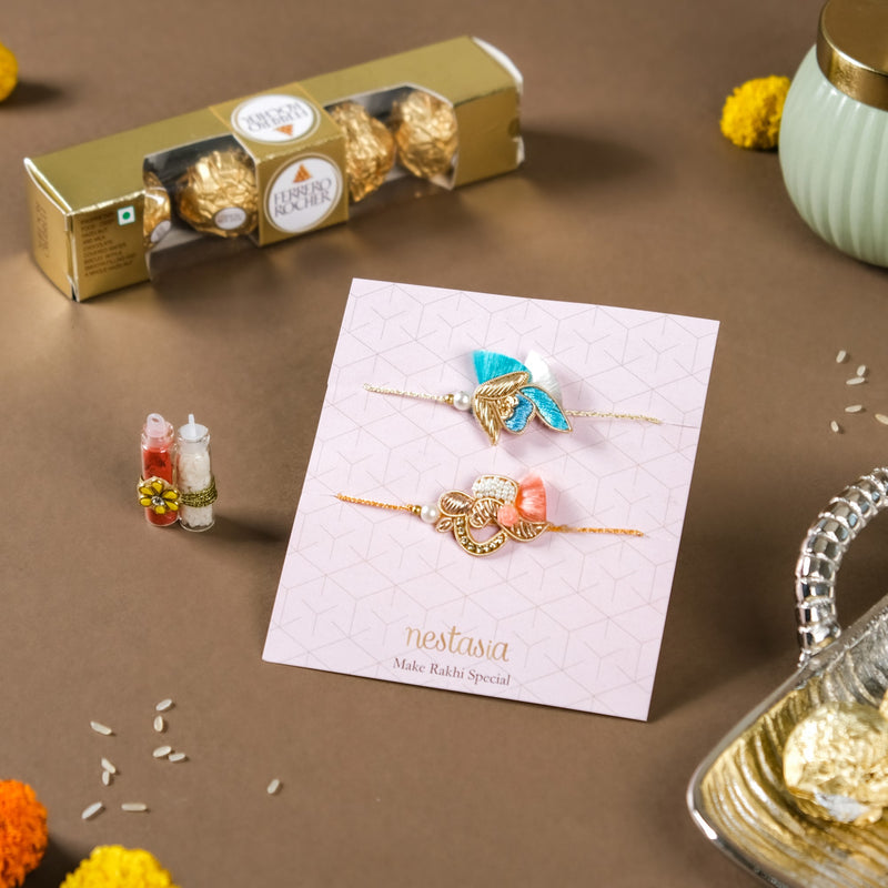 Introducing our delightful Rakhi hamper, specially curated to celebrate the joyous occasion of Raksha Bandhan. This carefully designed Rakhi hamper is packed with thoughtfully chosen products like a set of one peach and one blue-coloured rakhi, representing the beautiful bond between brothers and sisters. To complete the traditional rituals of Raksha Bandhan, we have included a roli-chawal bottle set in this Rakhi hamper. This gift set for Rakhi contains essential components such as roli (vermilion) and chawal (rice grains), ensuring that you have everything you need for the sacred ceremony. Indulge your taste buds with the inclusion of a pack of Ferrero Rocher chocolates in this exquisite Rakhi hamper.