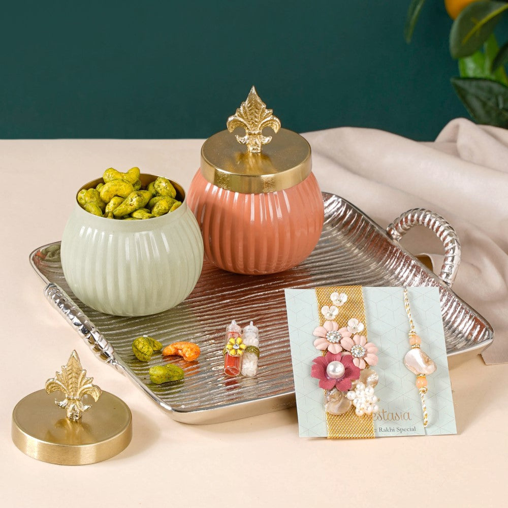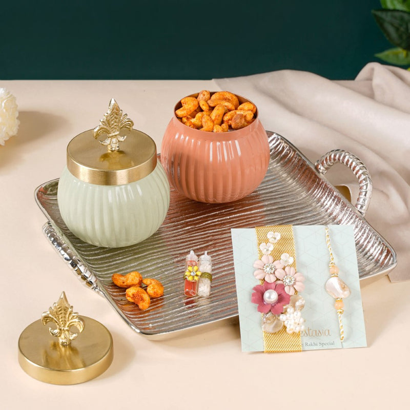 Our exquisite Rakhi Gift Hamper is a perfect expression of love and affection for your beloved brother and sister on the auspicious occasion of Raksha Bandhan. This thoughtfully curated hamper combines elegance, tradition, and delectable flavours to make this celebration truly special. The hamper features a stunning silver tray with handles, exuding timeless charm. Accompanying it are two vintage small metal canisters with lids, adding a touch of vintage allure to any space. The roli and rice bottle set ensures a seamless traditional ritual. For the adornment of your brother and sister-in-law's wrist, the maroon bracelet rakhi set is both stylish and meaningful.
