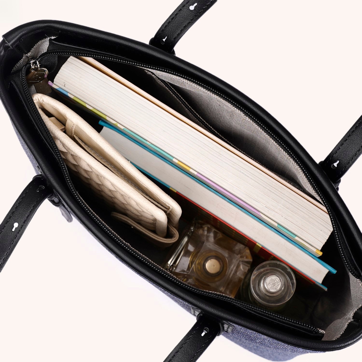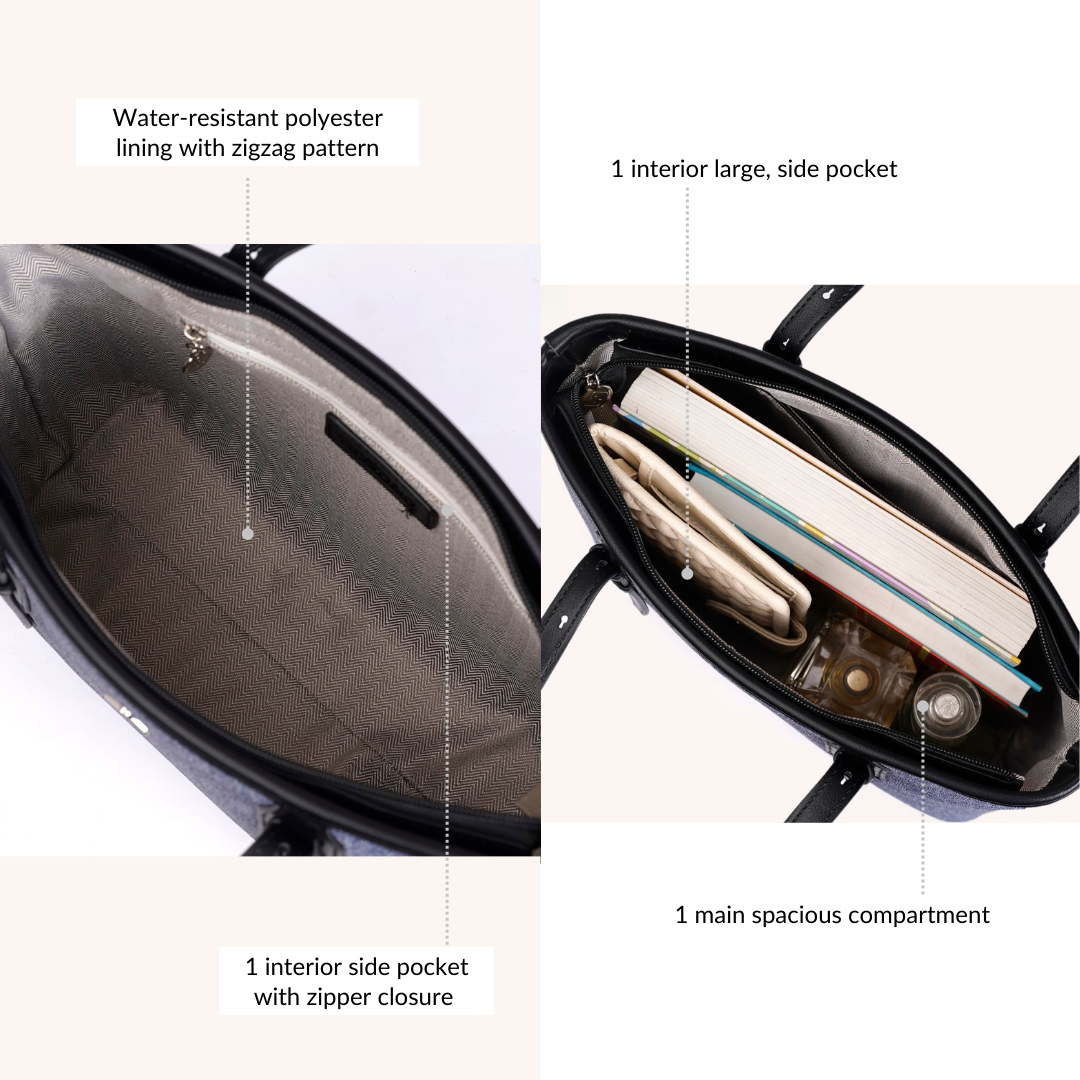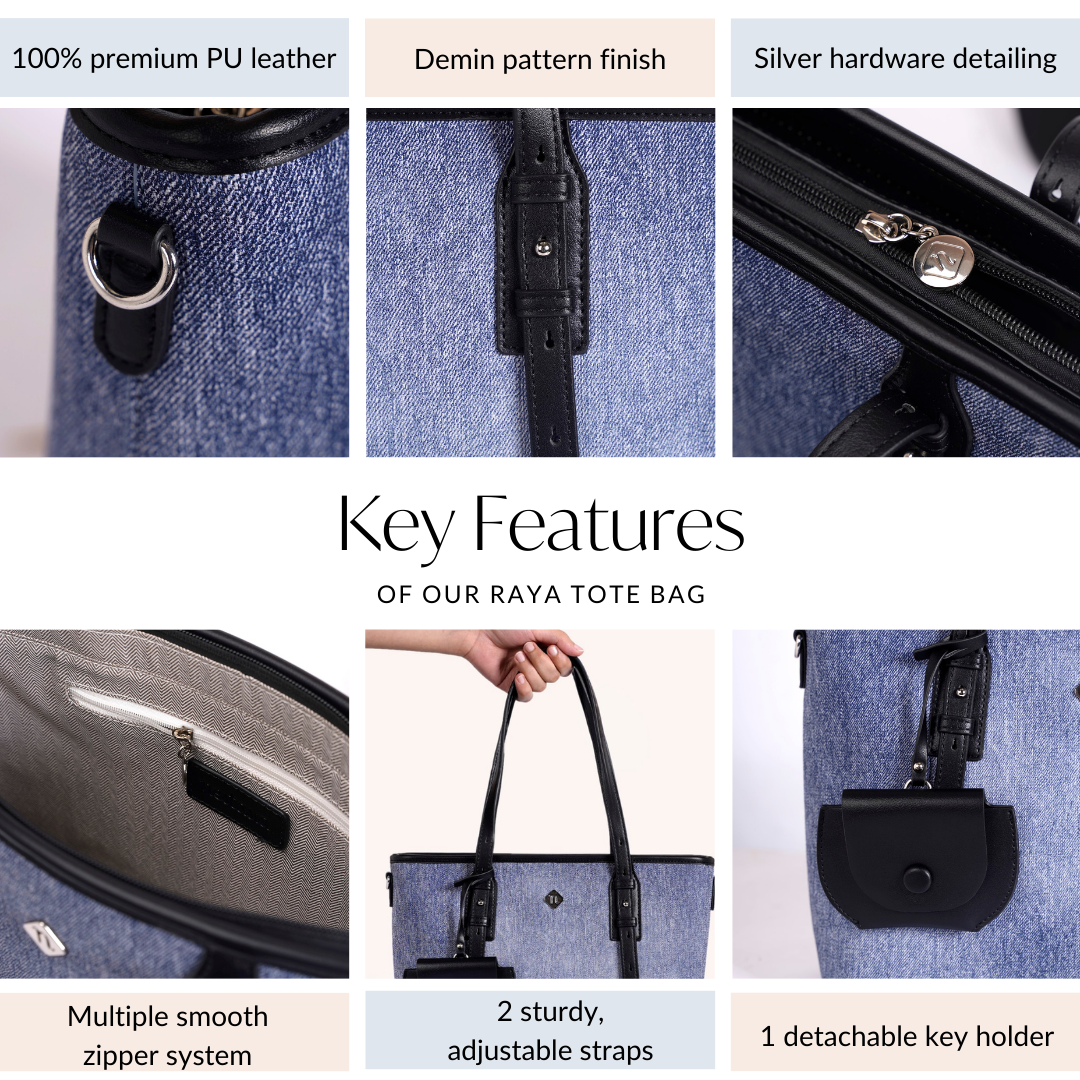 Design: Made from high-quality PU leather, the Raya tote bag features a chic denim pattern finish, adding a relaxed vibe to an otherwise refined look. Its water-resistant polyester lining ensures all your essentials remain protected while the smooth zipper systems keep everything secure. The shoulder bag's interior is as spacious as it gets with a main compartment, a large interior side pocket, and an additional pocket with a zipper closure for extra security. The detachable key holder offers added convenience, and the two sturdy, adjustable straps, along with the adjustable, detachable sling strap, provide versatile carrying options.