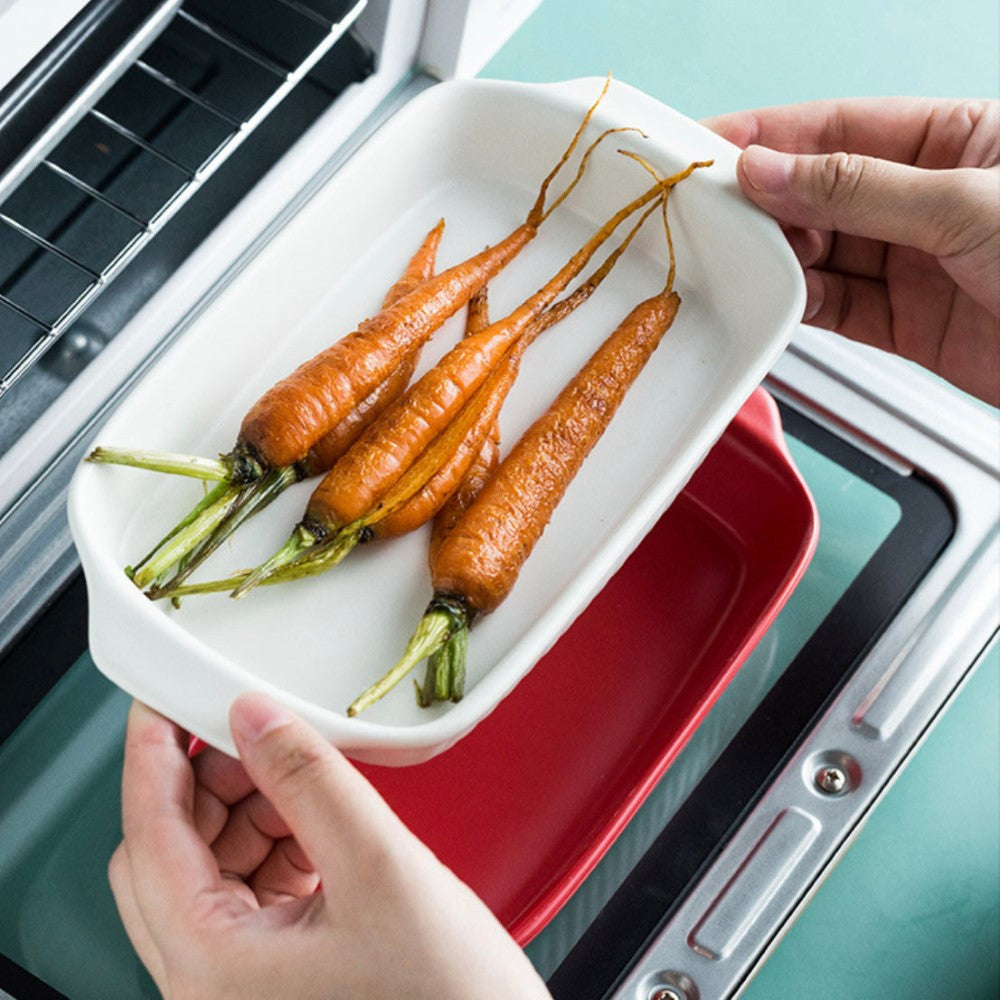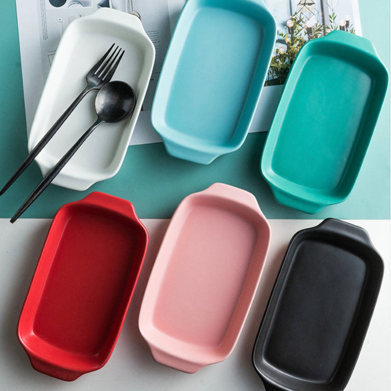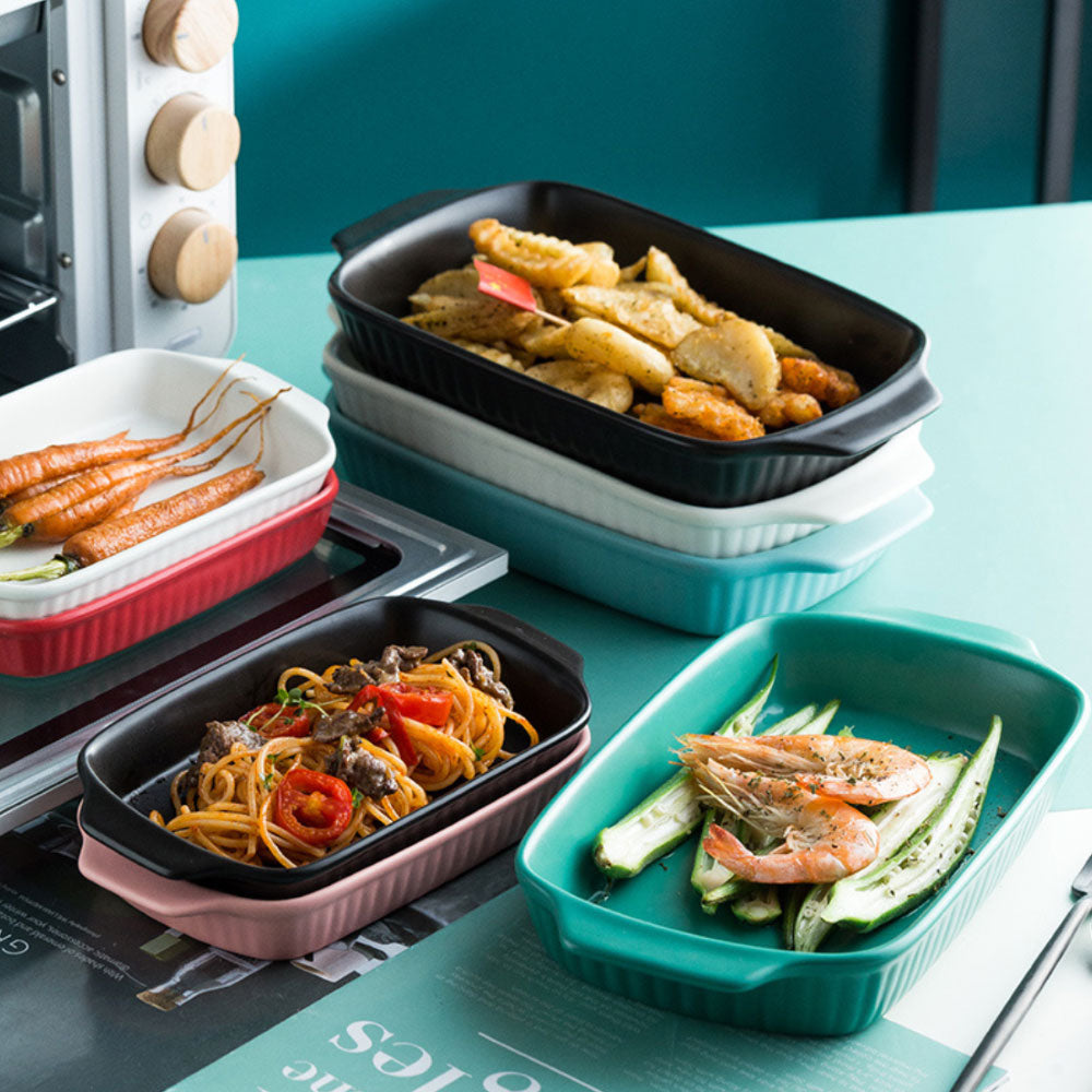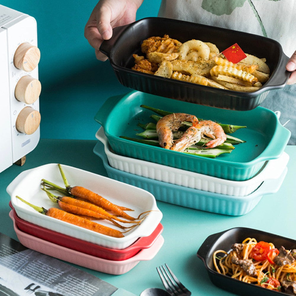 Rectangle baking pans are ceramic baking bowls which can also double up as serving bowls. The baking pans come with handles which make them easy to pick and place. They are apt for being used as fruit bowls, snack bowls, noodle bowls, pasta bowls, and rice bowls. The ceramic bowls are apt for an elevate bake and serve experience. The dishes are oven, microwave and dishwasher safe.