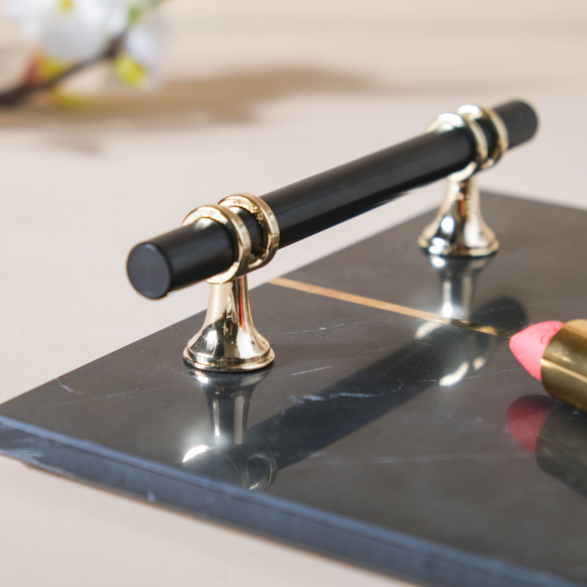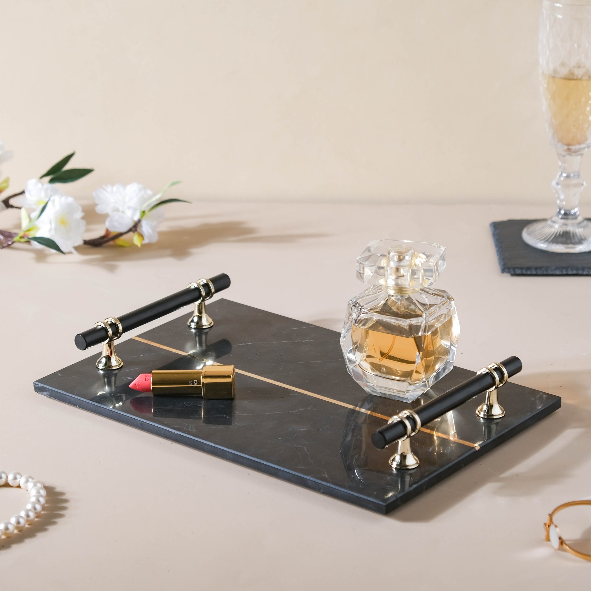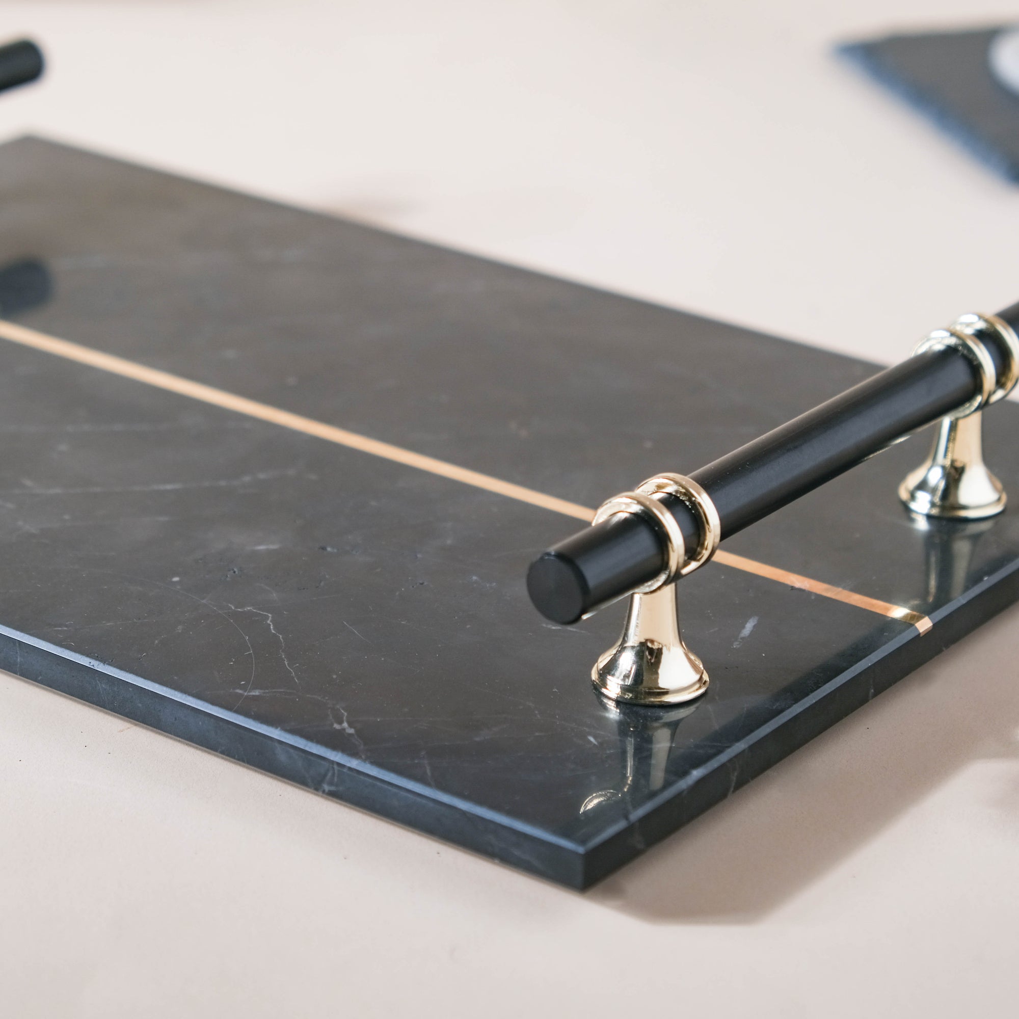 The black and gold minimalistic marble tray with handles is a versatile and modern piece. The elegant tray can brighten up a room as a display plate for perfumes and minimal jewellery. Serve tea or coffee in our White Mug-Plate Set to make a lasting impression.