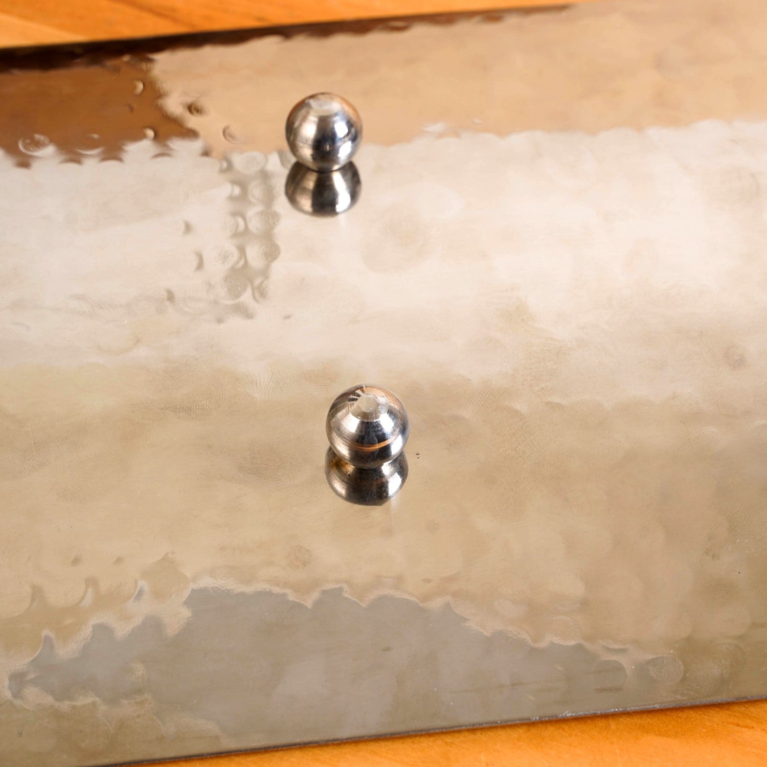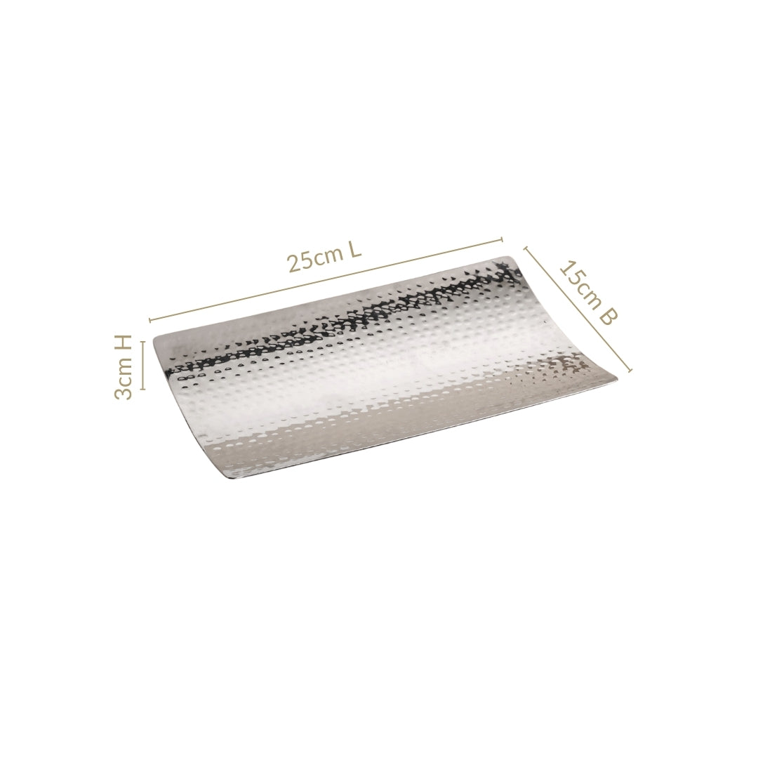 Design: The platter is crafted from stainless steel and shaped in a sleek rectangle with a flat, spacious surface for presenting food. A hammered texture runs across the entire piece, creating a reflective effect that catches the eye. The edges are smooth and polished for safety, while four rounded ball-like stands beneath the platter keep it raised slightly from the table for better balance and presentation. Slightly curved sides keep items secure, and the reflective finish enhances their appearance.