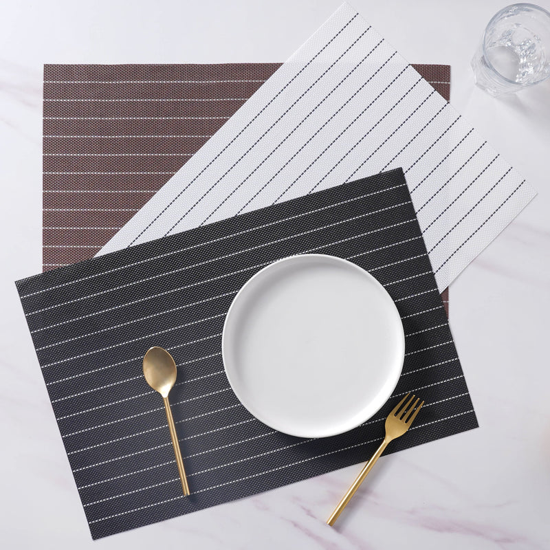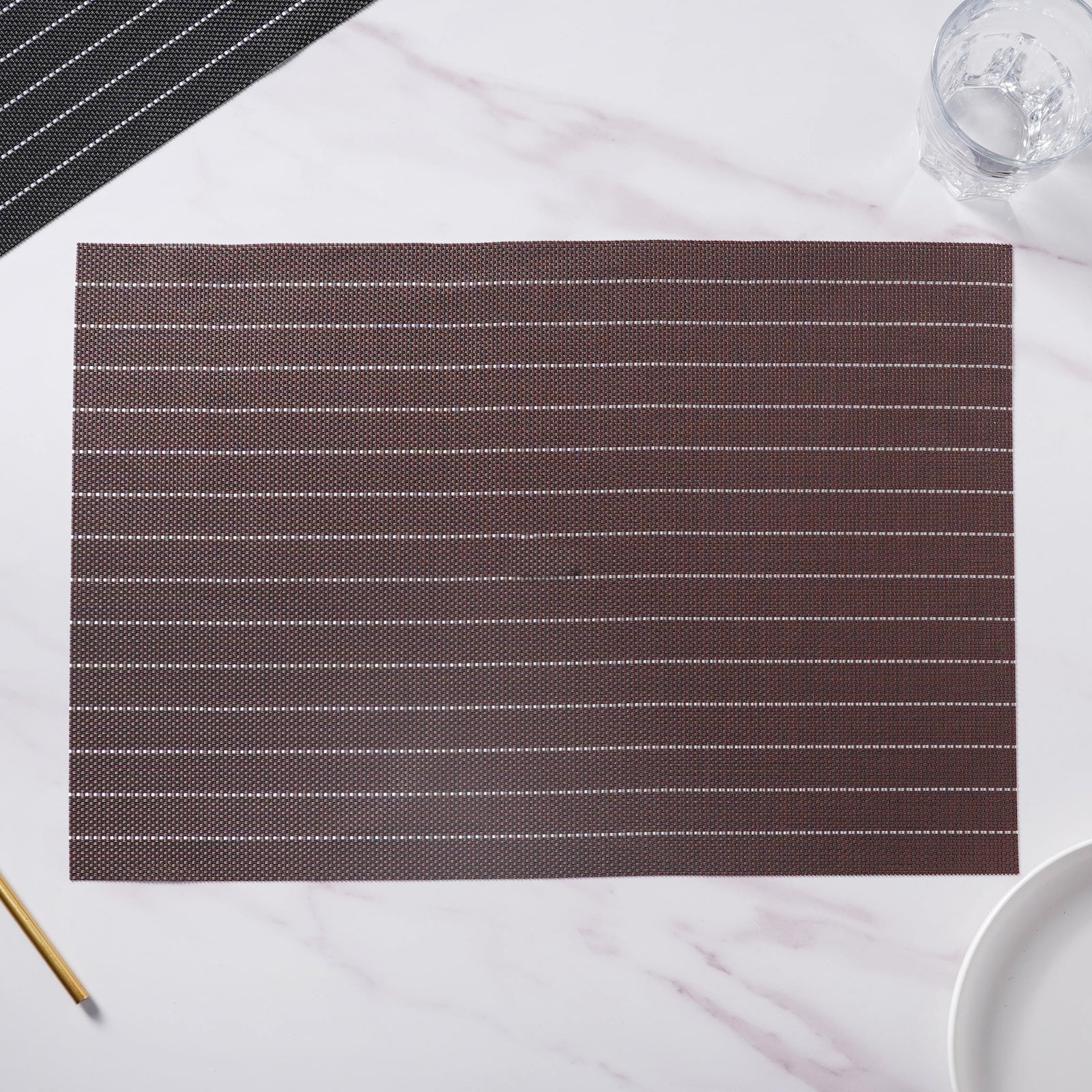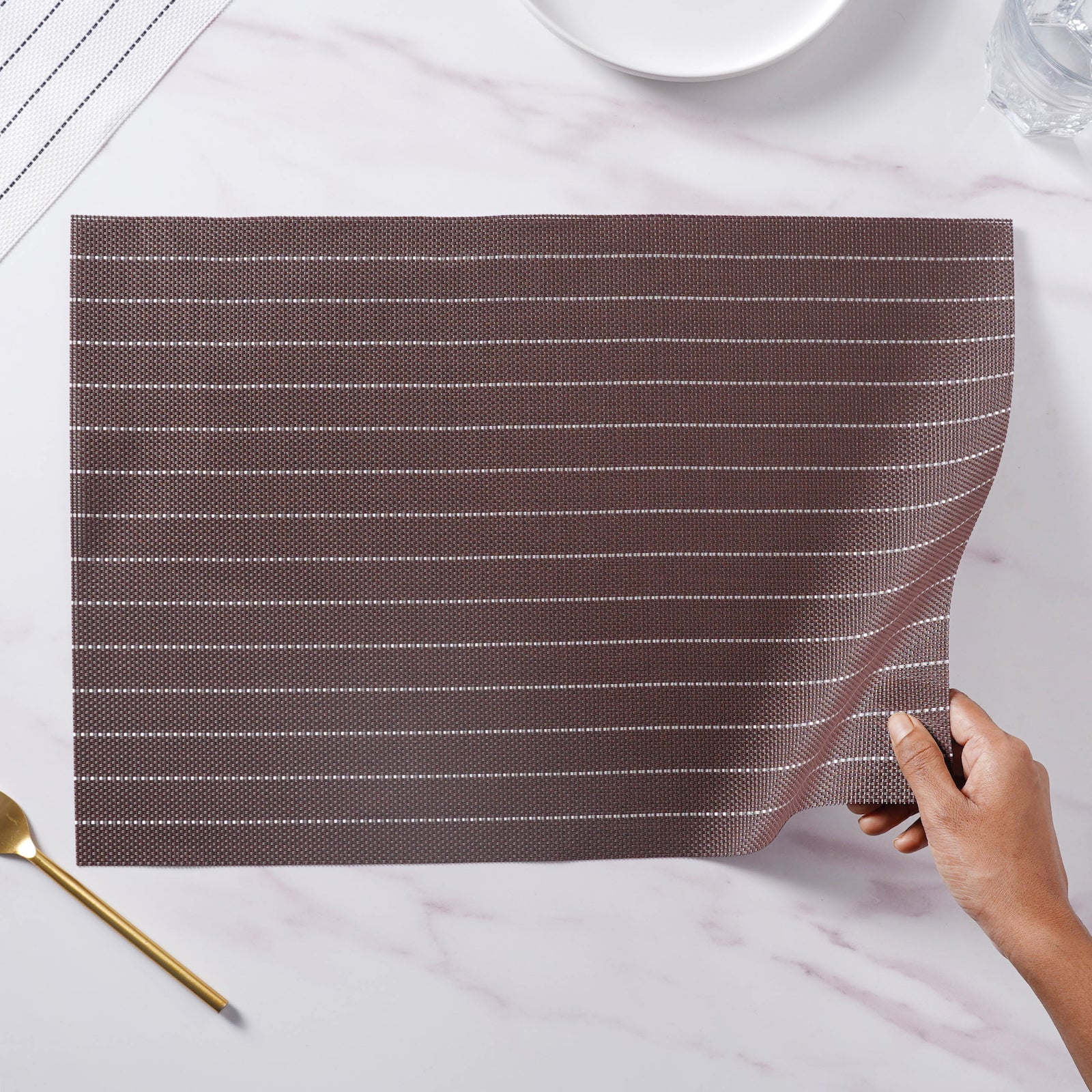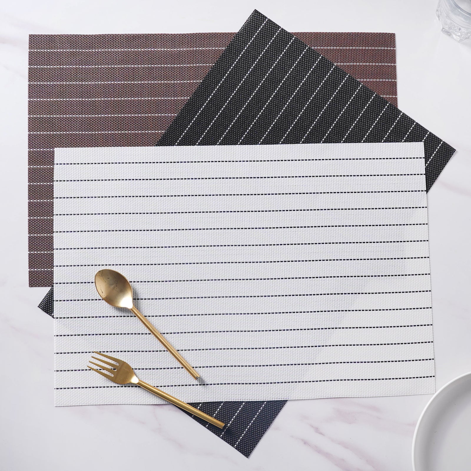 Rectangular table mat or placemat that is available in three colours. The sophisticated hues of the mat and its horizontally striped pattern give the mat an elegant and formal aura. It is effortlessly washable and foldable and can also be rolled and kept in mat rings. The anti-slip surface of the mat allows keeping the cups and glasses in place.
