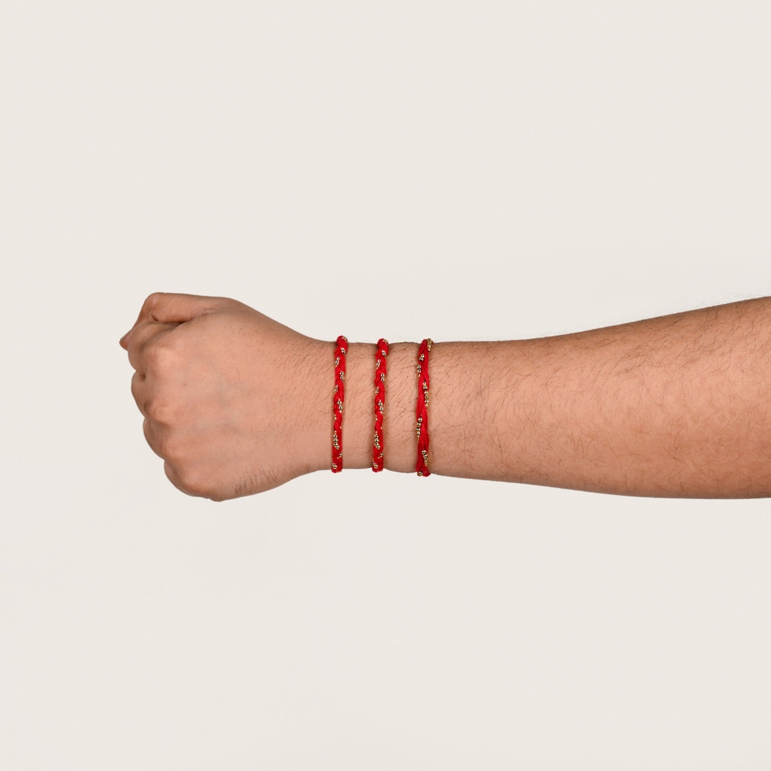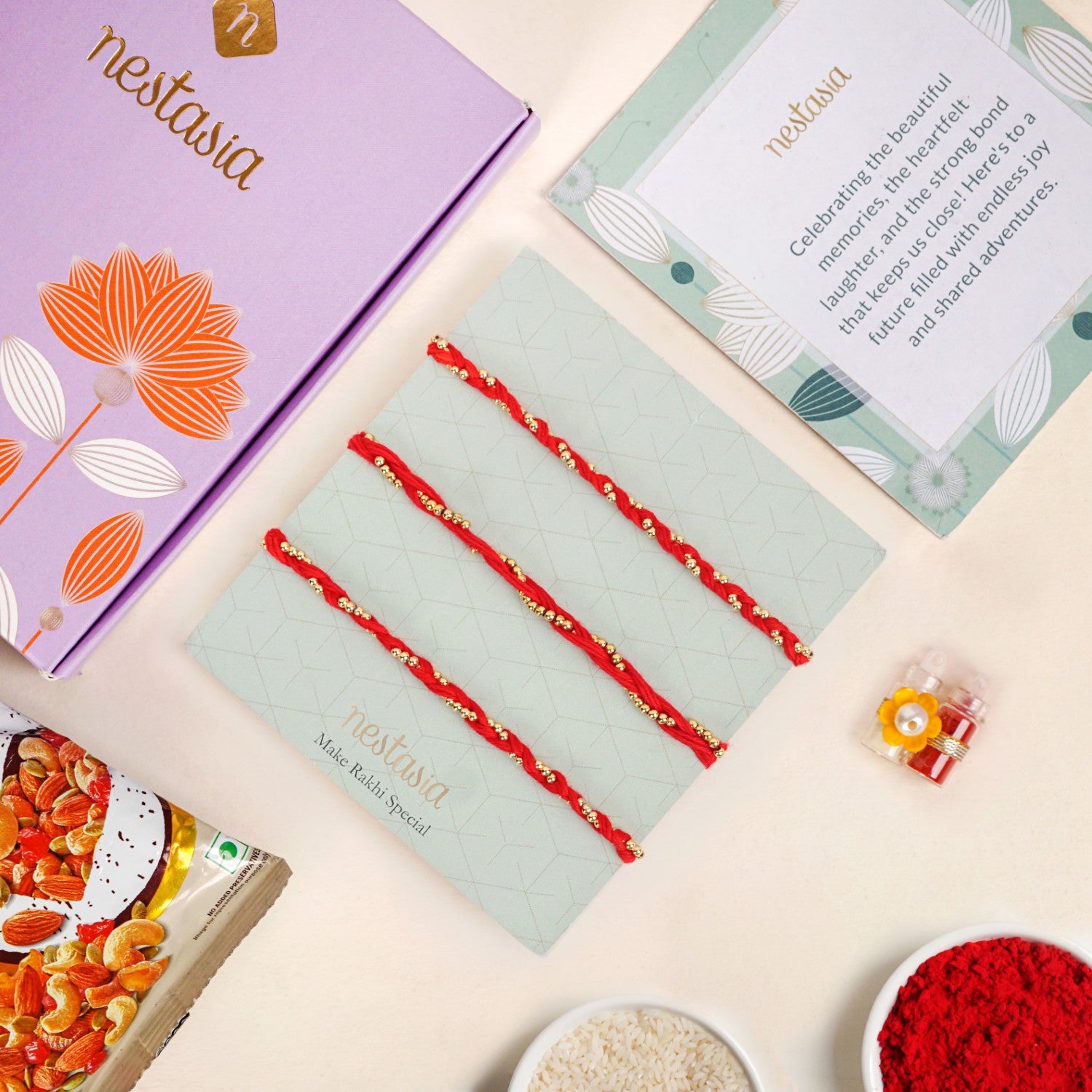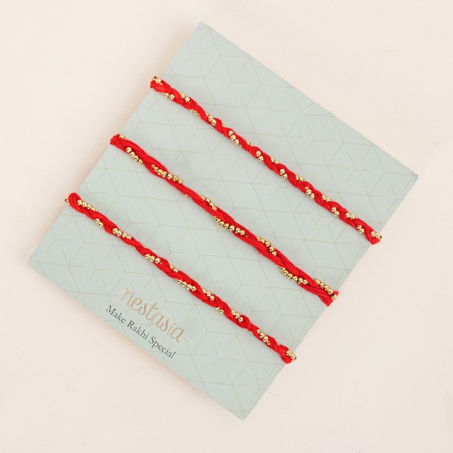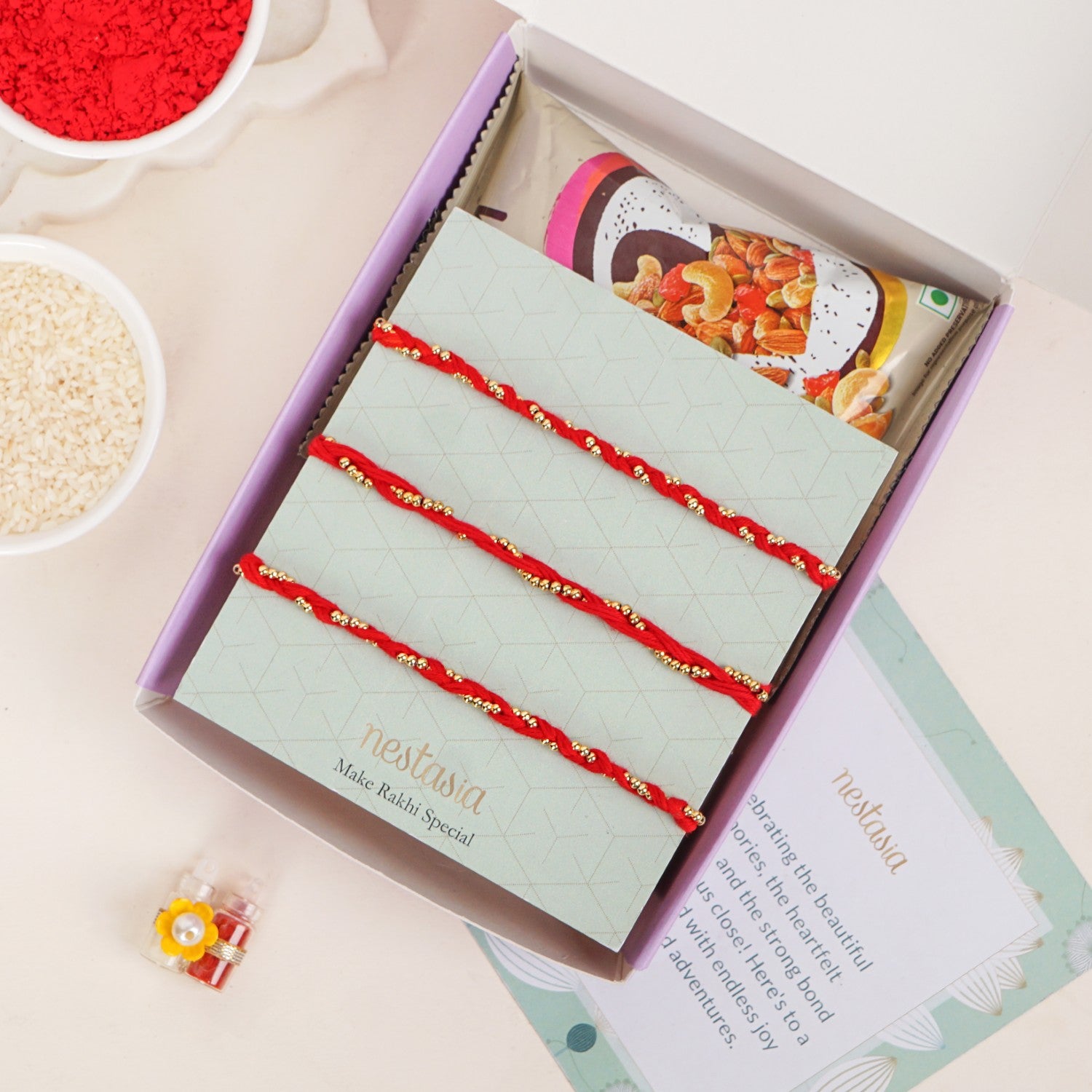 This traditional Rakhi radiates timeless elegance with its rich red and yellow threads braided together and highlighted by delicate golden bead accents. The intertwined strands create a rustic yet refined texture, exuding a warm, festive charm. The golden beads add a touch of shimmer, beautifully complementing the earthy tones of the threadwork. Ideal for those who appreciate minimal yet meaningful design, this Rakhi celebrates tradition in its purest form. Its handcrafted appeal and simplicity make it a perfect expression of sibling love rooted in heritage. The set includes 3 rakhis, 1 roli-chawal bottle, and 1 packet of dry fruits, ensuring a complete and thoughtful festive gift.