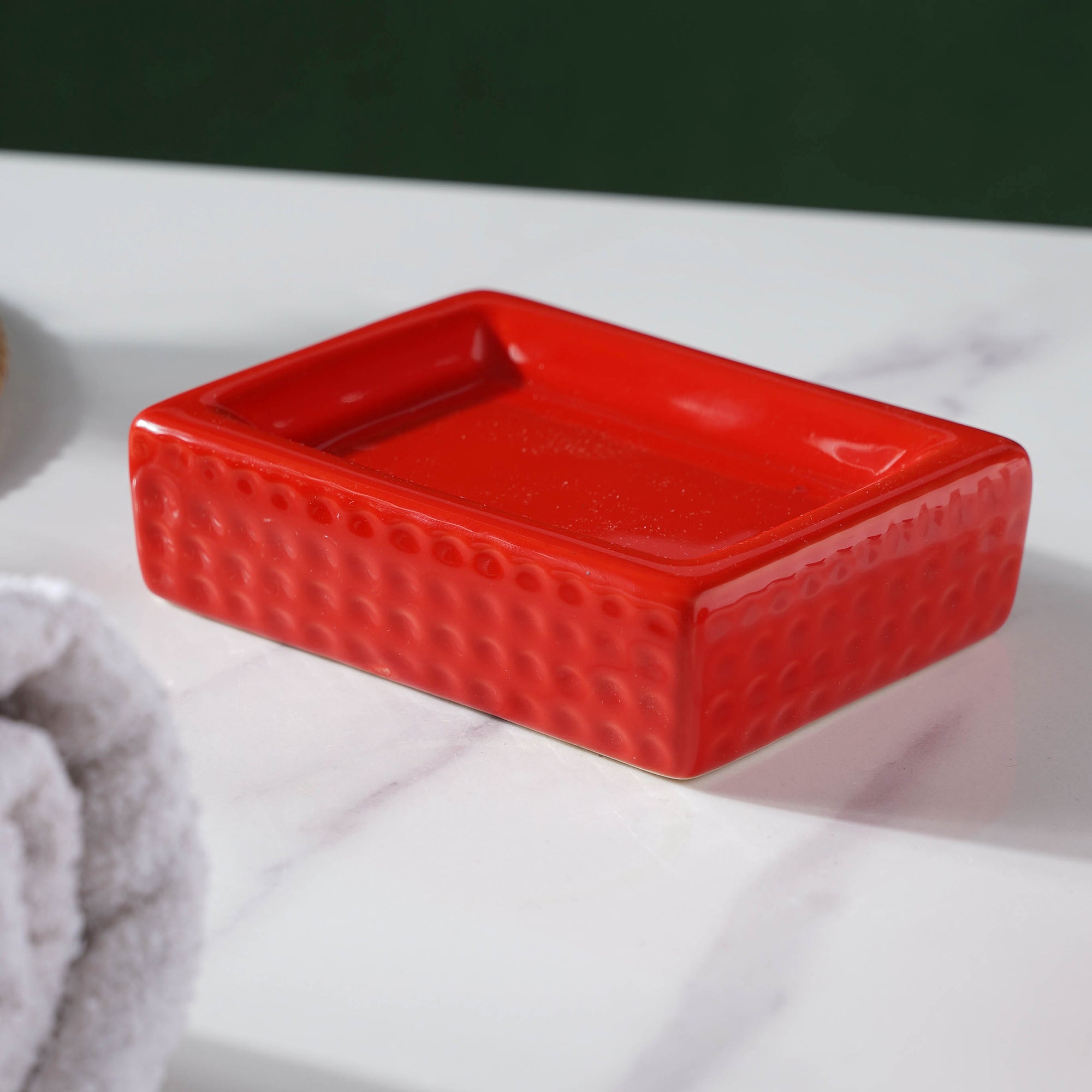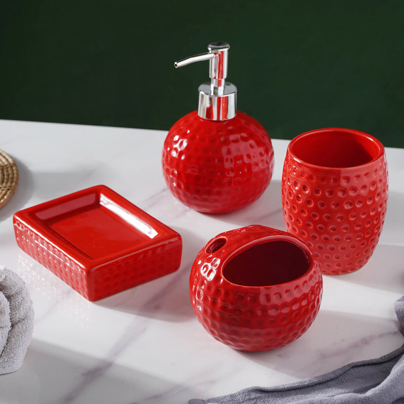 The bright red bathroom set comes with 1 liquid soap dispenser, 1 tumbler, 1 toothbrush stand and 1 soap dish. Place each item with a mind to how it's looking. This will convert any bath space into the cosiest spot to chill in. A bath must be luxurious and energising. Nestip: The bathset can be given as a gift on any occasion Size: Liquid soap dispenser - 10 x 10 x 16 cmTumbler - 8 x 8 x 10 cm Toothbrush holder - 10 x 10 x 9.5 cm Soap dish - 13 x 8 x 2.7 cm Color: Red Material: Ceramic Products included: 1 liquid soap dispenser, 1 tumbler, 1 toothbrush holder, 1 soap dish Style: O15M21O27