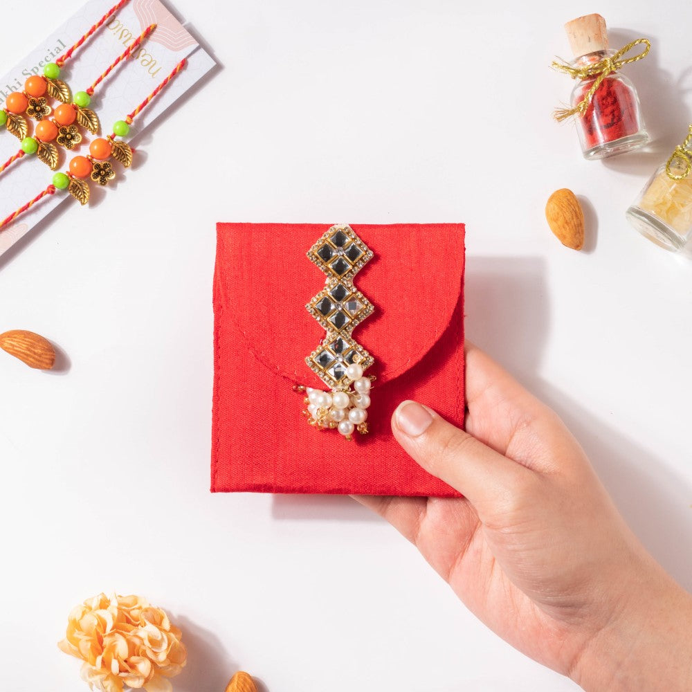 The depth of a brother-sister bond is best described in red. The red-colored rakhi cover is a pouch to store your love, along with a rakhi, and protect the sacred thread from "buri nazar". The envelope is adorned with shining clear crystal decoration to add a spark to the rakhi, as you tie it on Raksha Bandhan.